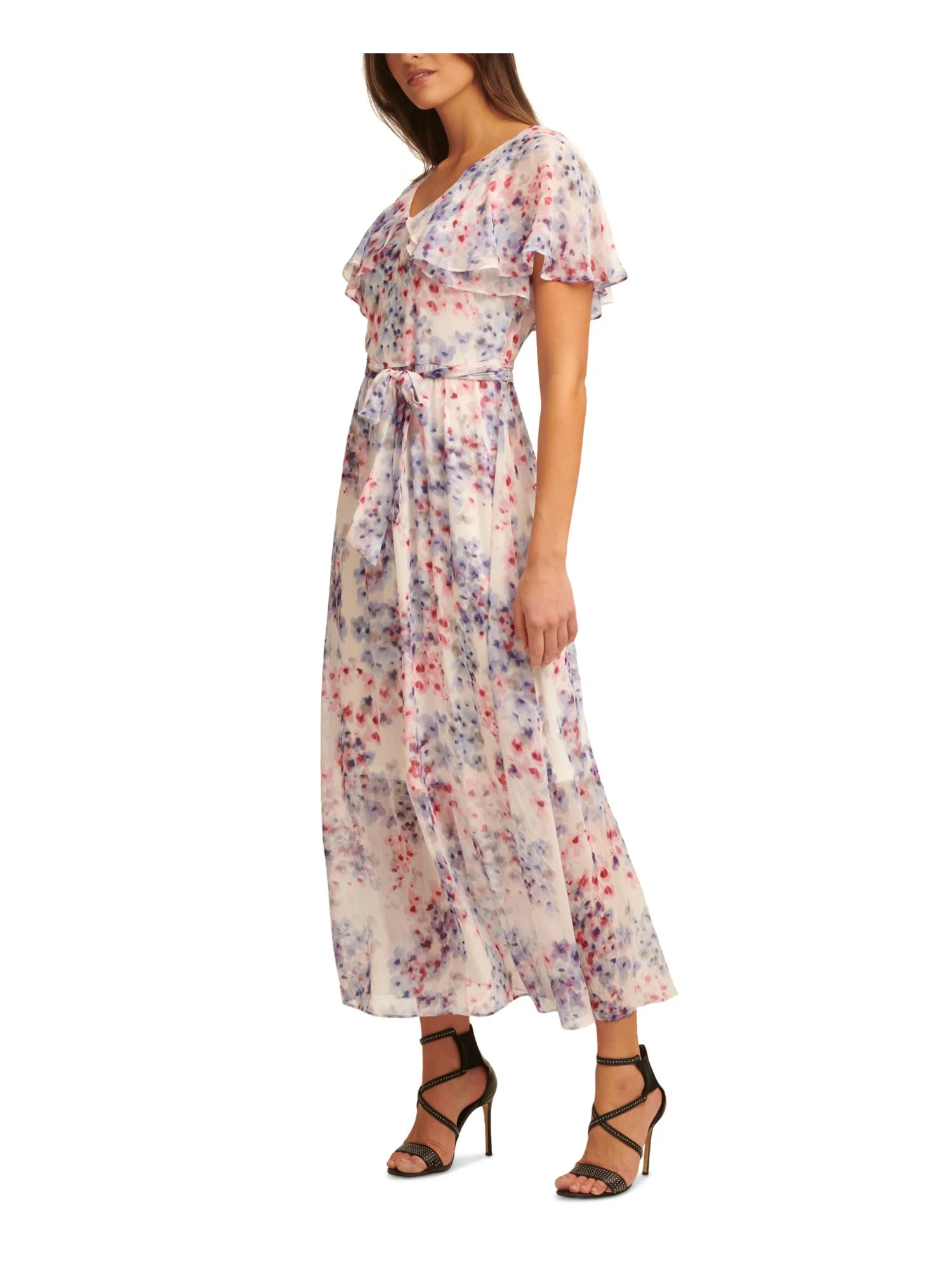 DKNY Womens Ivory Zippered Tie Floral Flutter Sleeve V Neck Maxi Wear To Work Fit + Flare Dress 4