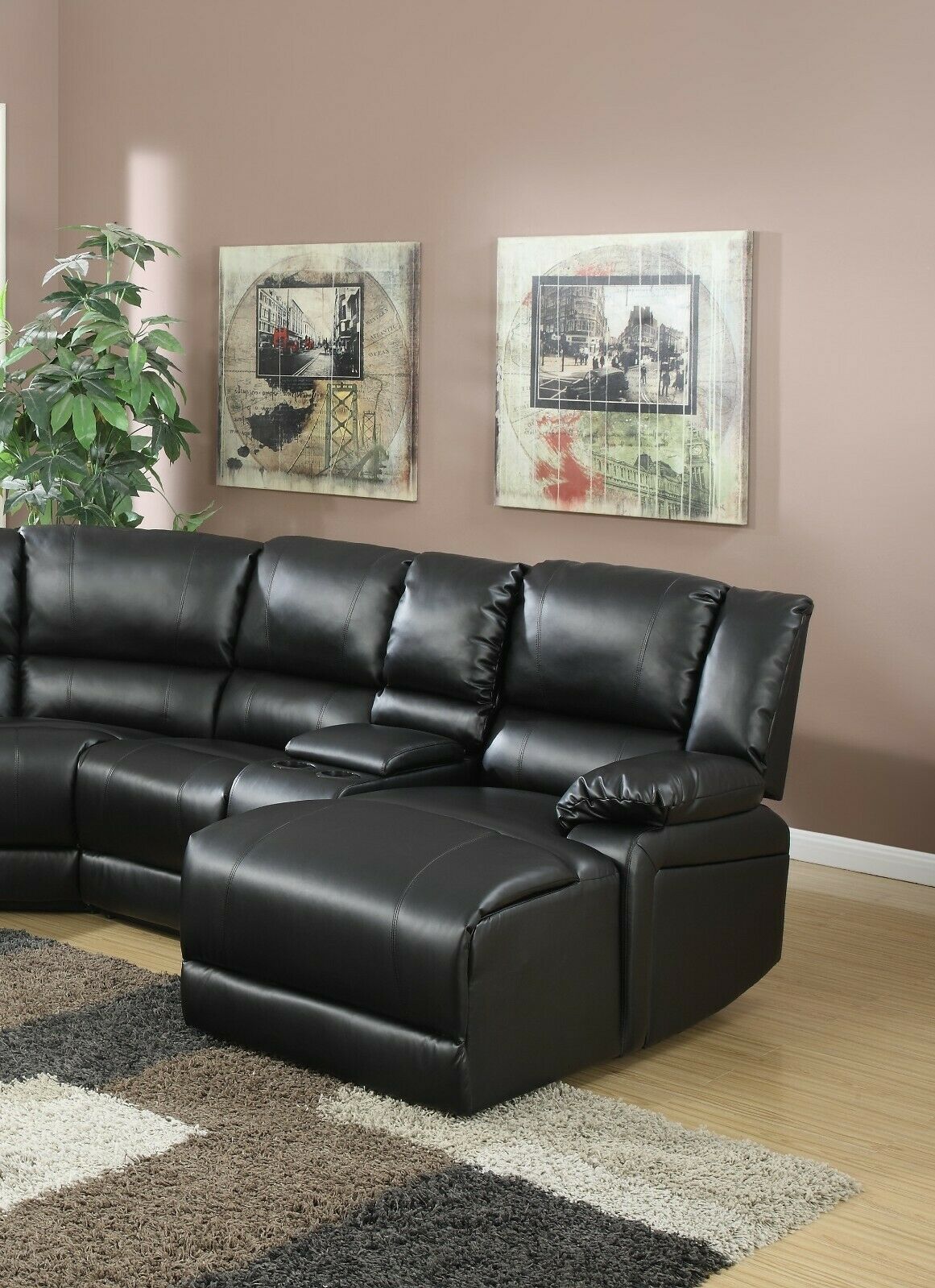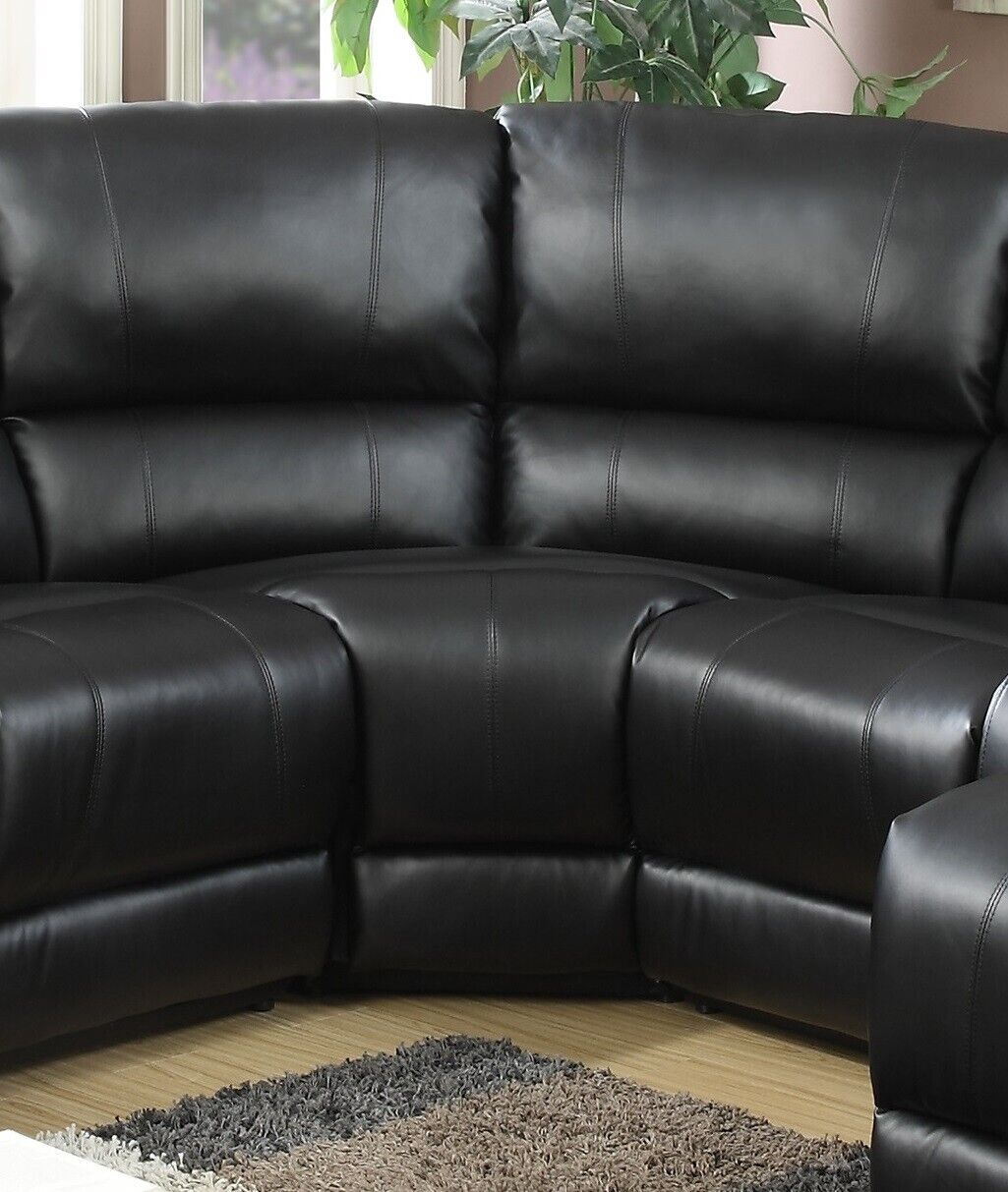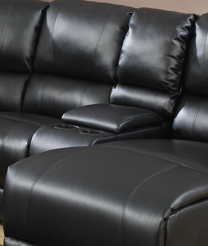 Contemporary Living Room Bonded Leather Black Sectional Sofa Metal Reclining Set Couch Consoles Cup holder Push Back-Chaise