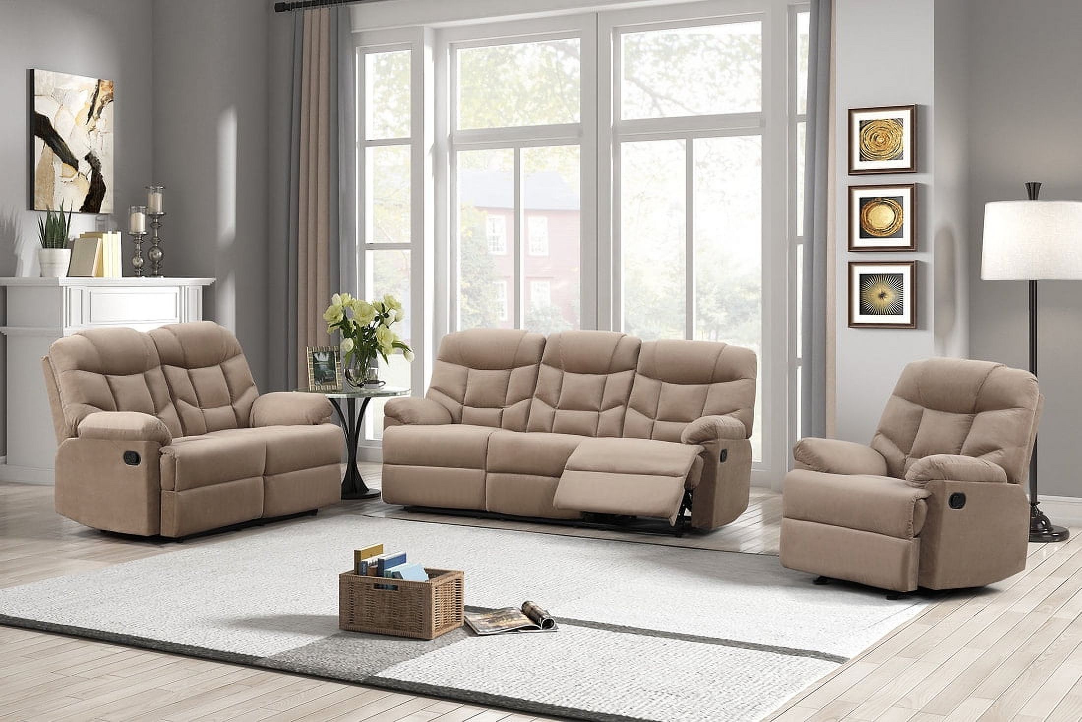 Modern 3 Piece Reclining Living Room Set Sofa Loveseat Chair Polyester Fabric Manual Recliners in Mocha Color