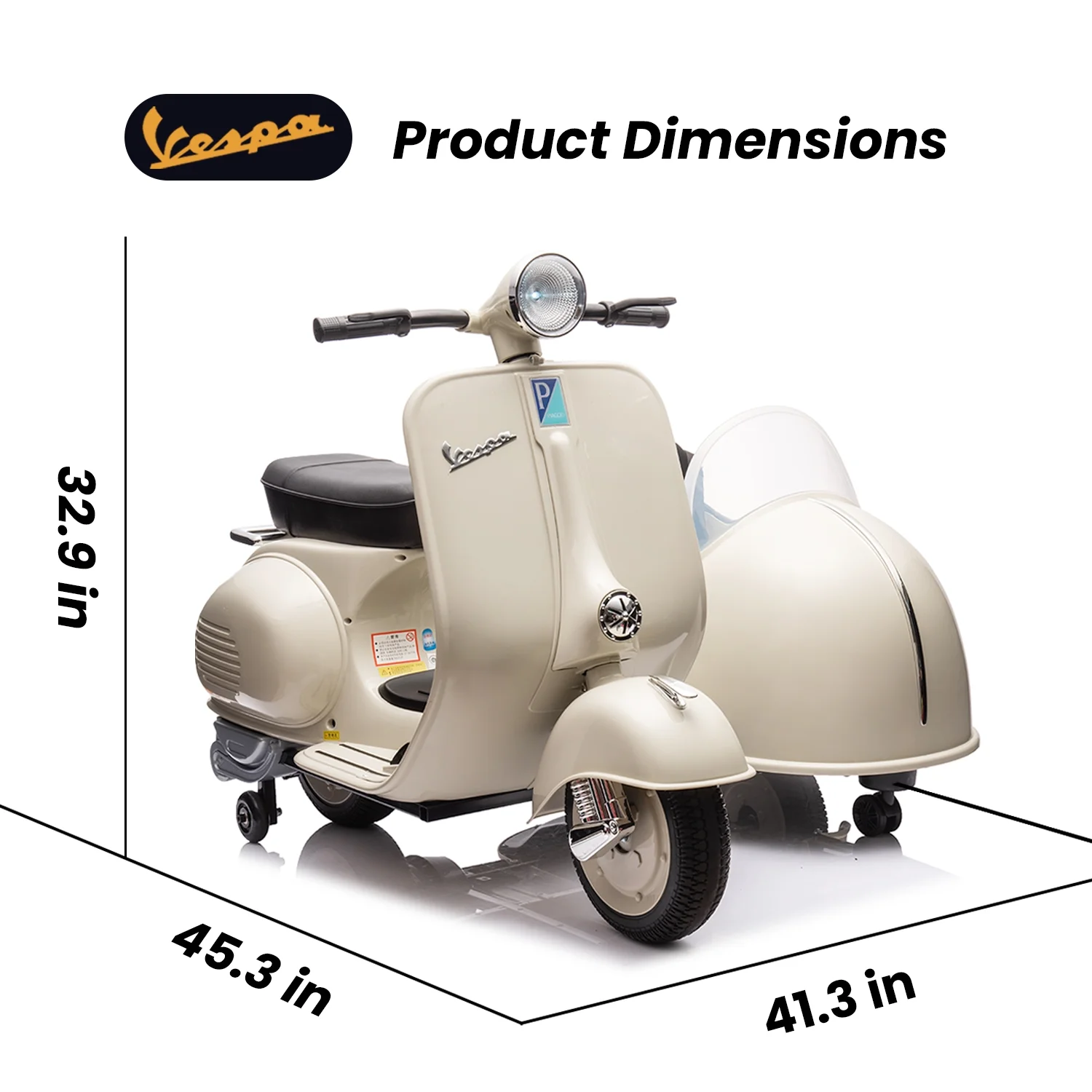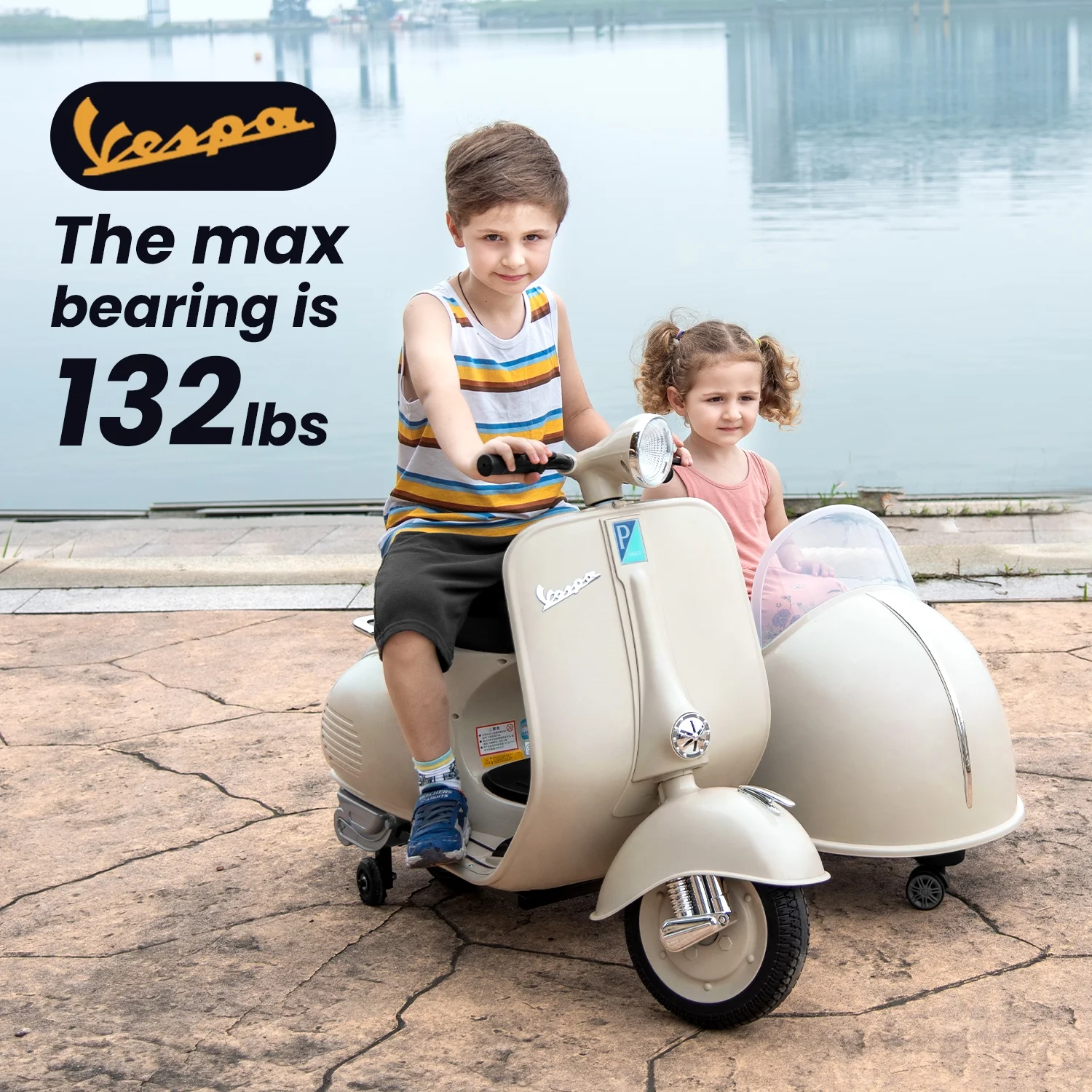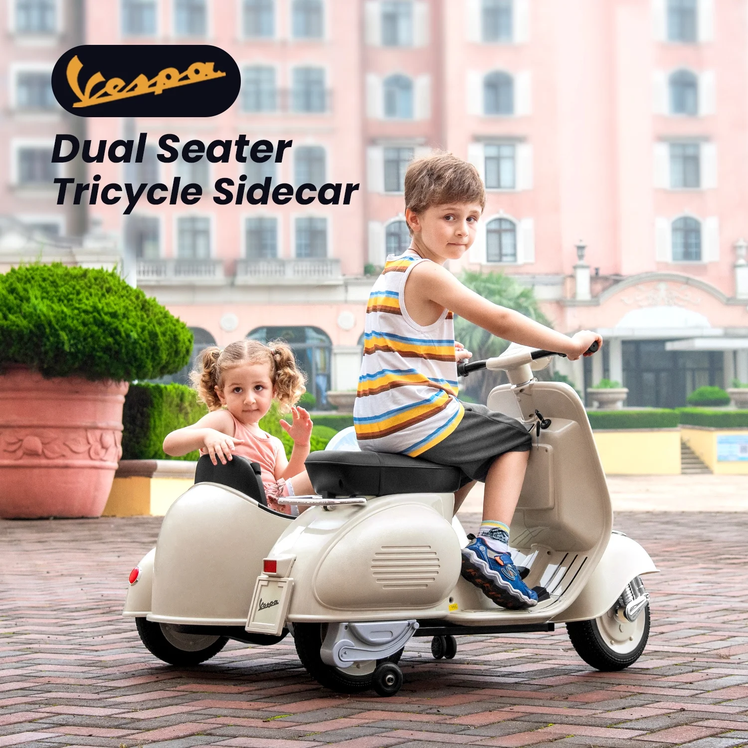 Track 7 12V Licensed Vespa Ride on Motorcycle with Side Car, 2-Seater Electric Car for Kids Age 3+, Music, Max Speed 4.8mph, Grey