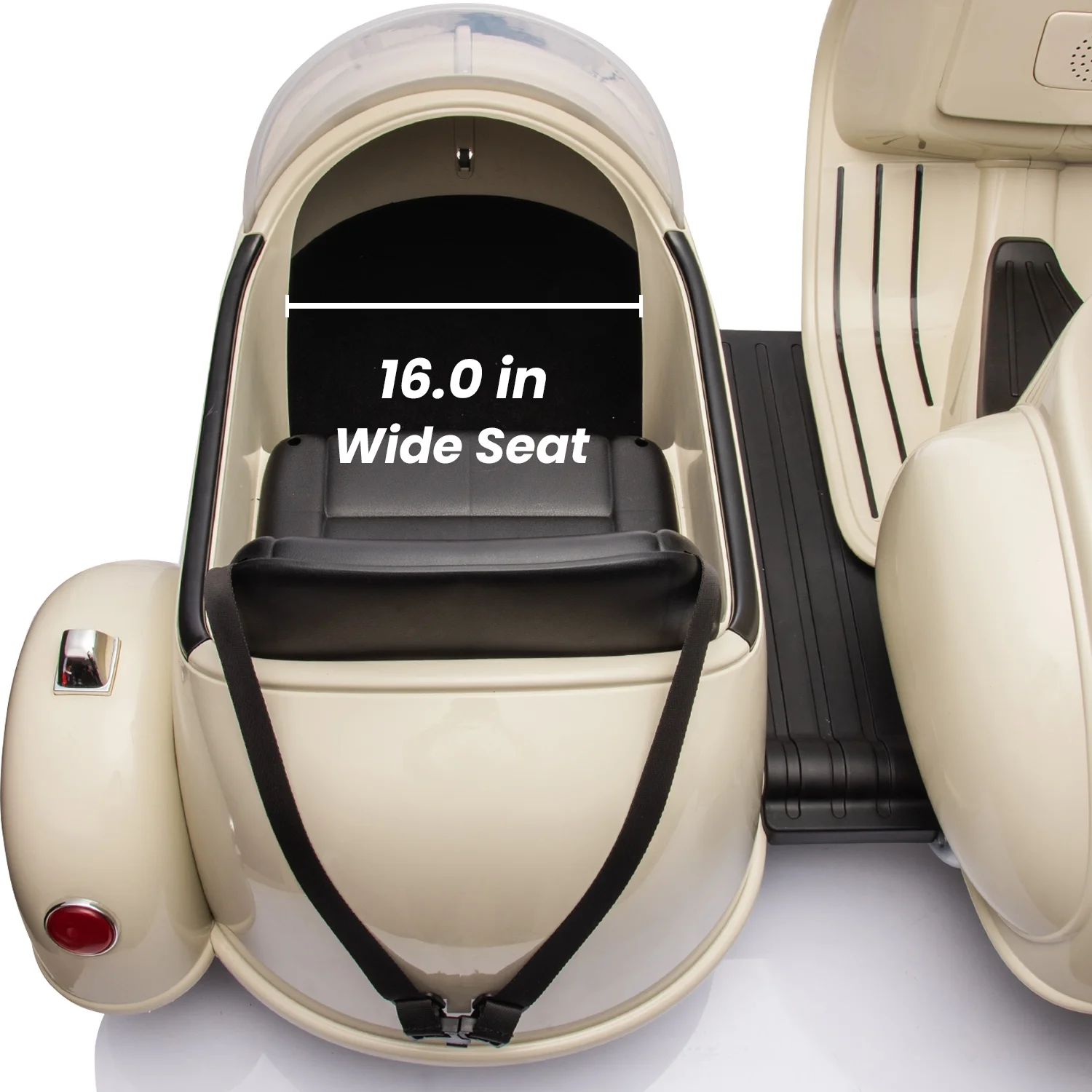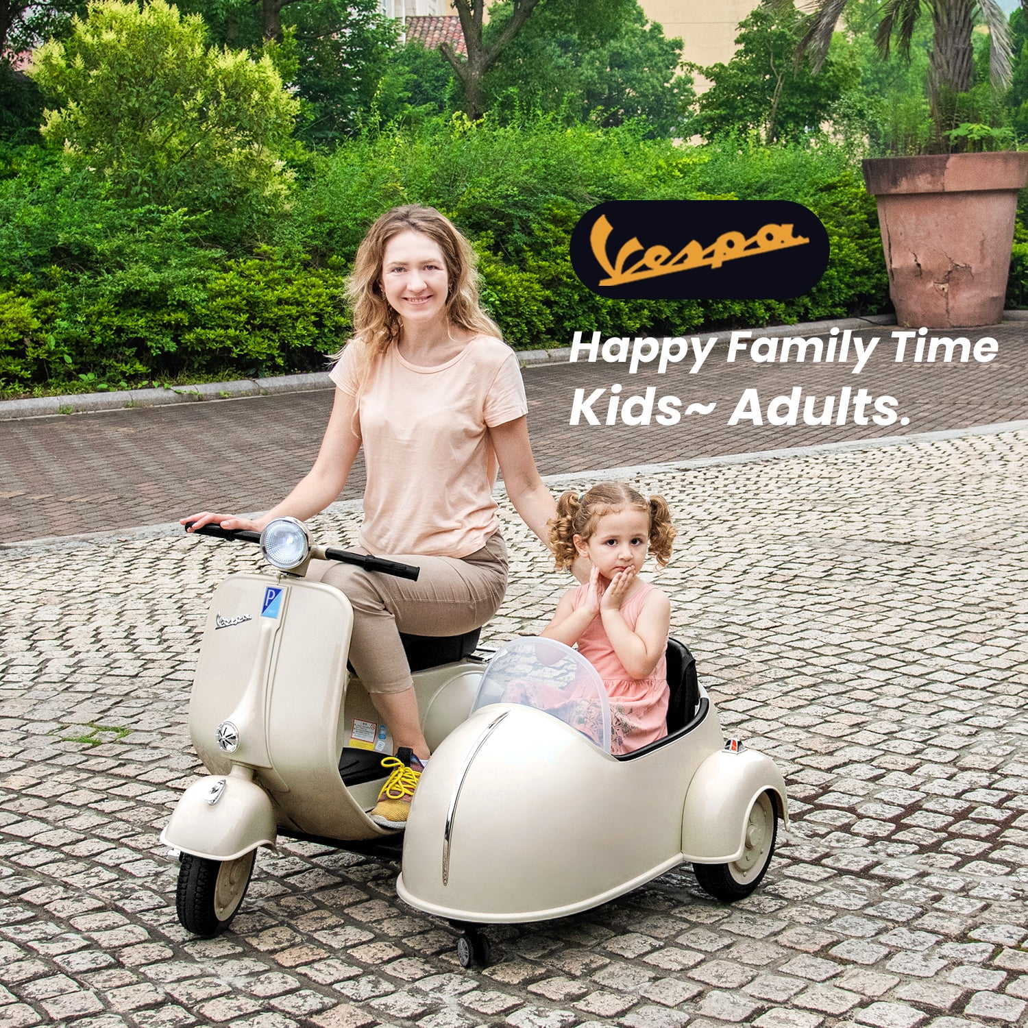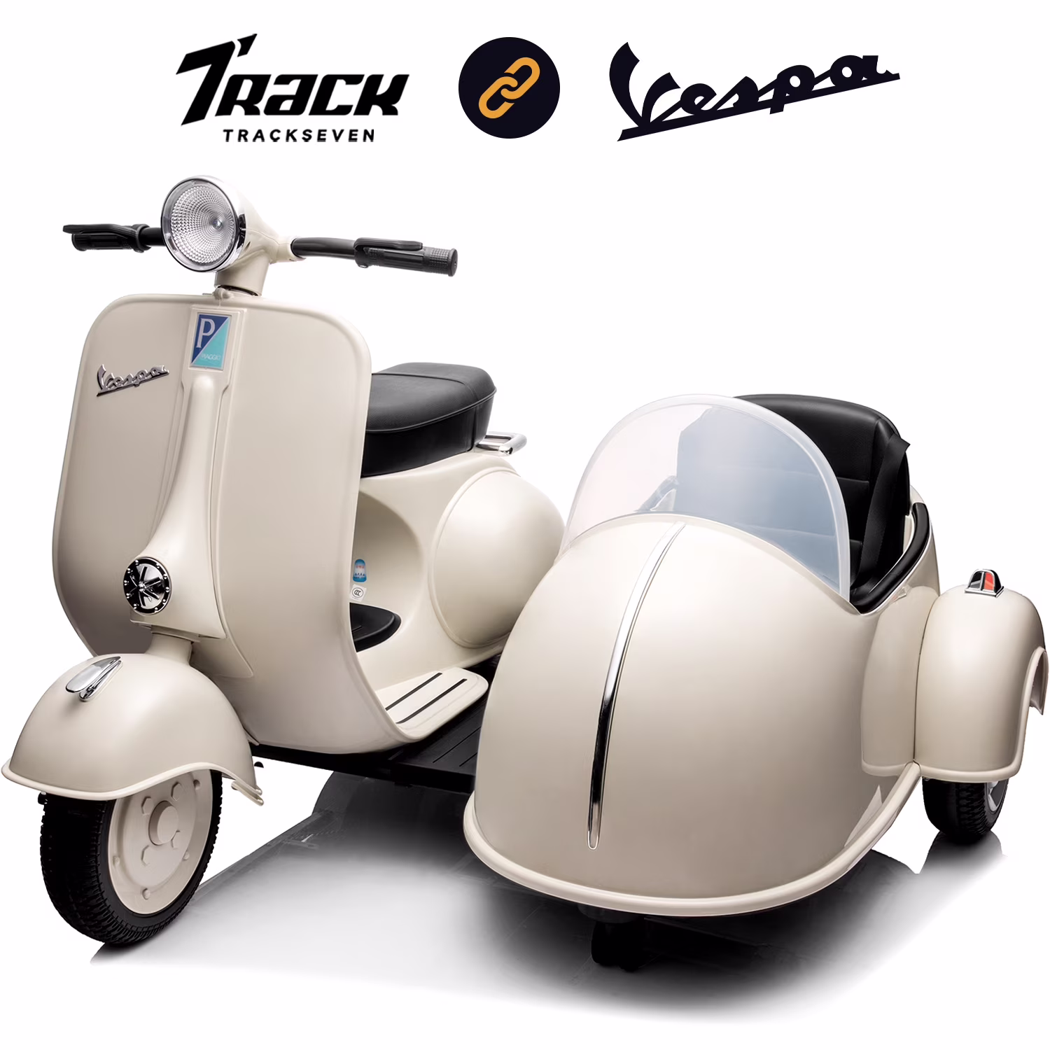 Track 7 12V Licensed Vespa Ride on Motorcycle with Side Car, 2-Seater Electric Car for Kids Age 3+, Music, Max Speed 4.8mph, Grey