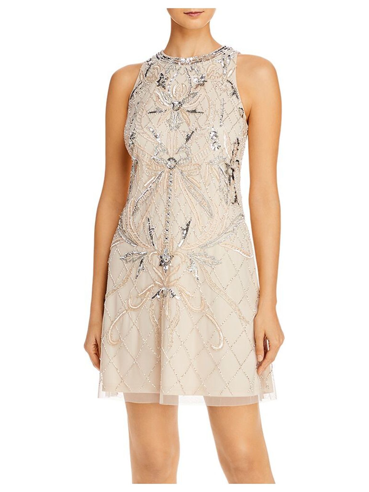 AIDAN MATTOX Womens White Sequined Beaded Sleeveless Jewel Neck Short Cocktail Sheath Dress 16