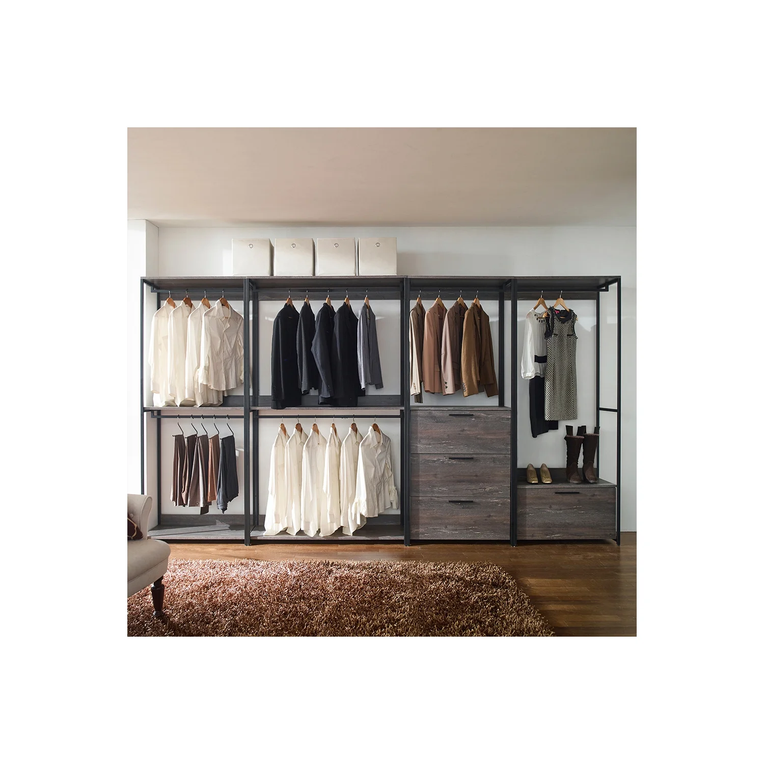 Klair Living Monica Wood and Metal Walk-in Closet with 3-Drawer in Rustic Gray