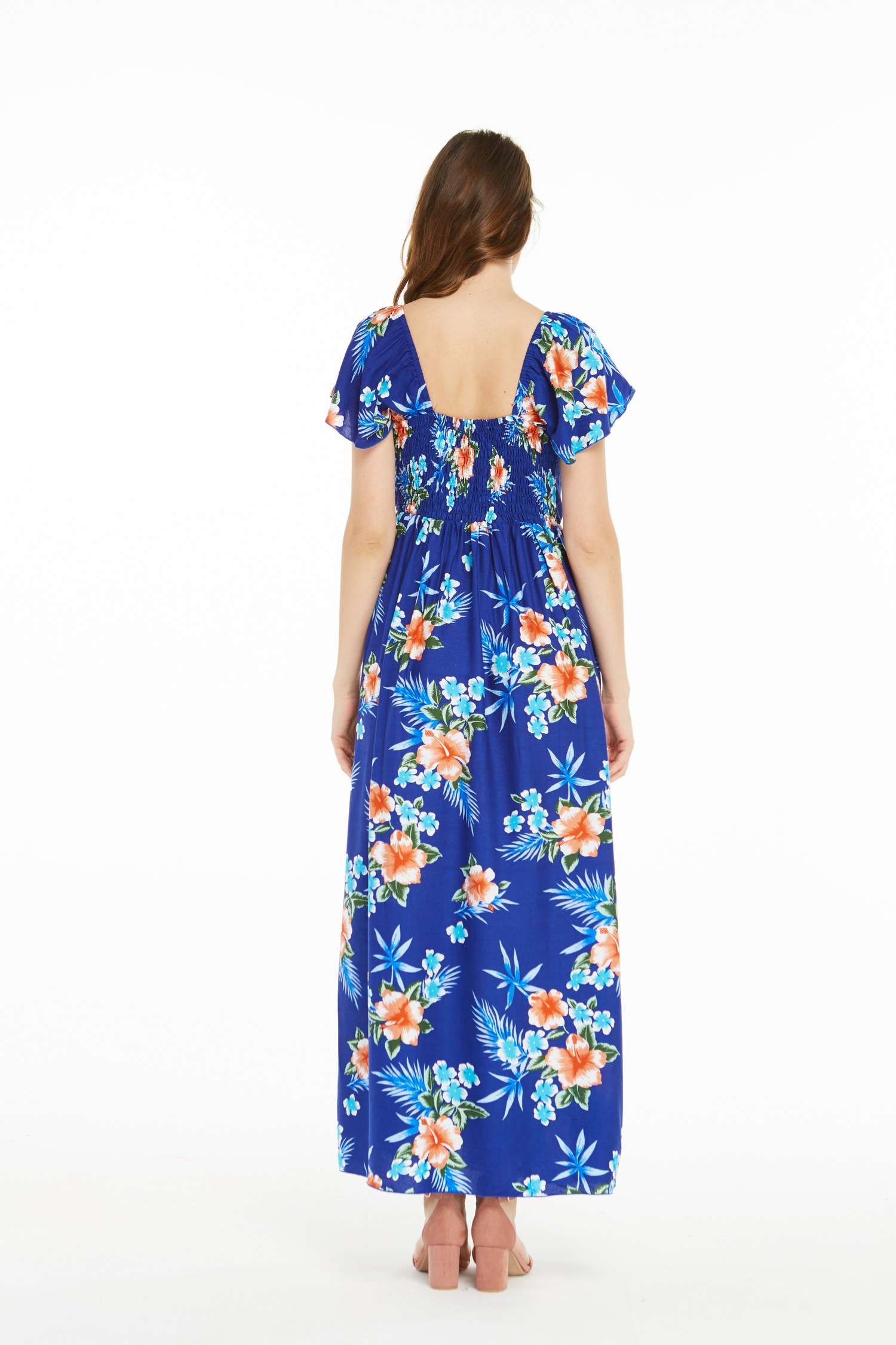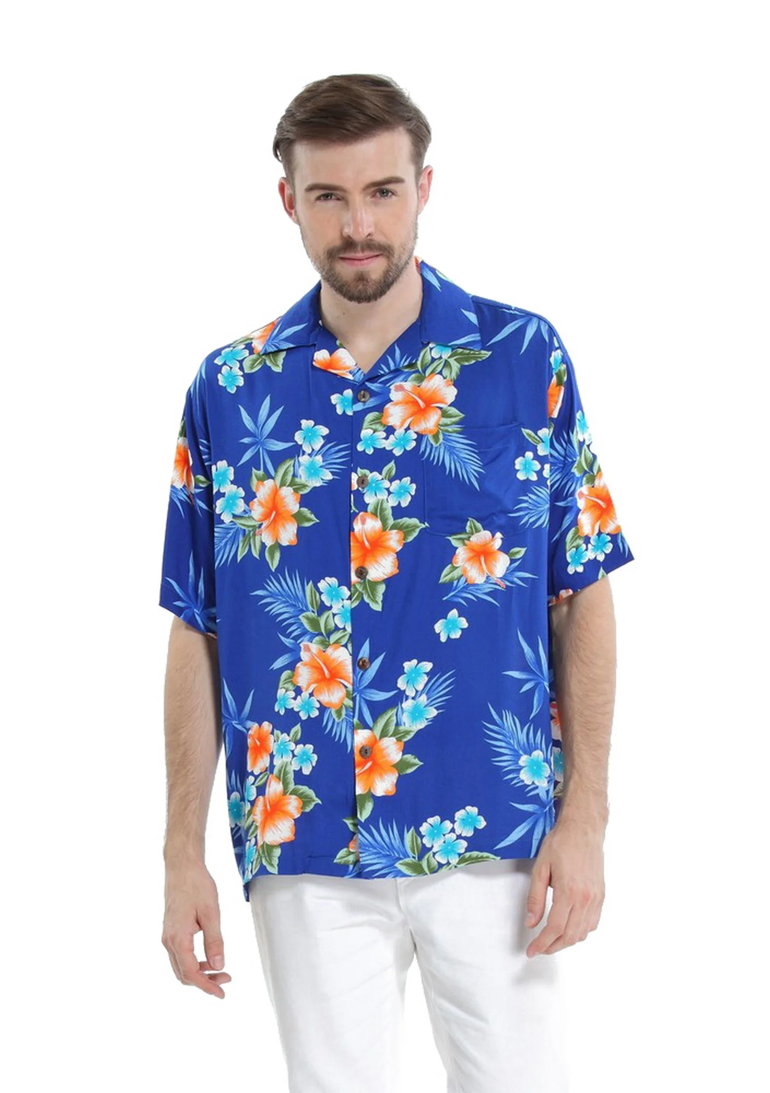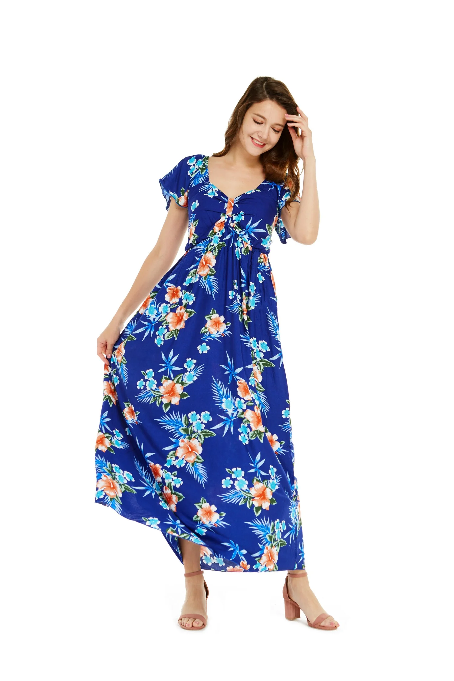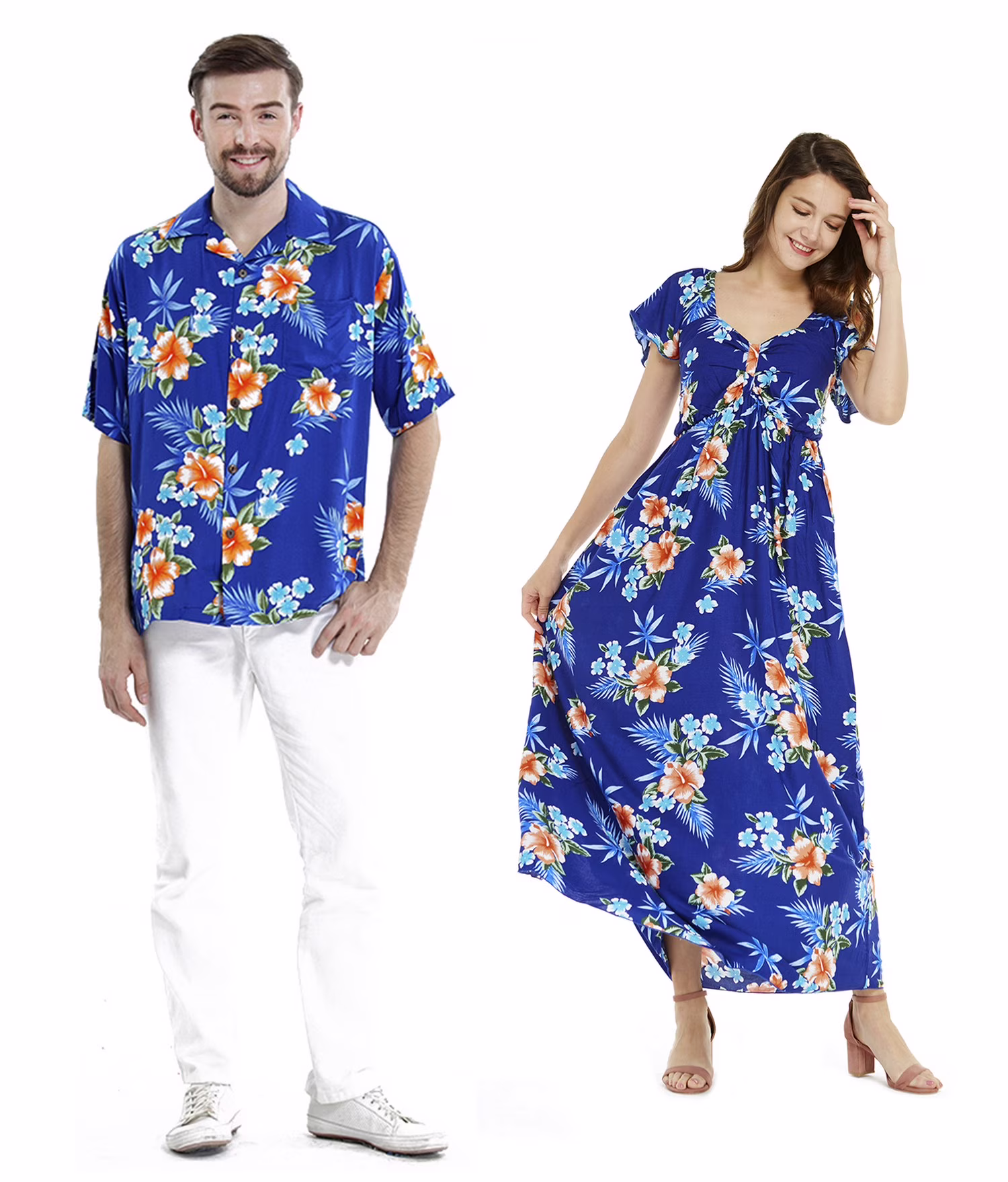 Couple Matching Hawaiian Luau Aloha Shirt Maxi Ruffle Sleeve Dress in Hibiscus