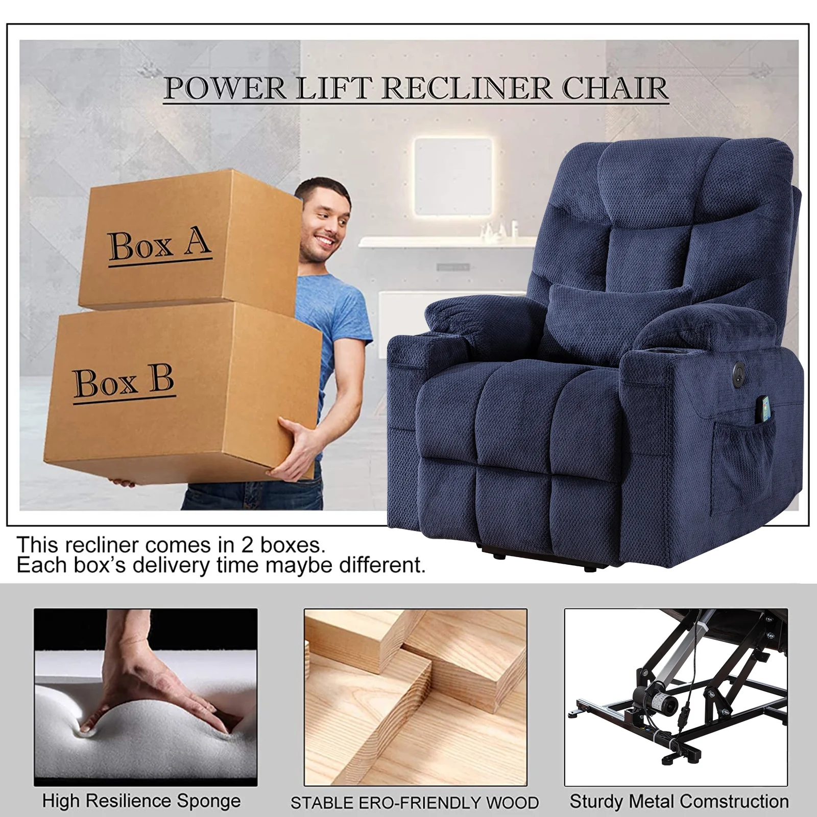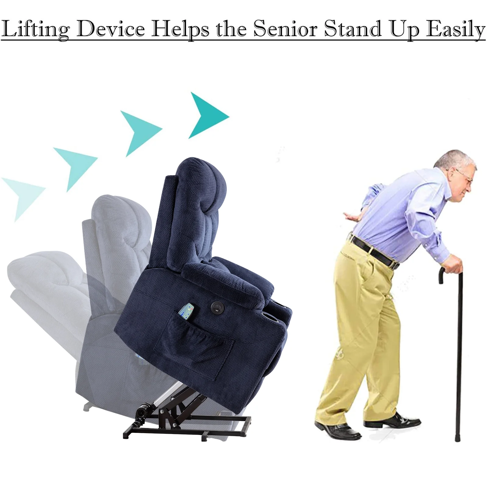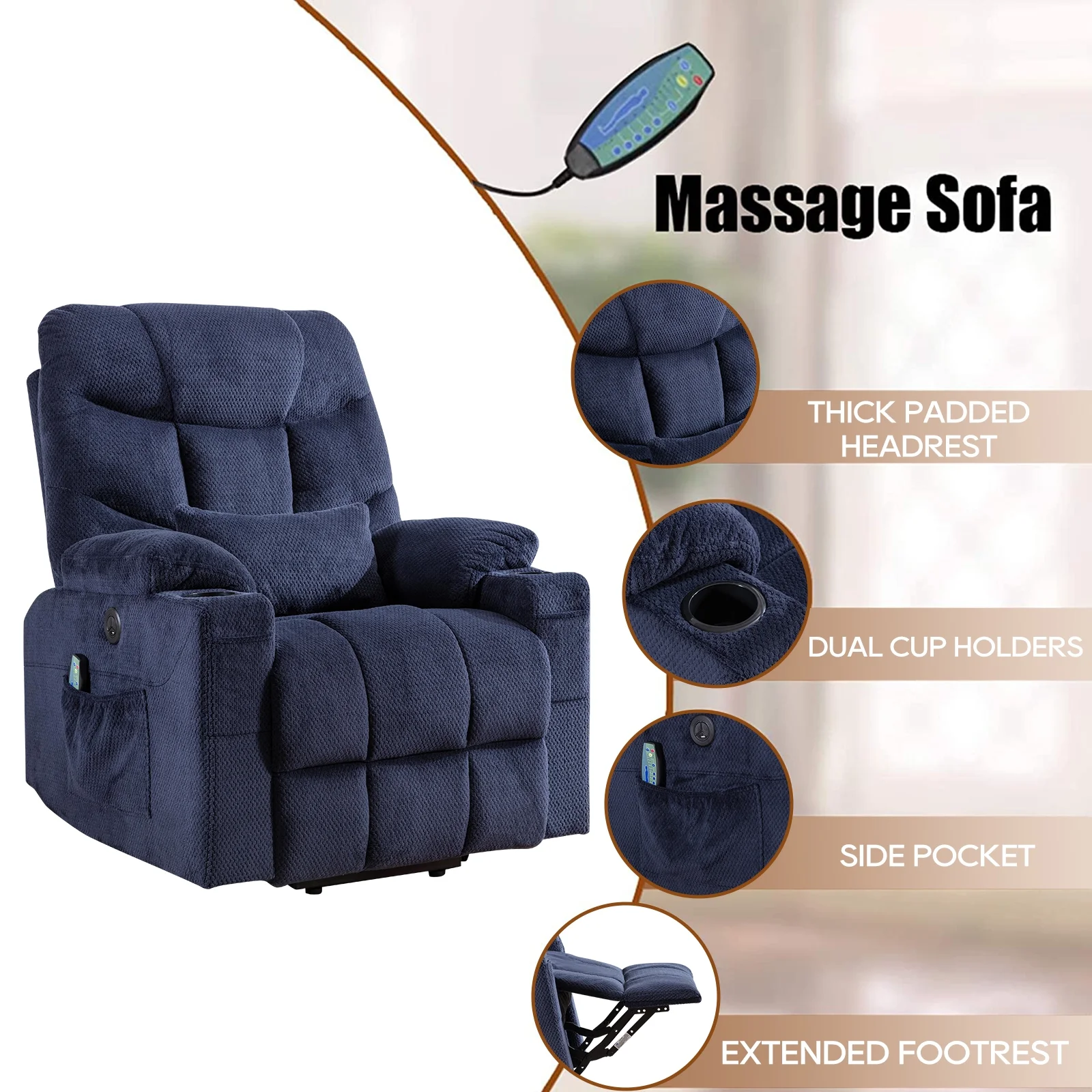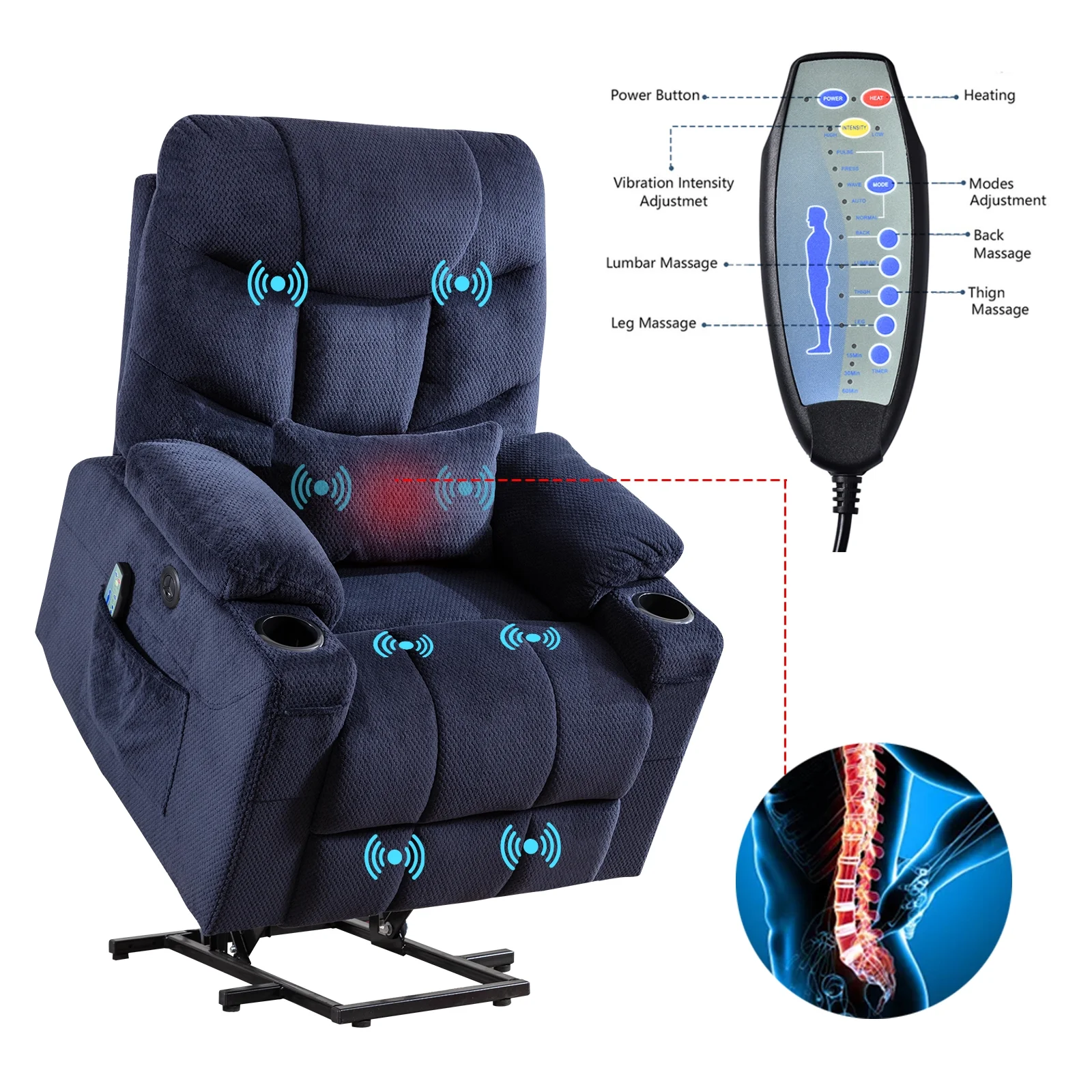 Power Lift Recliner Chairs Velvet Electric Recliner with Vibration Massage & Heat Function, Blue