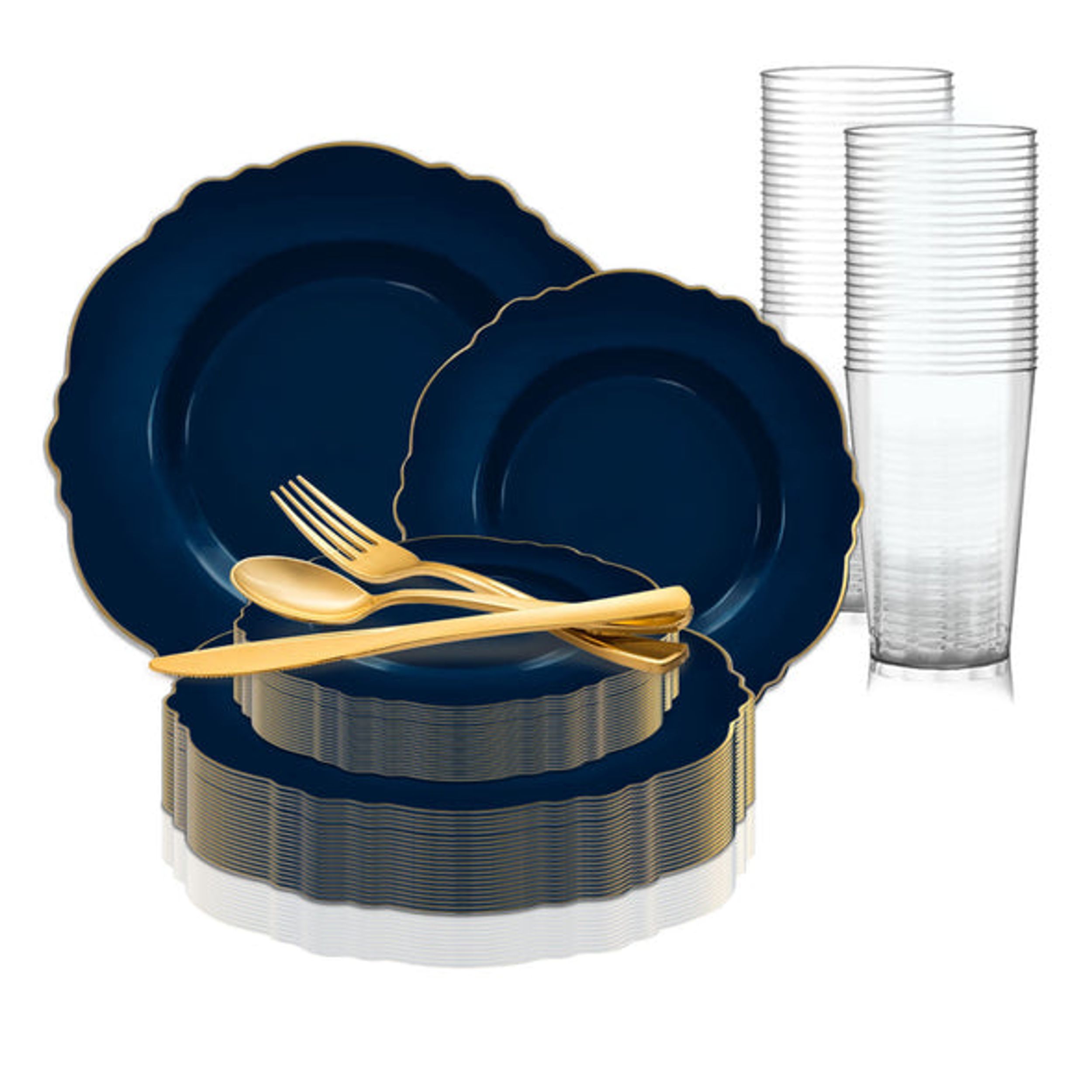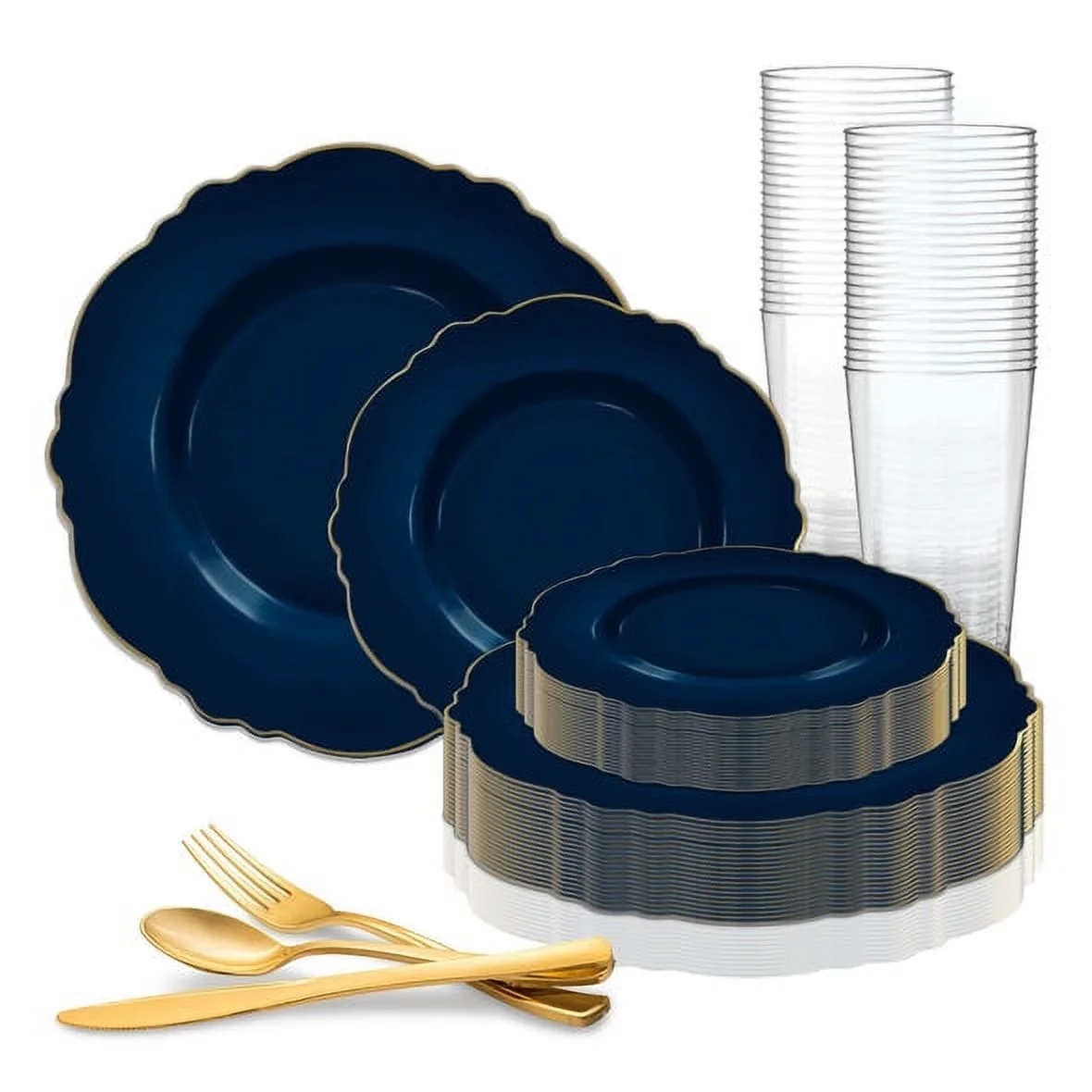 Smarty Navy with Gold Rim Round Blossom Disposable Plastic Wedding Value Set (60 Guests)