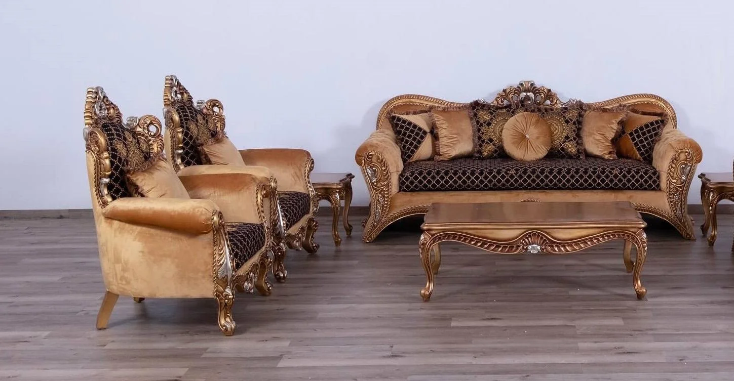 Luxury Golden Brown & Silver Wood Trim ALEXSANDRA Sofa Set 3 EUROPEAN FURNITURE