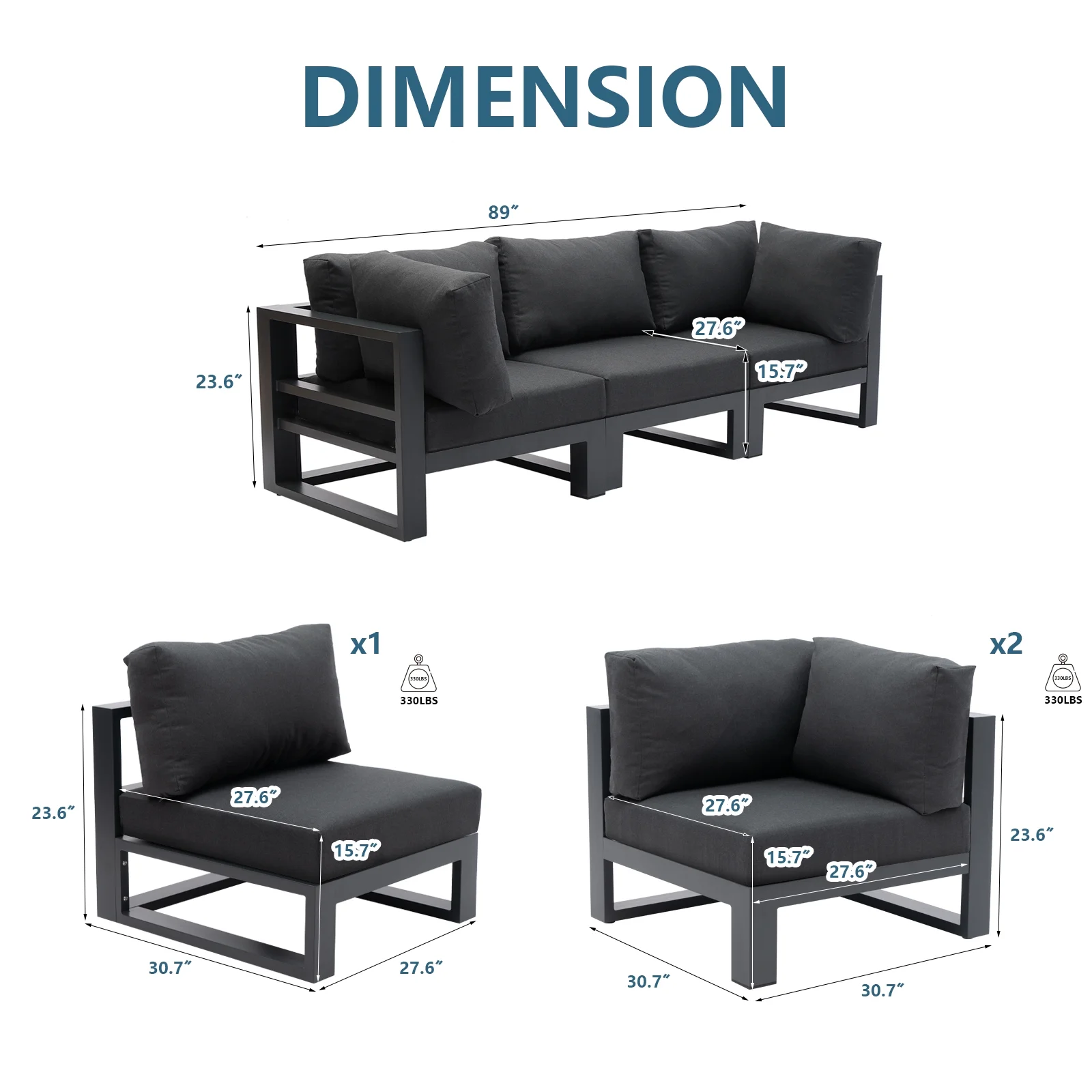 Modern 3 Seater Sofa Outdoor Sectional Sofa Set Patio Conversation Sofa Sets with Grey Cushions