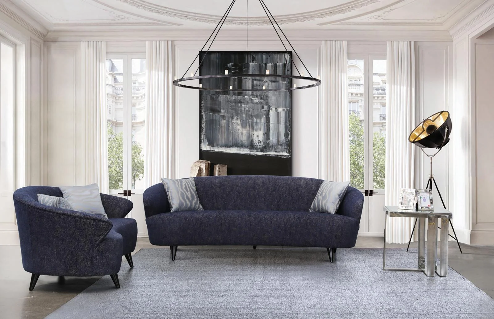 Modern Dark Blue Linen Sofa & Loveseat Set 2 Pcs American Eagle AE3806