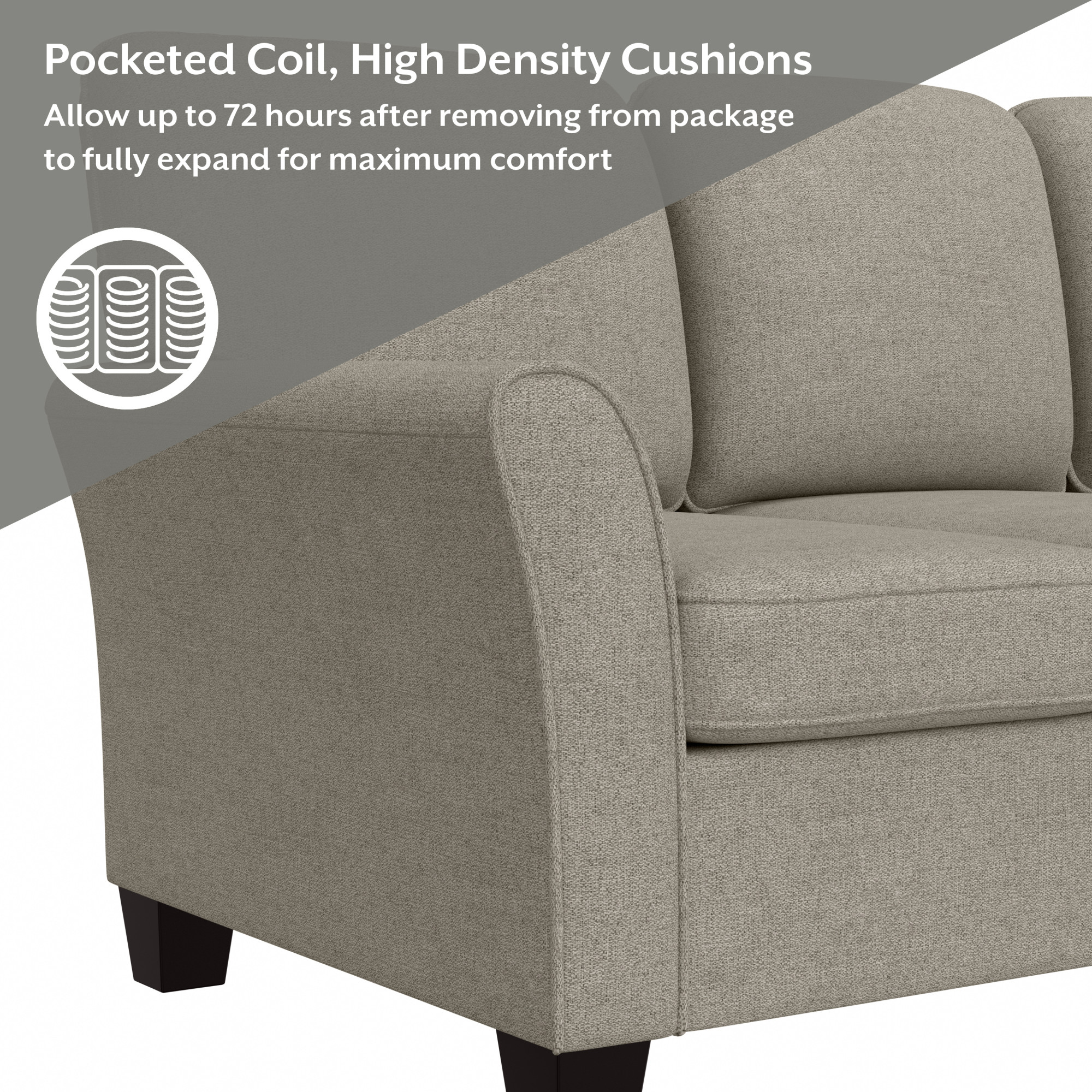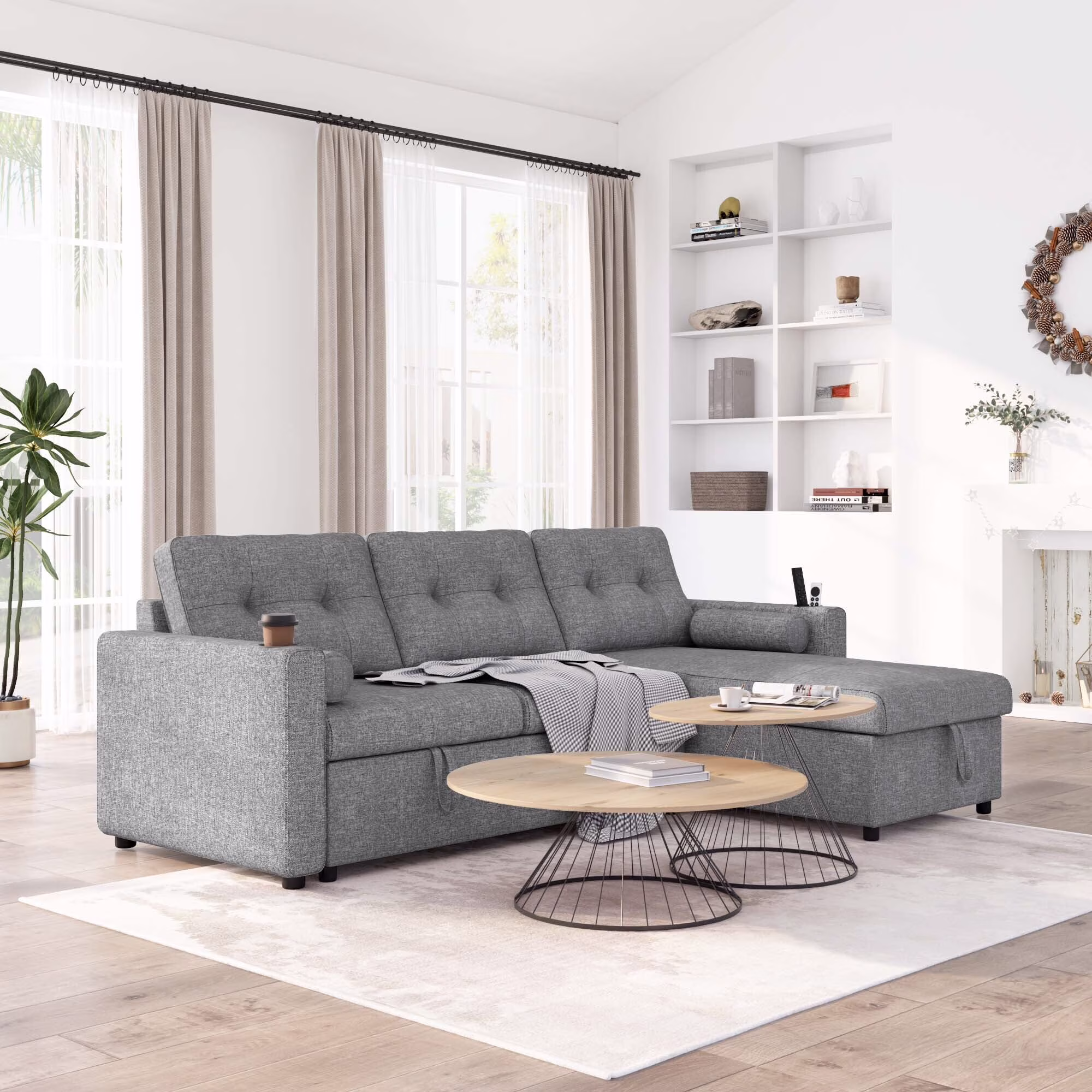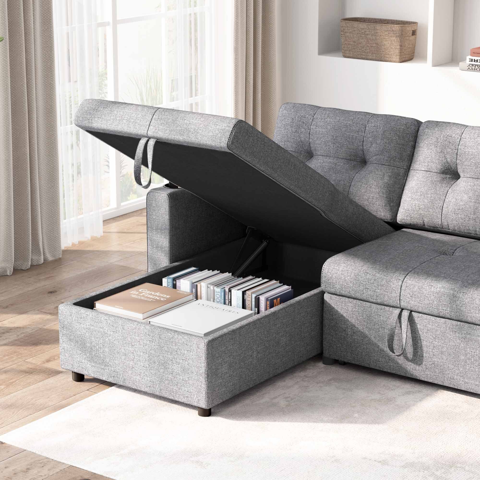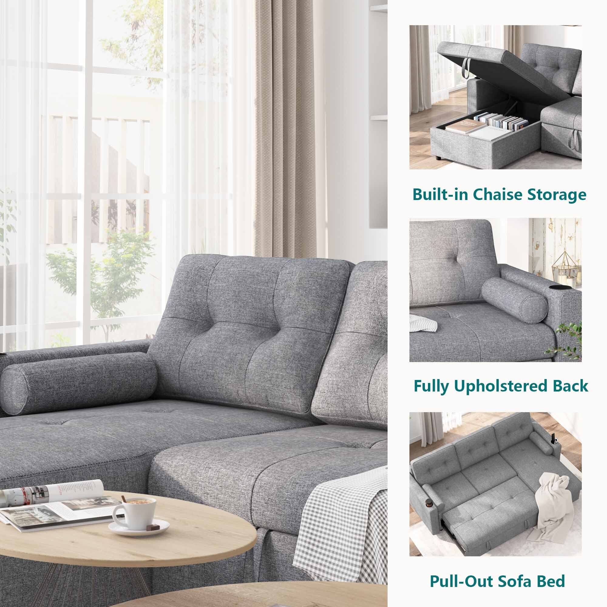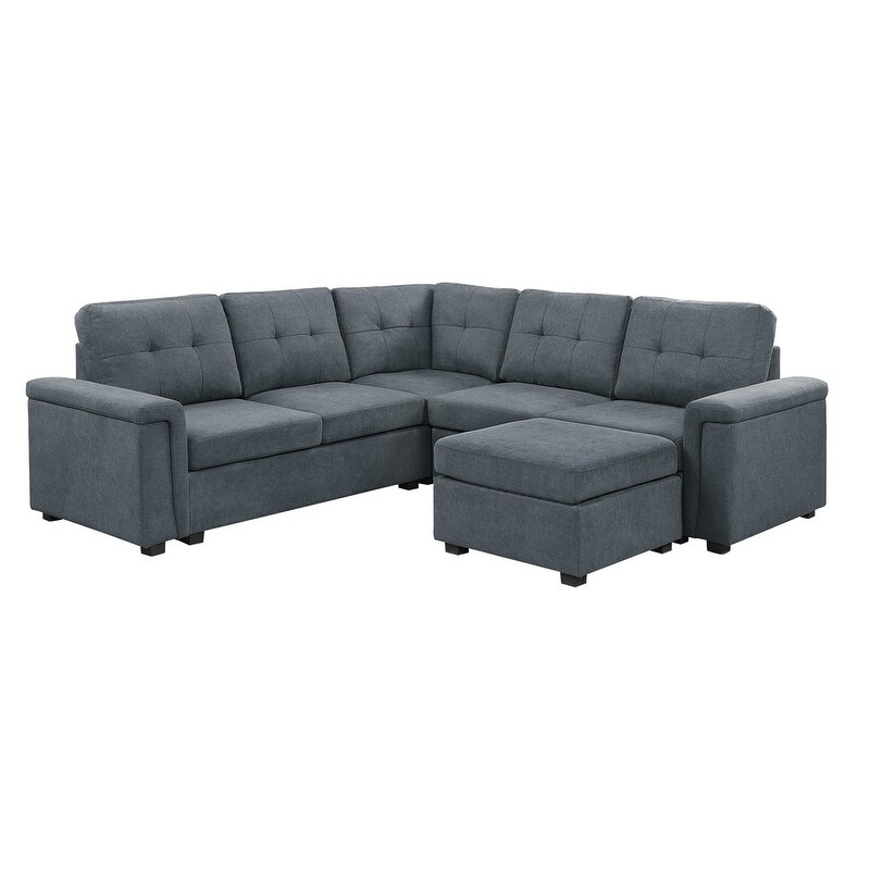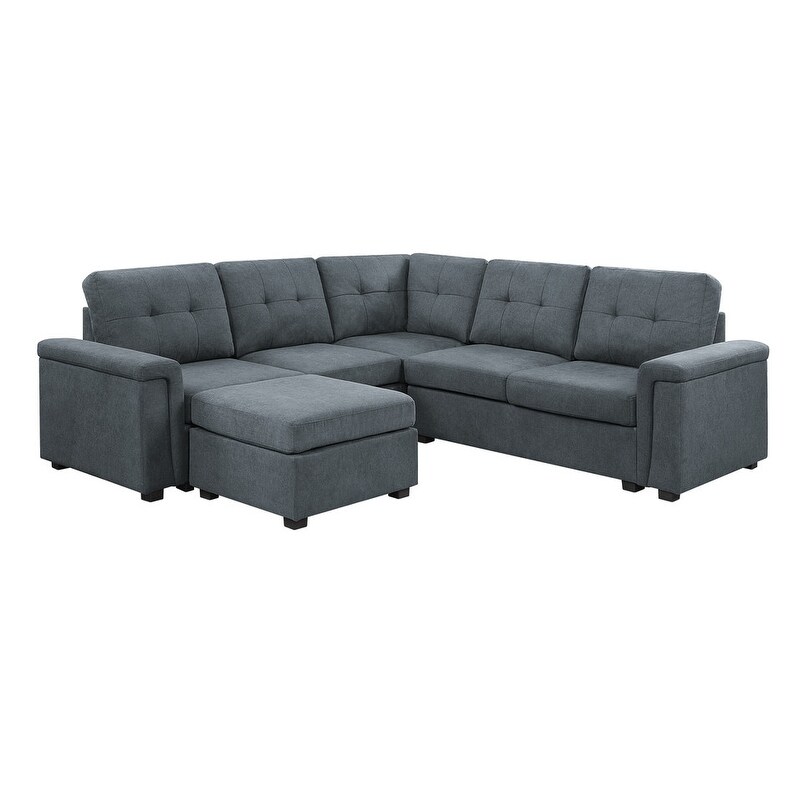 Pemberly Row Gray Fabric Reversible Sectional Sofa w/ Cupholder Storage Ottoman