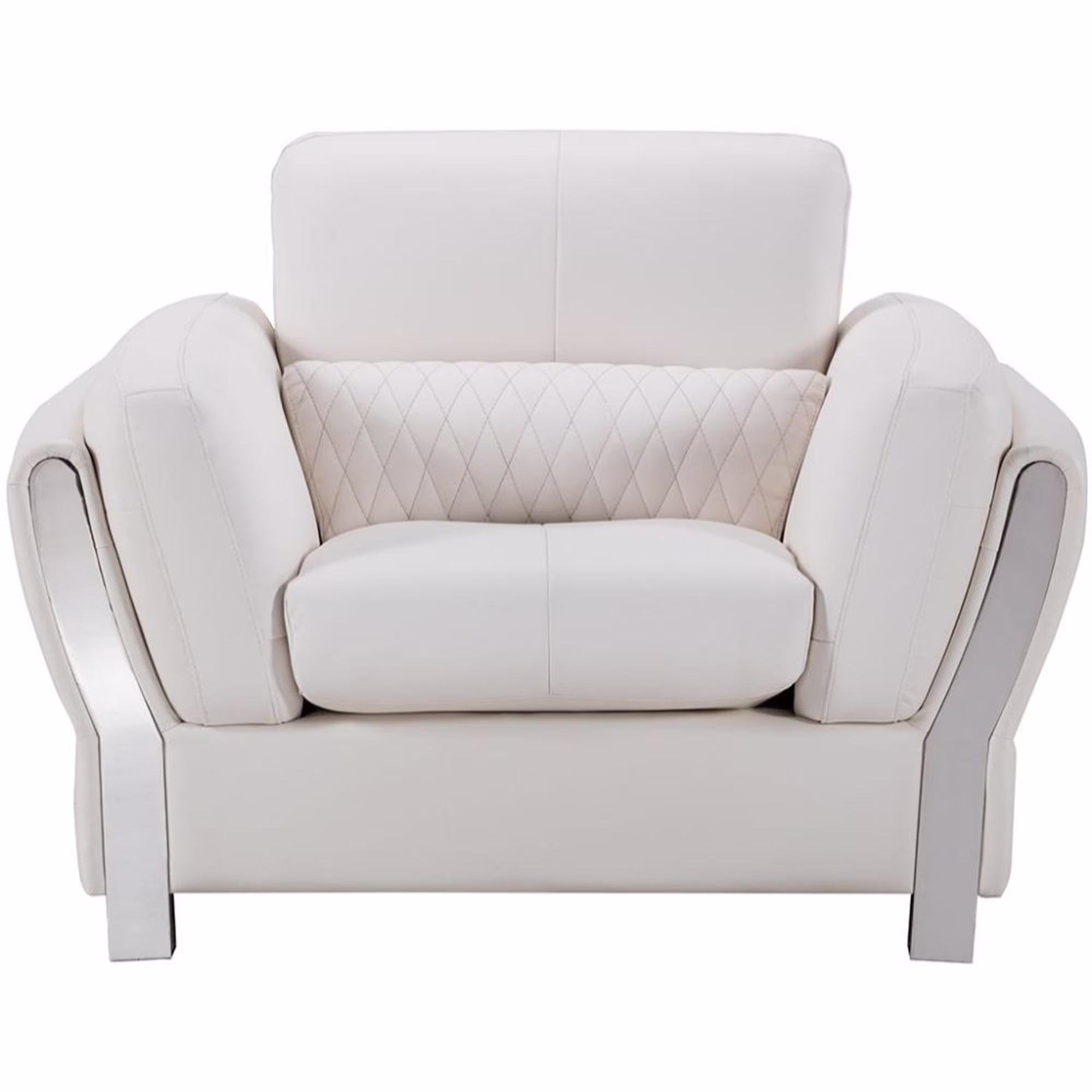 Faux Leather Upholstered Wooden Sofa Chair with Attached Lumbar Cushion, White and Silver