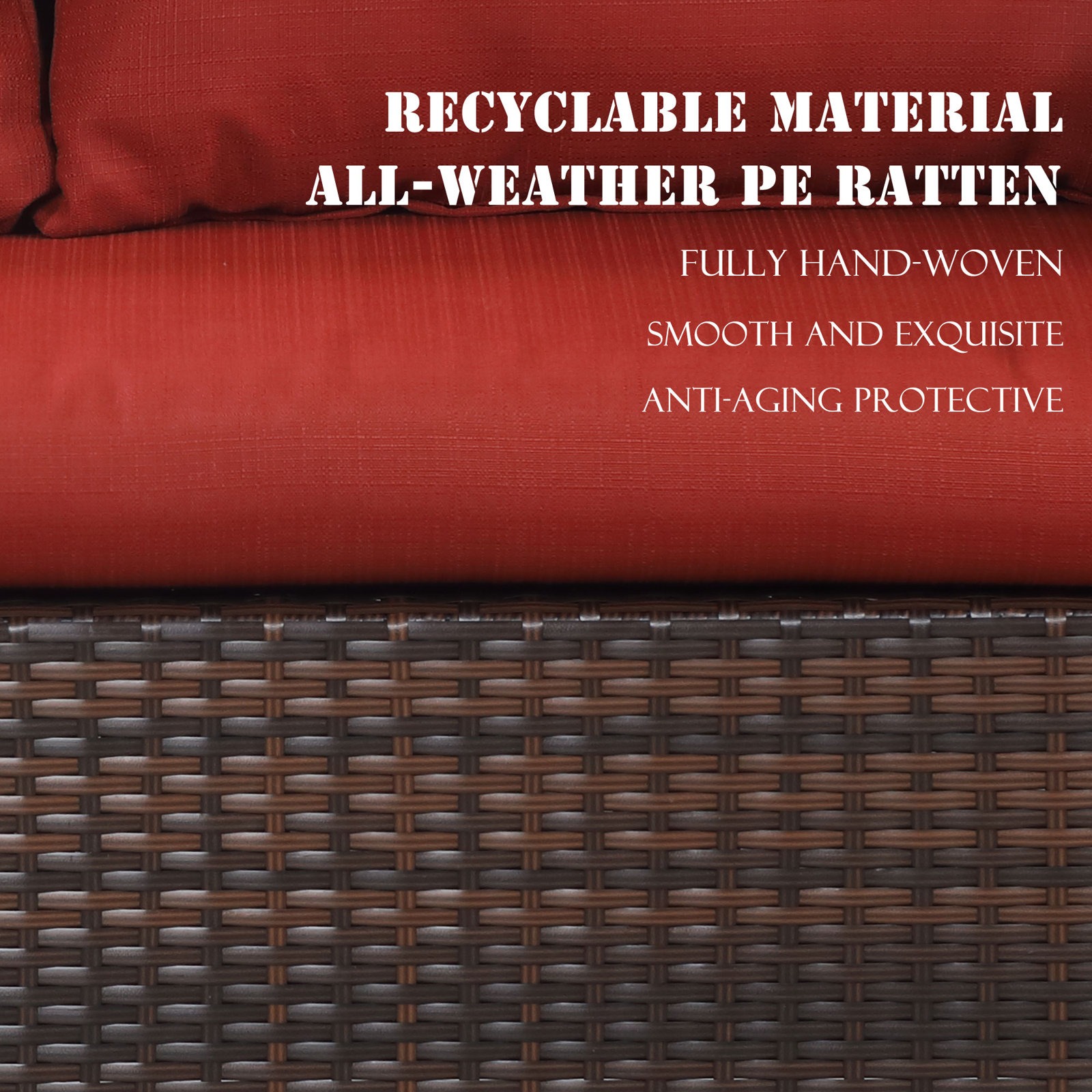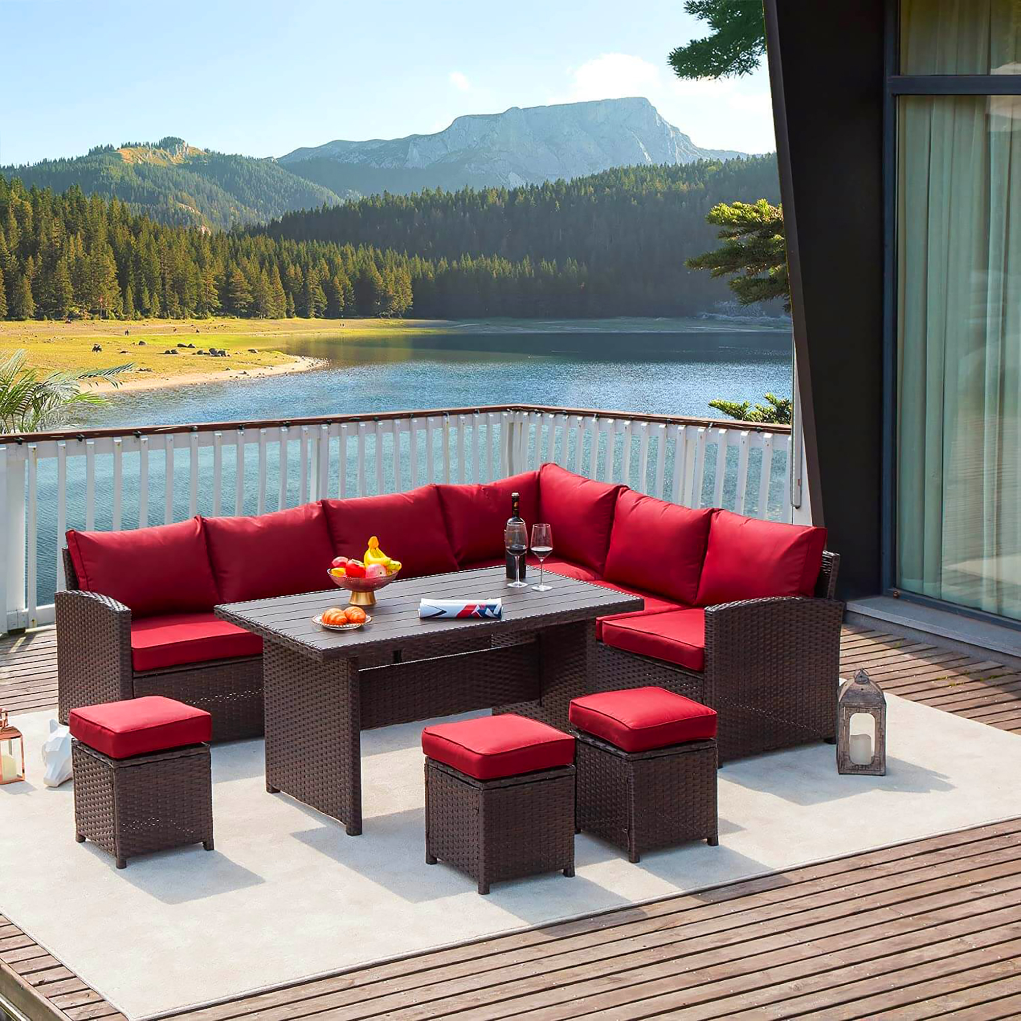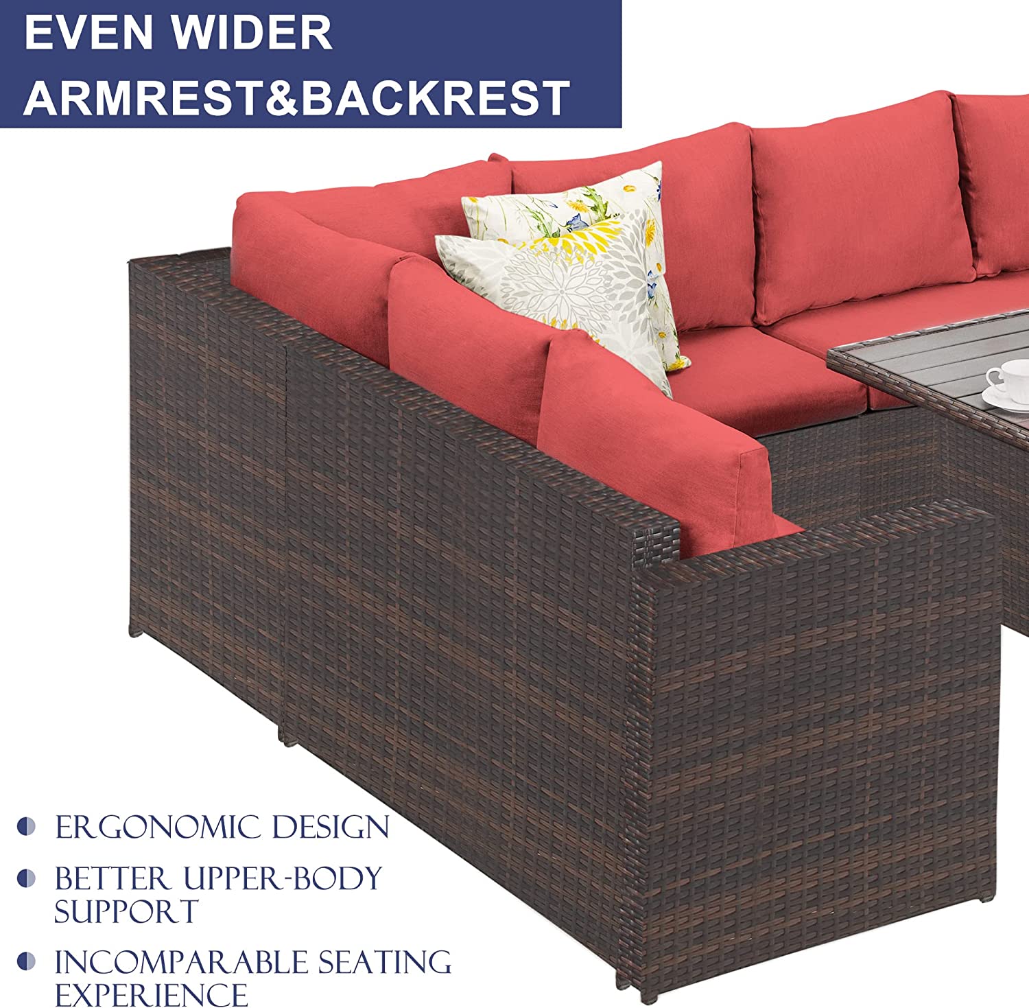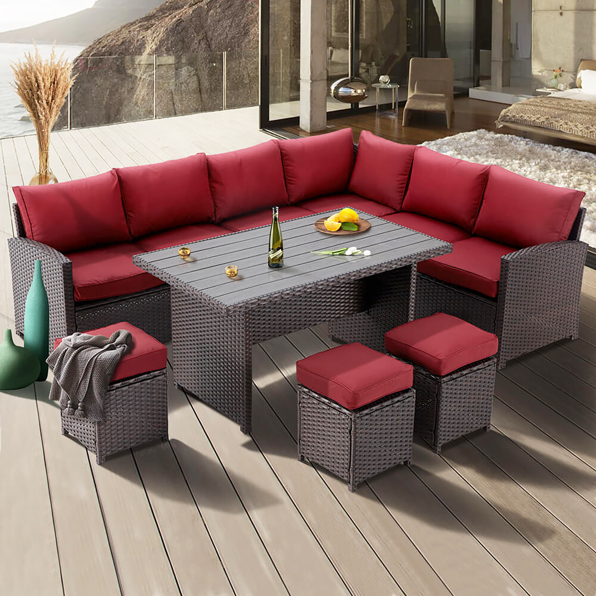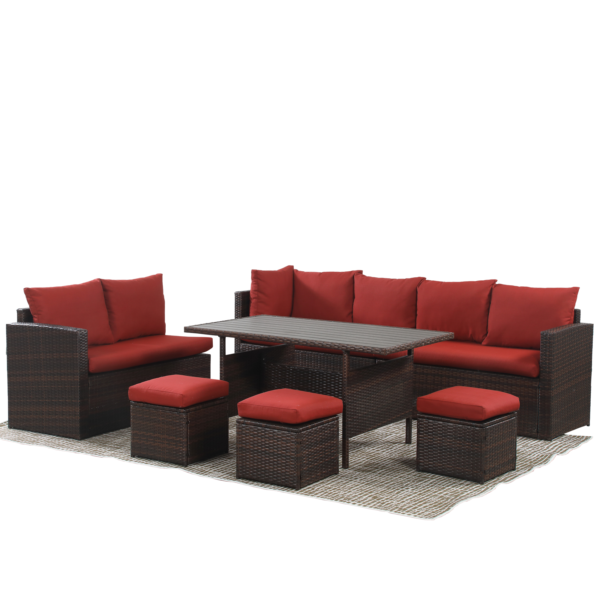 Glavbiku 7 Piece Outdoor Patio Furniture Set, Outdoor Rattan Wicker Dining Table Set with 9 Seat,Red