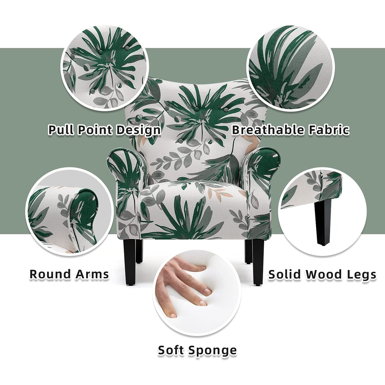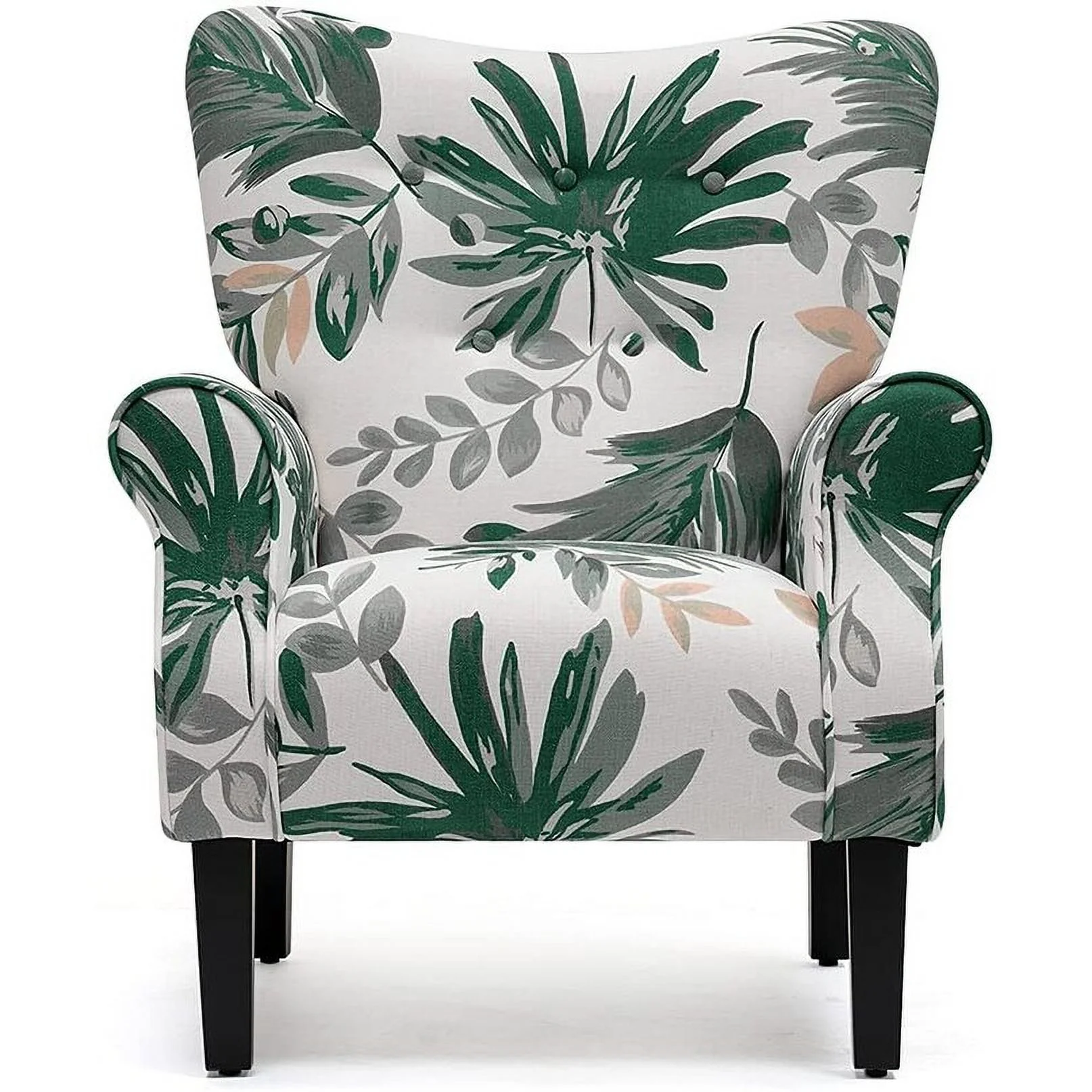 Erommy Wing back Arm Chair, Upholstered Fabric High Back Chair with Wood Legs Green leaves Floral