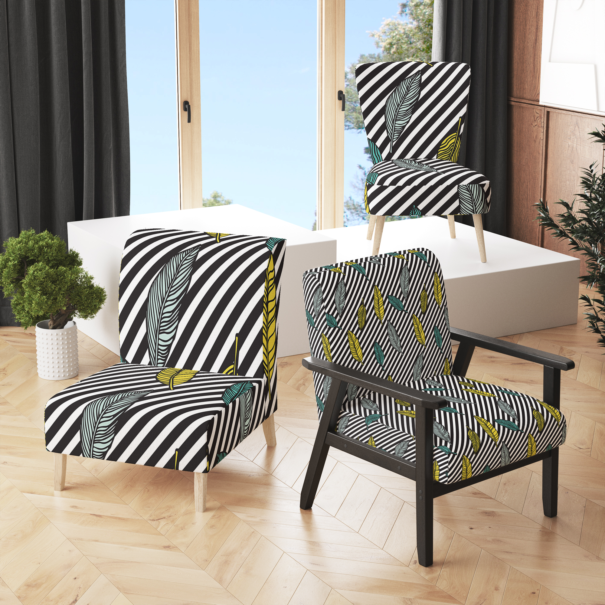 Designart "Black and Yellow Tropical Floral" Upholstered Patterned Accent Chair and Arm Chair