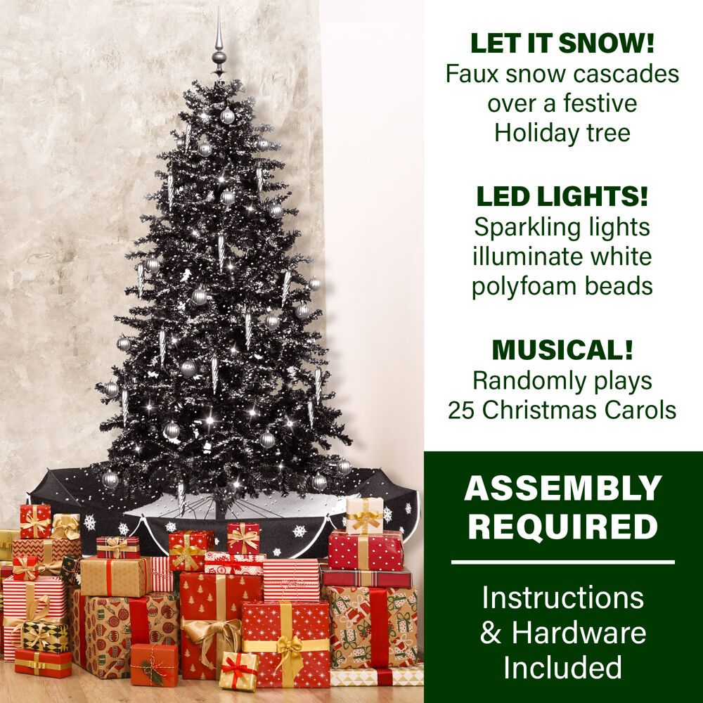 Fraser Hill Farm White Prelit LED Black Decorated Pine Musical Christmas Tree, with Umbrella Base 6.25'