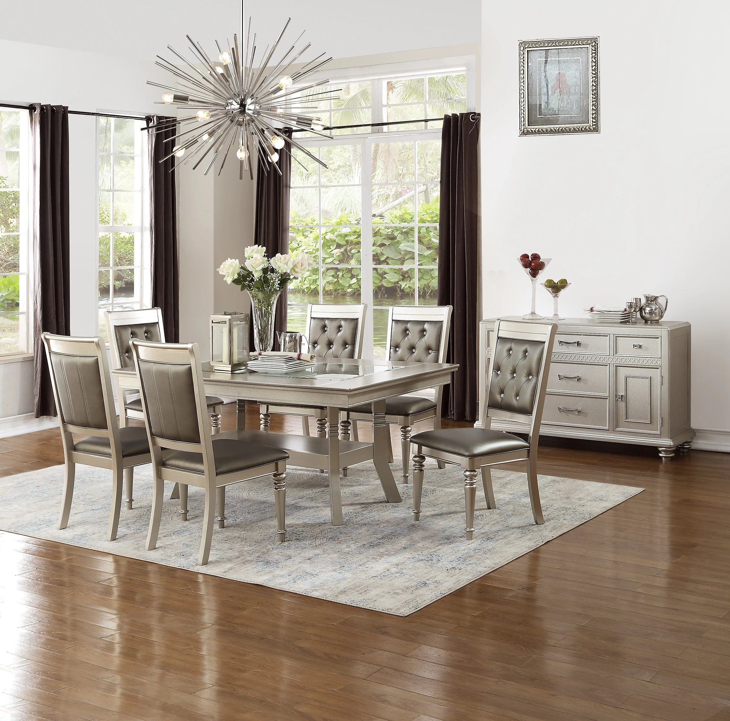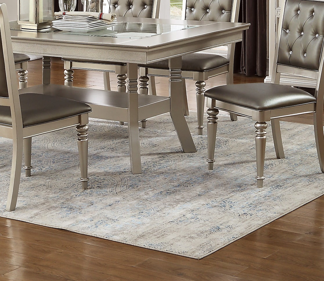 Traditional Formal Dining Table w Shelf 6x Side Chairs Tufted Back Seats Upholstered Kitching 7pc Silver Dining Room Furniture