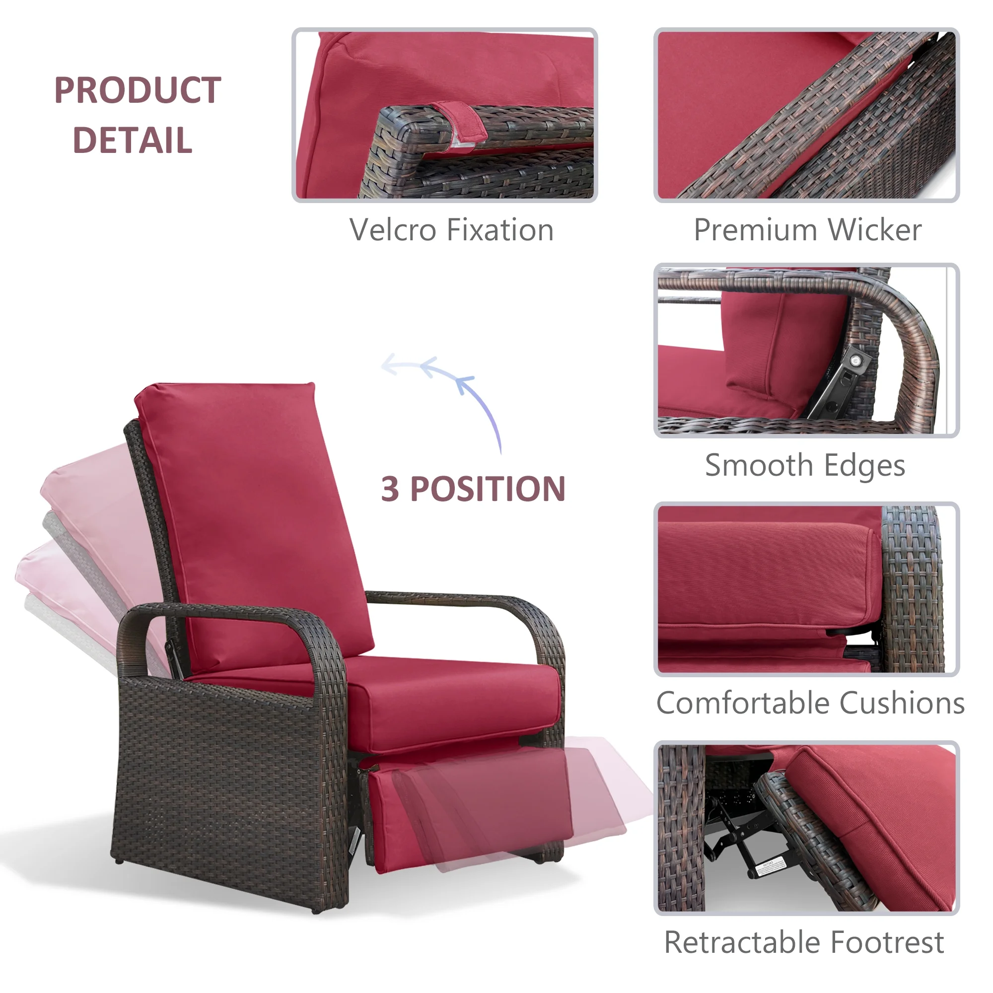 CoSoTower Indoor & Outdoor Recliner, All-Weather Wicker Reclining Patio Chair, Red Cushion (Red, 1 Chair)