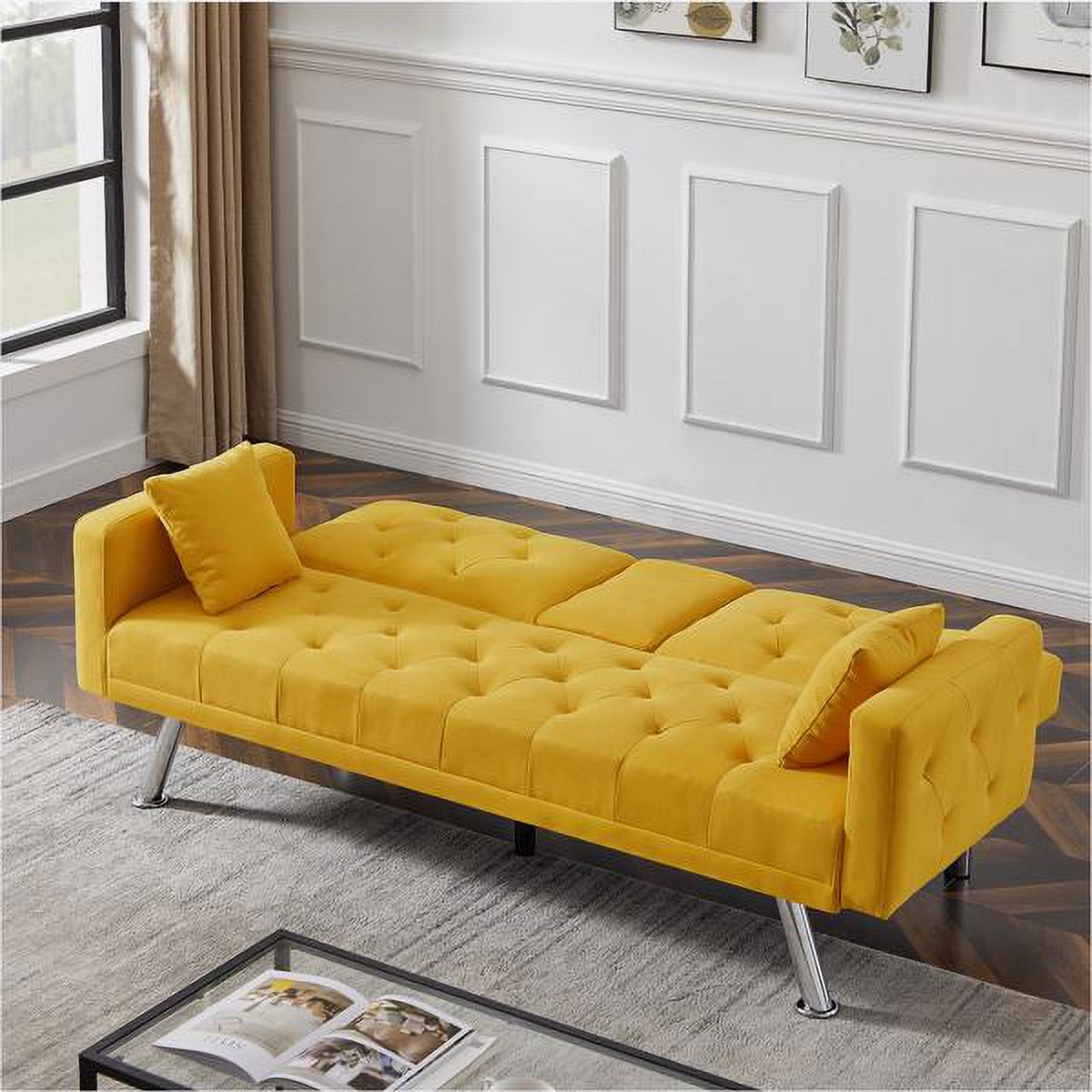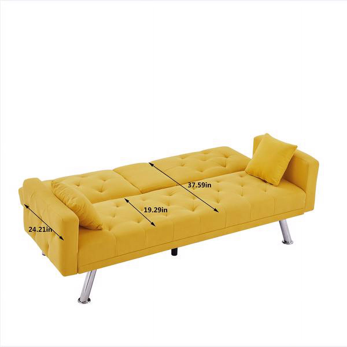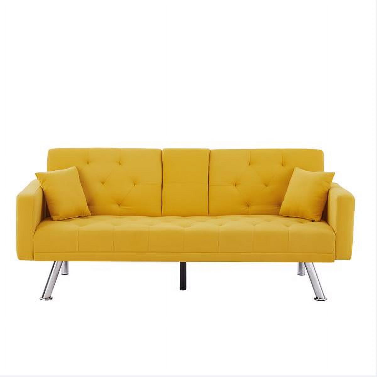Yellow Linen Convertible Sofa and Bed, Square Arm Armrests, Can Hold Water Cup, Two Pillow