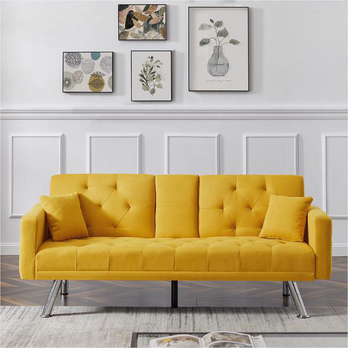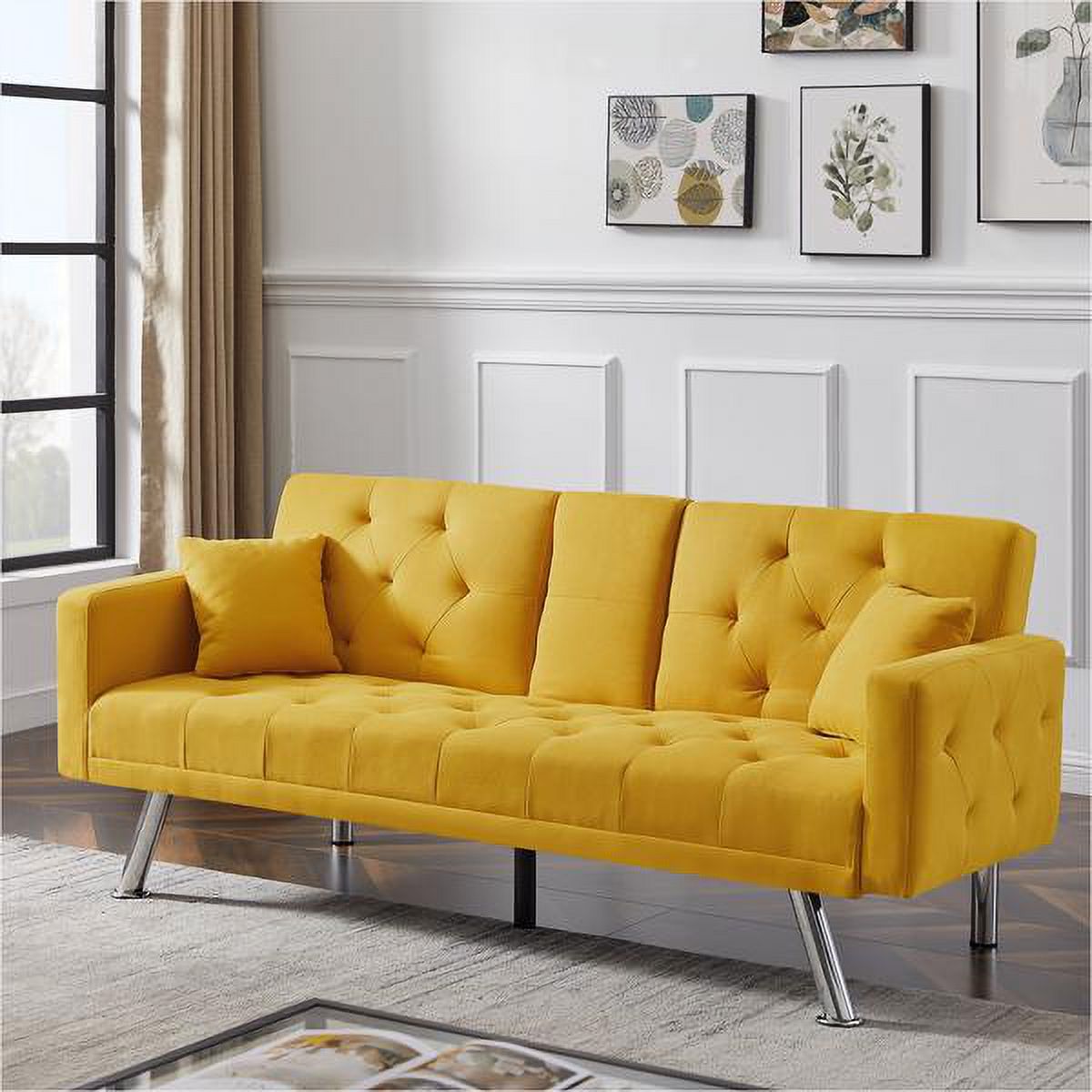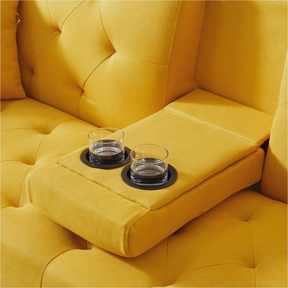 Yellow Linen Convertible Sofa and Bed, Square Arm Armrests, Can Hold Water Cup, Two Pillow