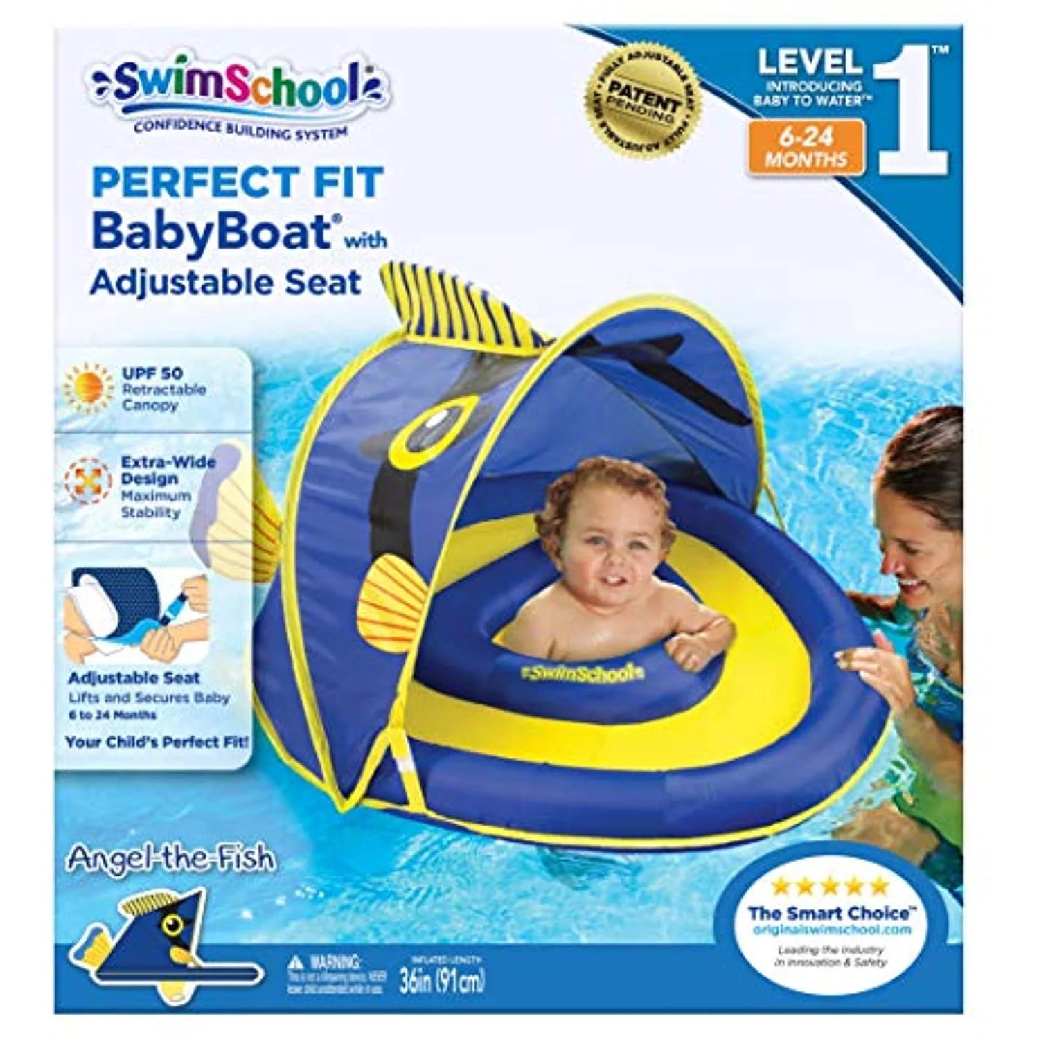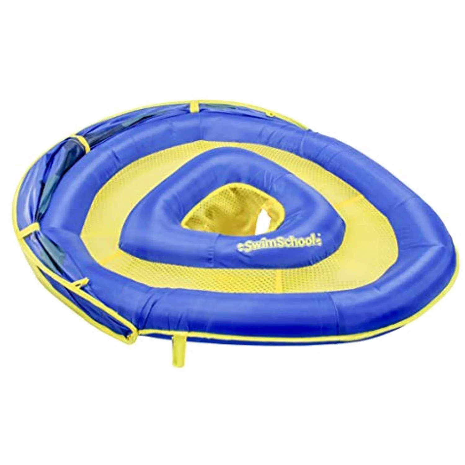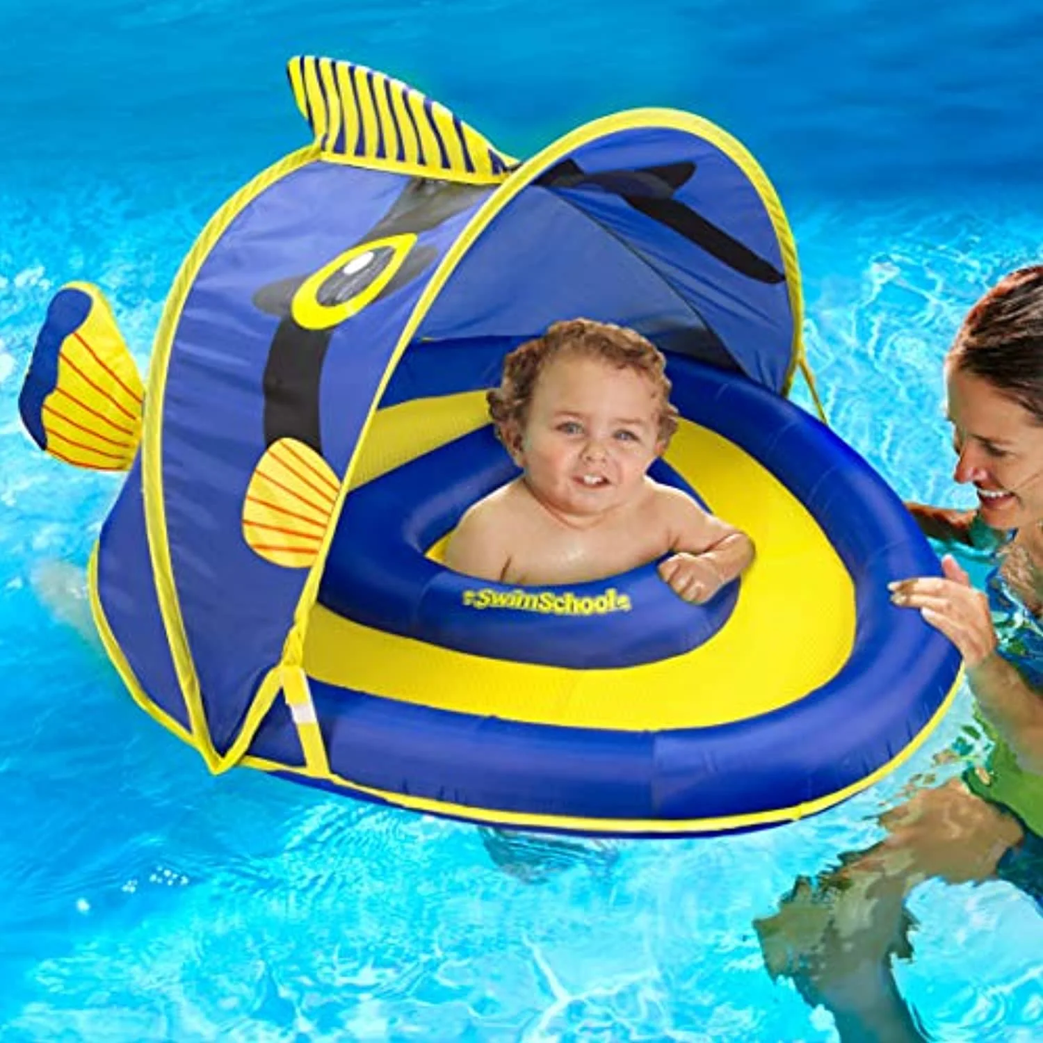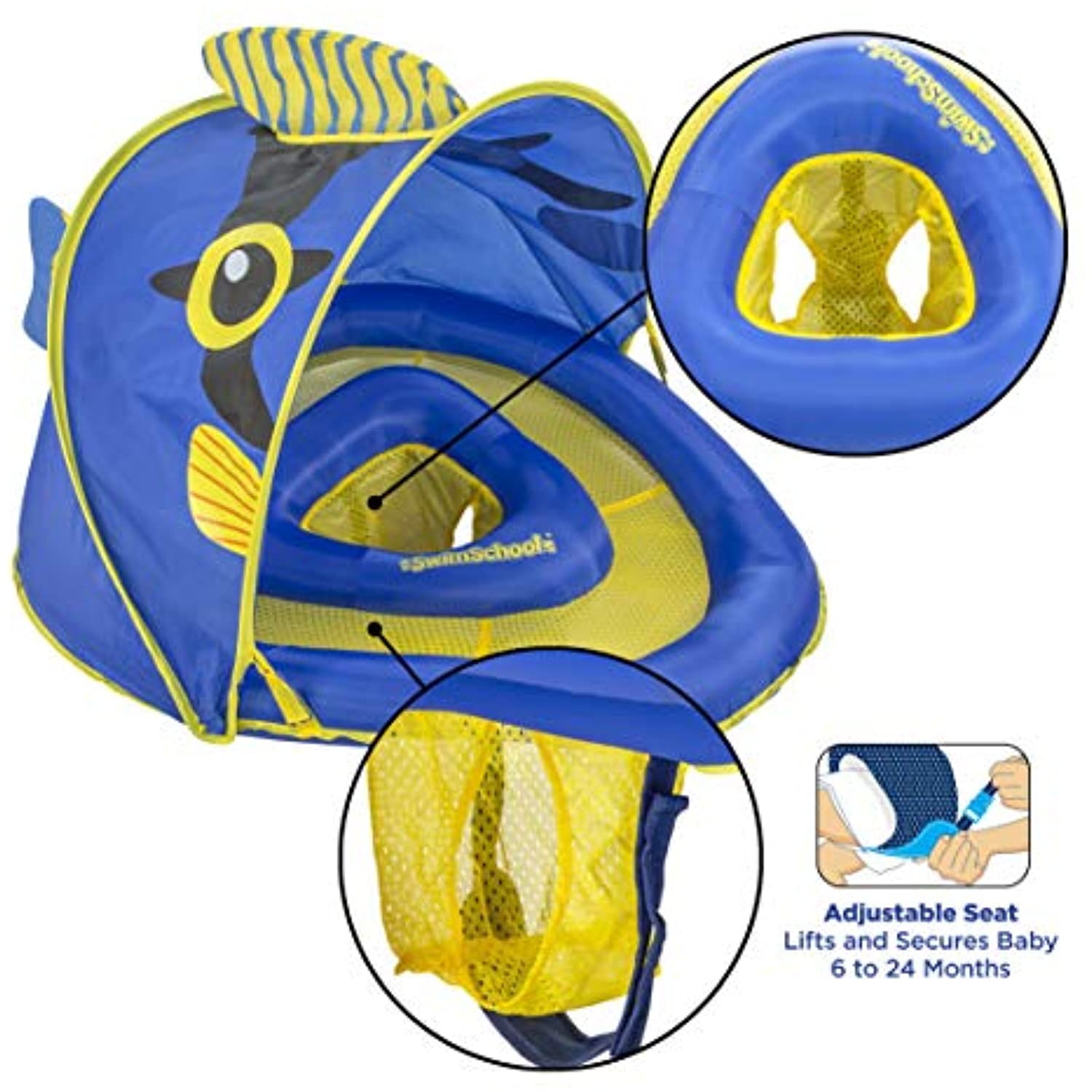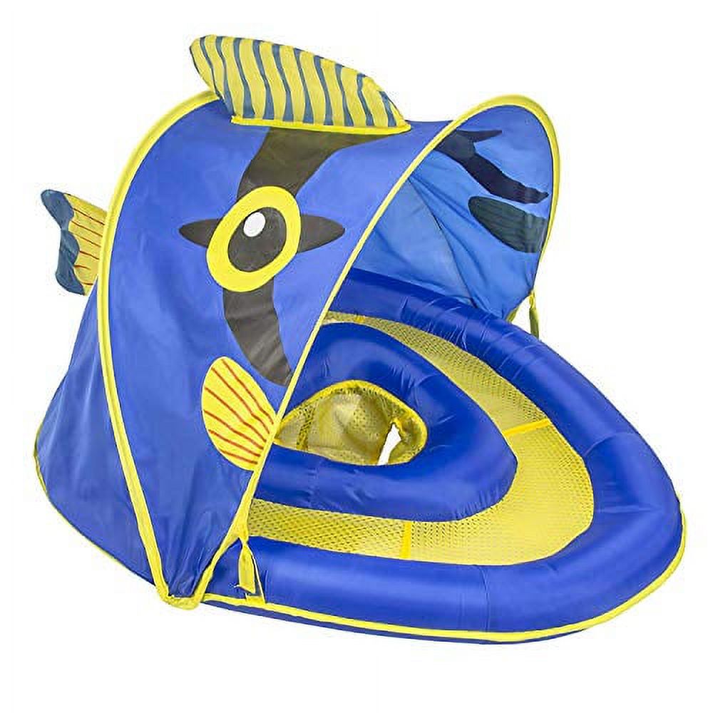 SwimSchool Angel-the-Fish Fabric Baby Pool Float, Splash & Play Activity Center,Dual Air Pillow Chambers w/Retractable Canopy & Adjustable Safety Seat, Baby Float, UPF 50, 6 To 24 Months, Blue/Yellow