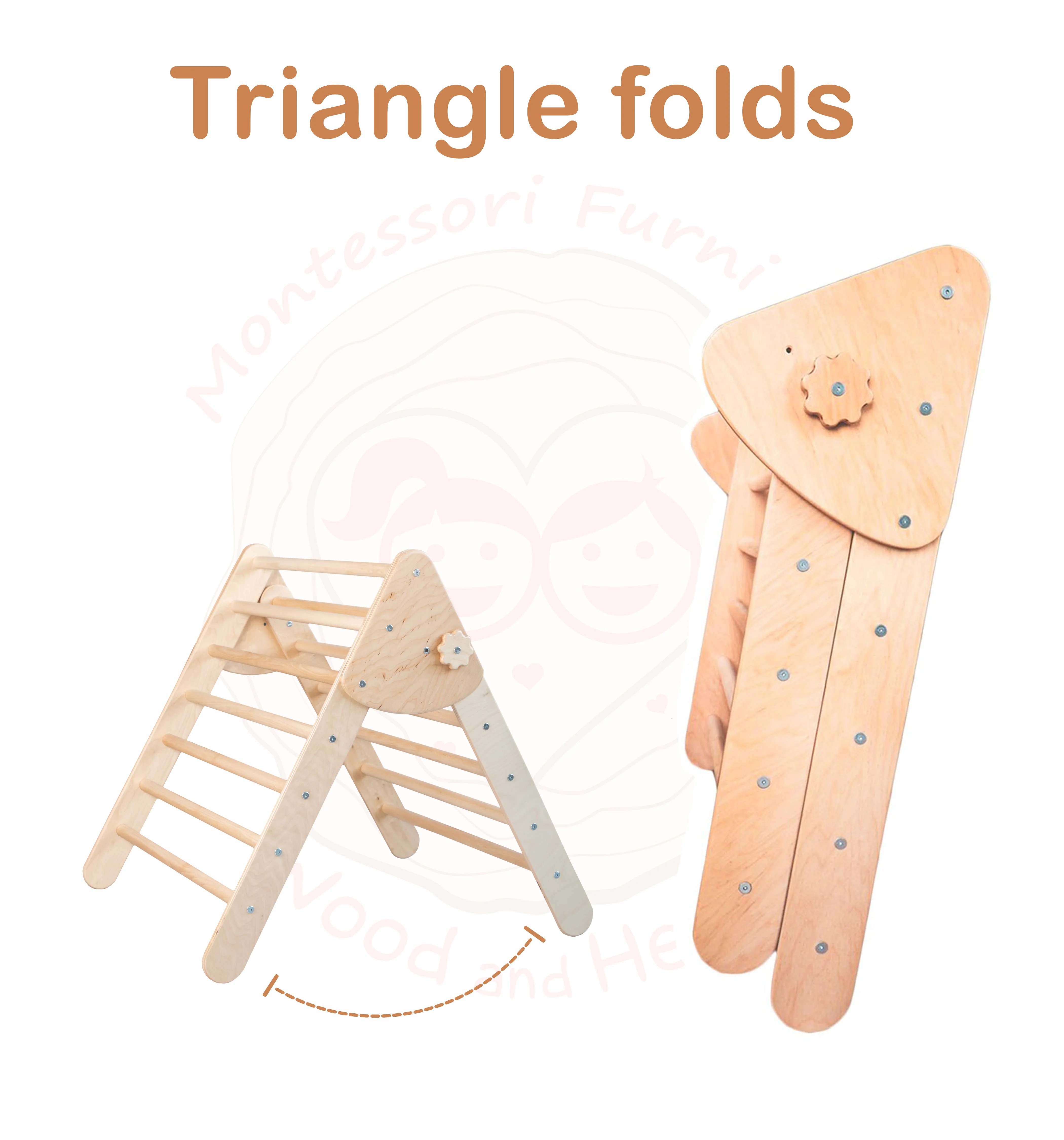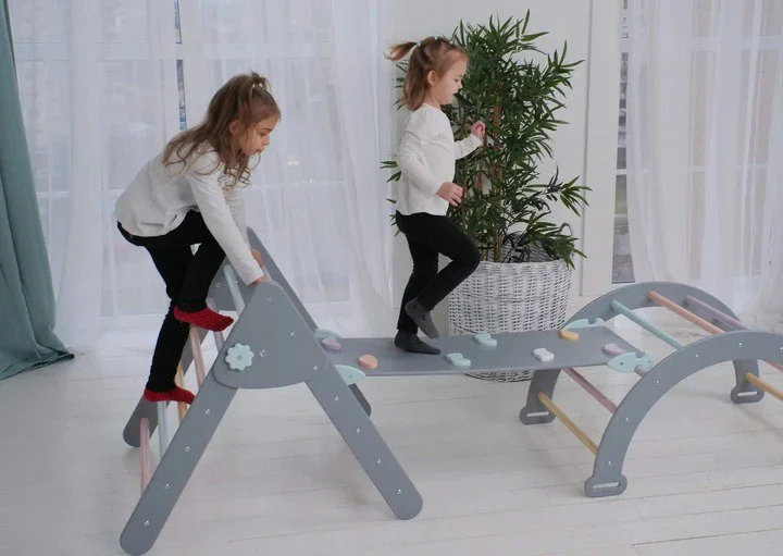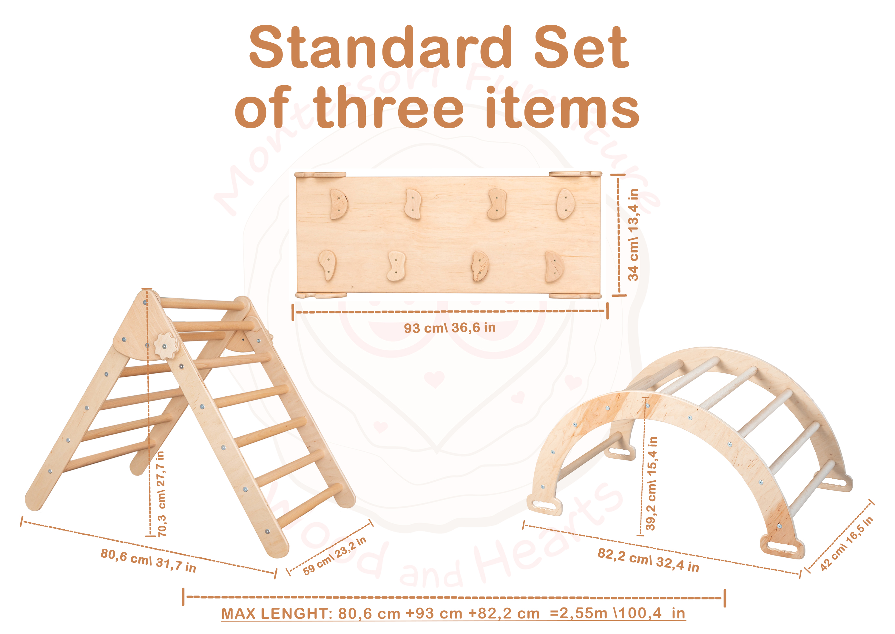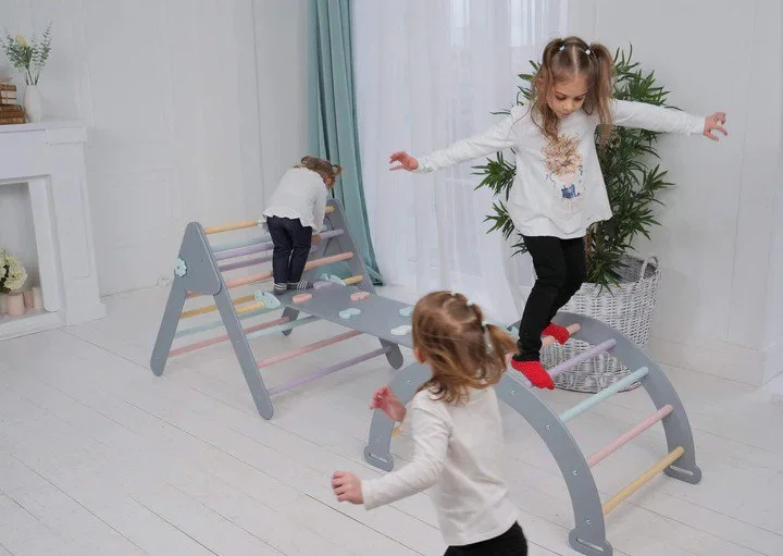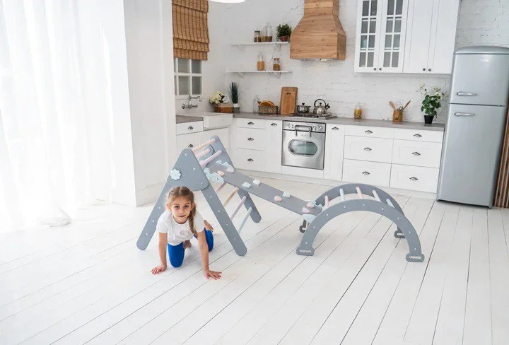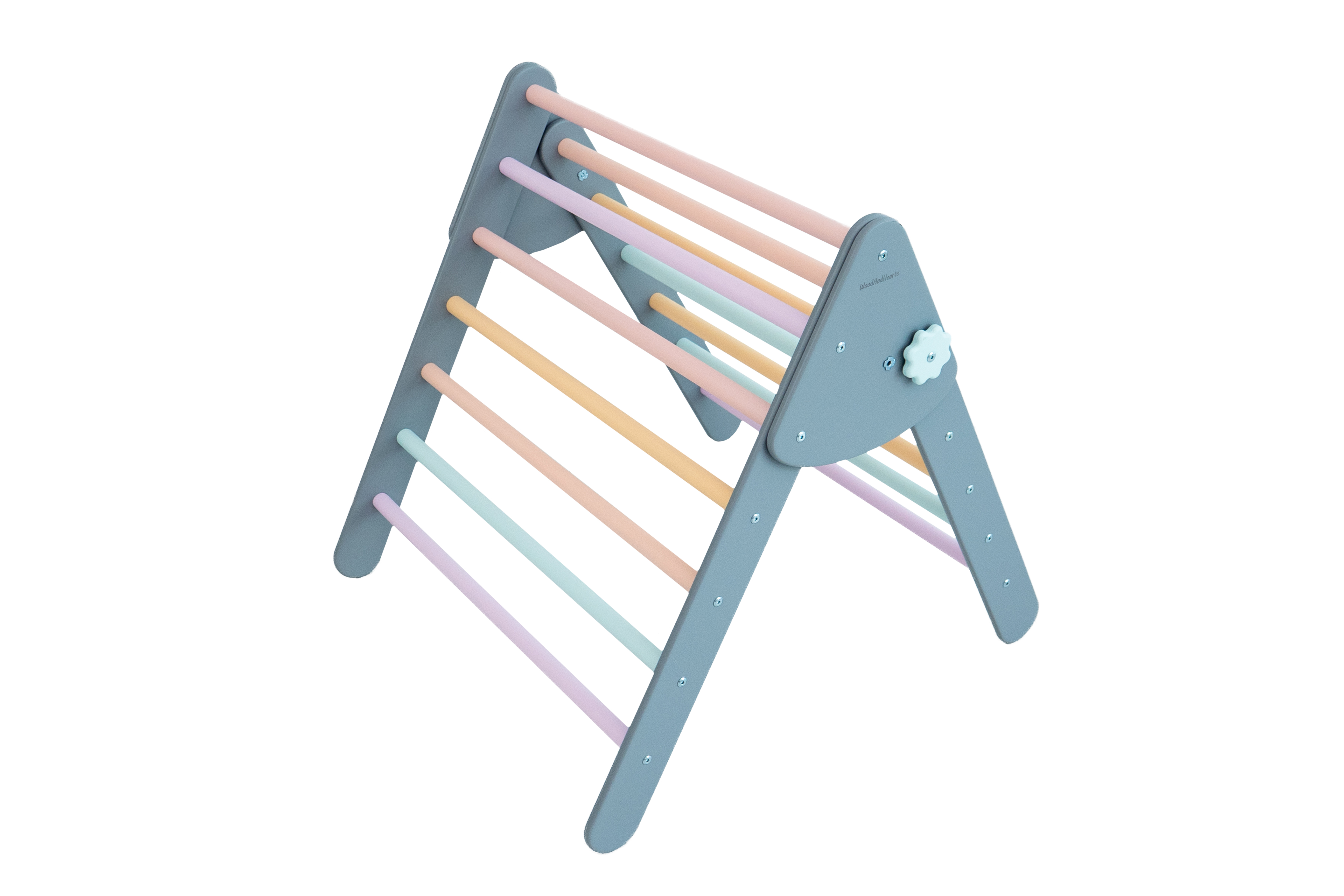 Woodandhearts Montessori Set, Baby gym: Foldable step Triangle + Toddler Ladder + Climbing Arch, Pastel and Gray color, Large size, for Kids 2-8 years