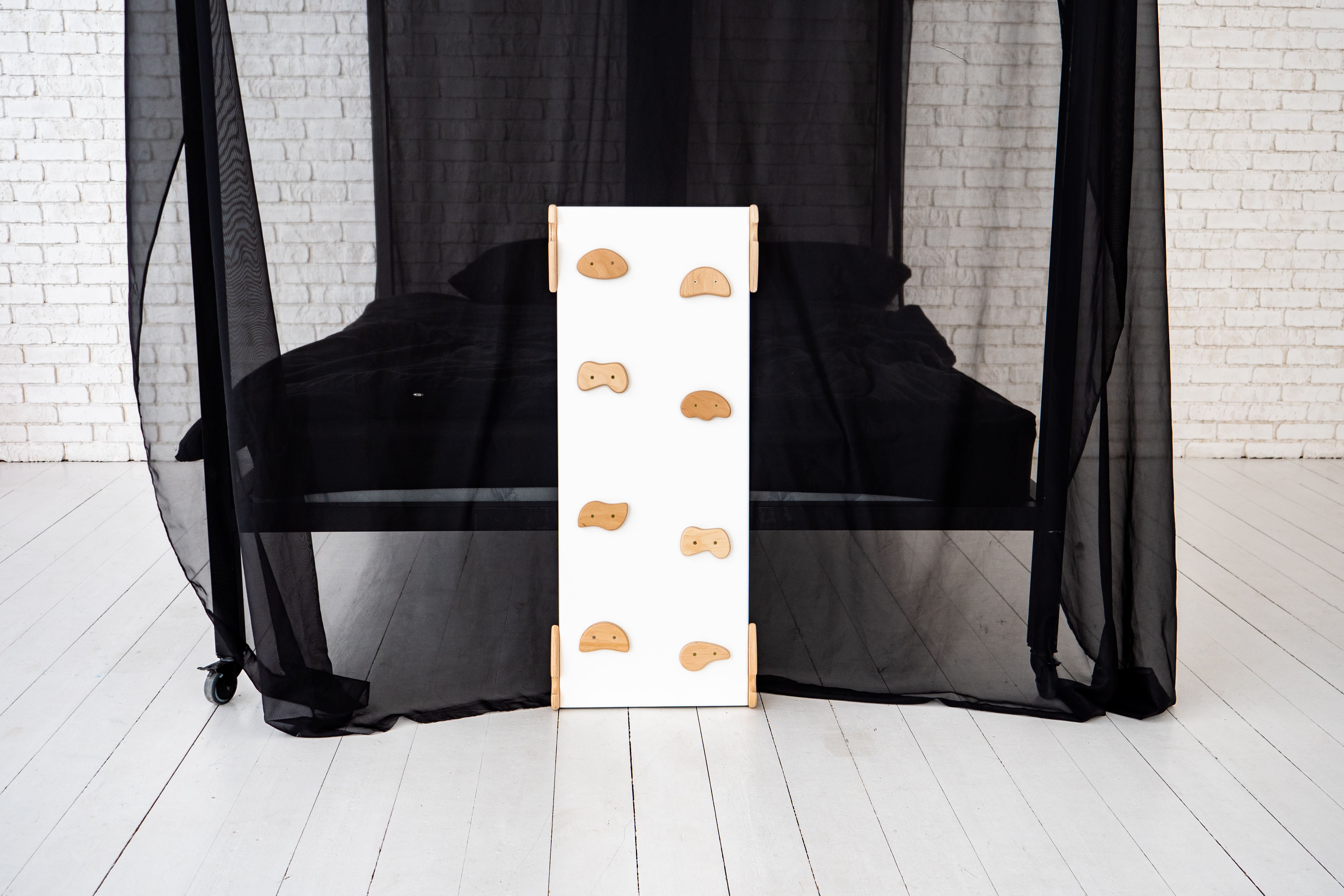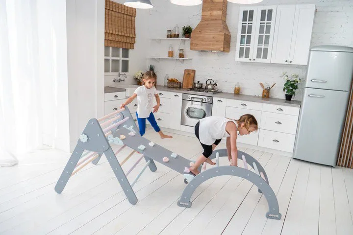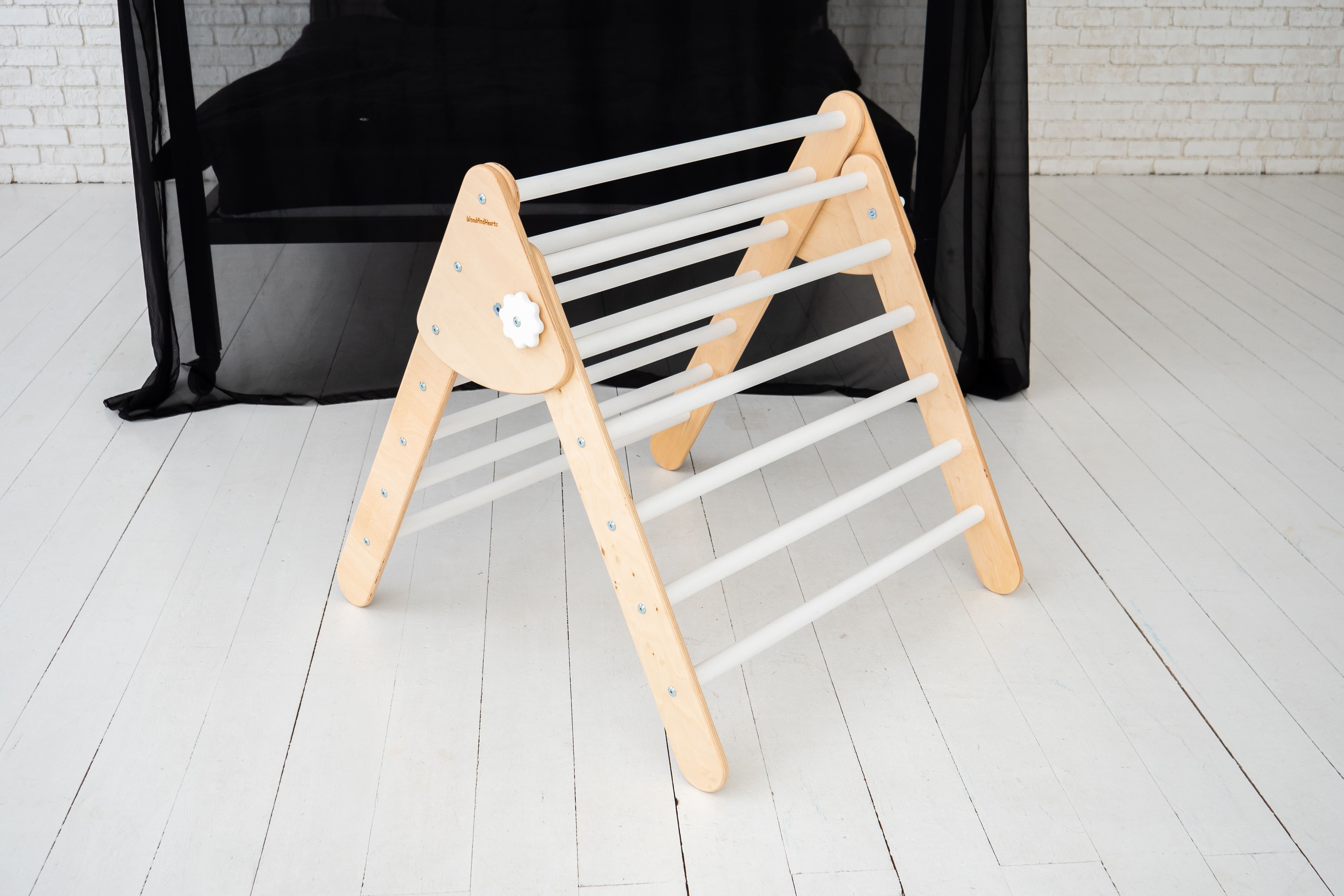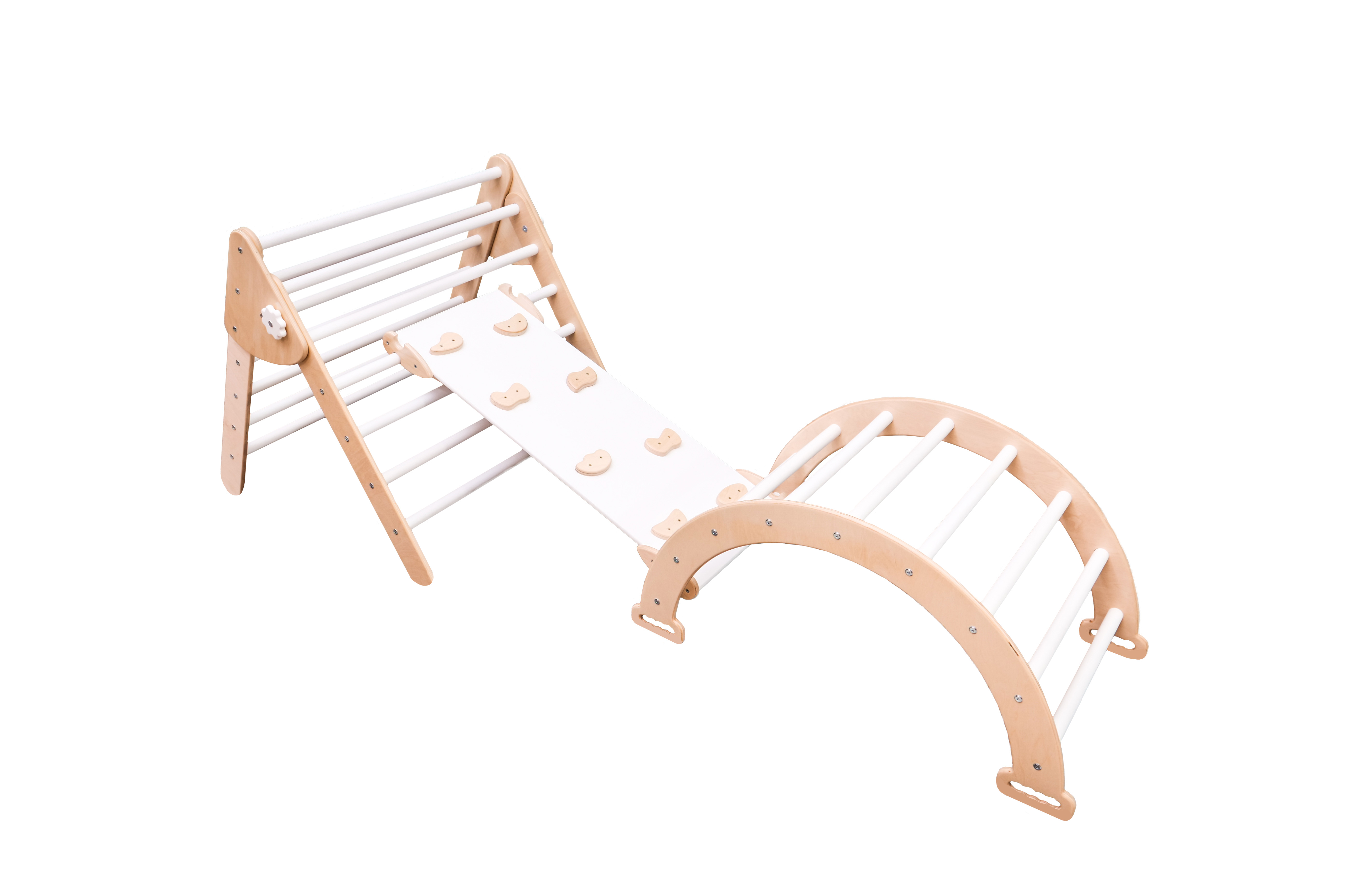 Woodandhearts Montessori Set, Baby gym: Foldable step Triangle + Toddler Ladder + Climbing Arch, Pastel and Gray color, Large size, for Kids 2-8 years