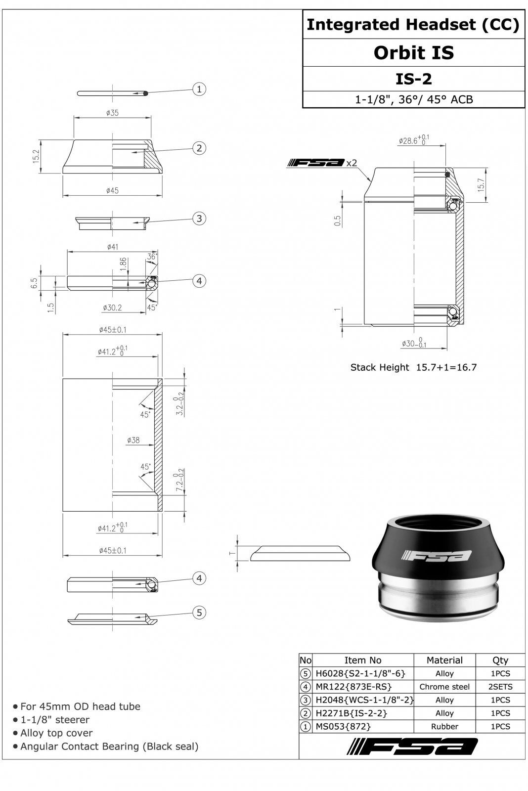 FSA Orbit IS-2 1 1/8 Threadless OD 45mm Road Bike Integrated Headset W/ Top Cap #XTE1535
