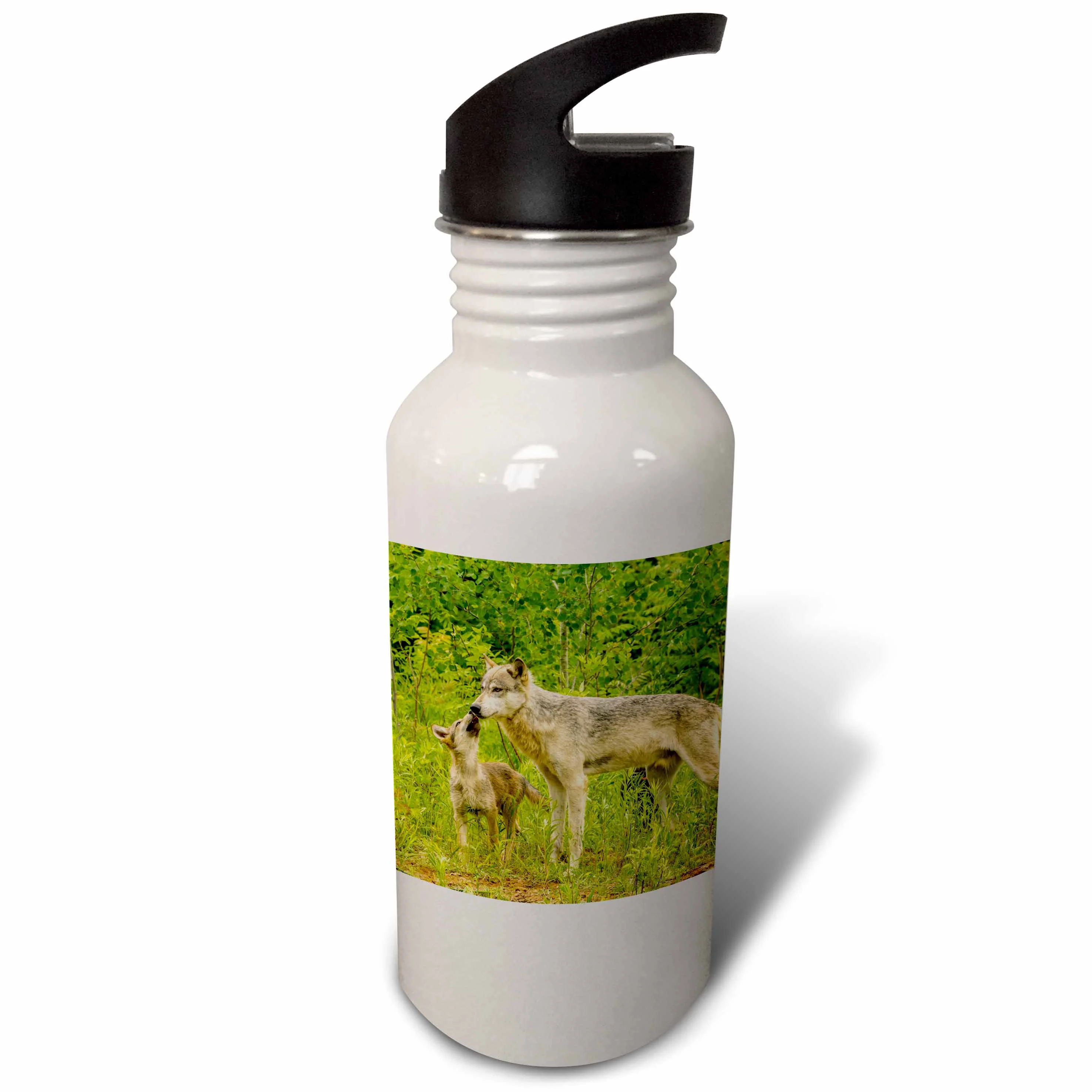 Minnesota, Pine County. Adult wolf and pup. Flip Straw 21oz Water Bottle wb-346622-2