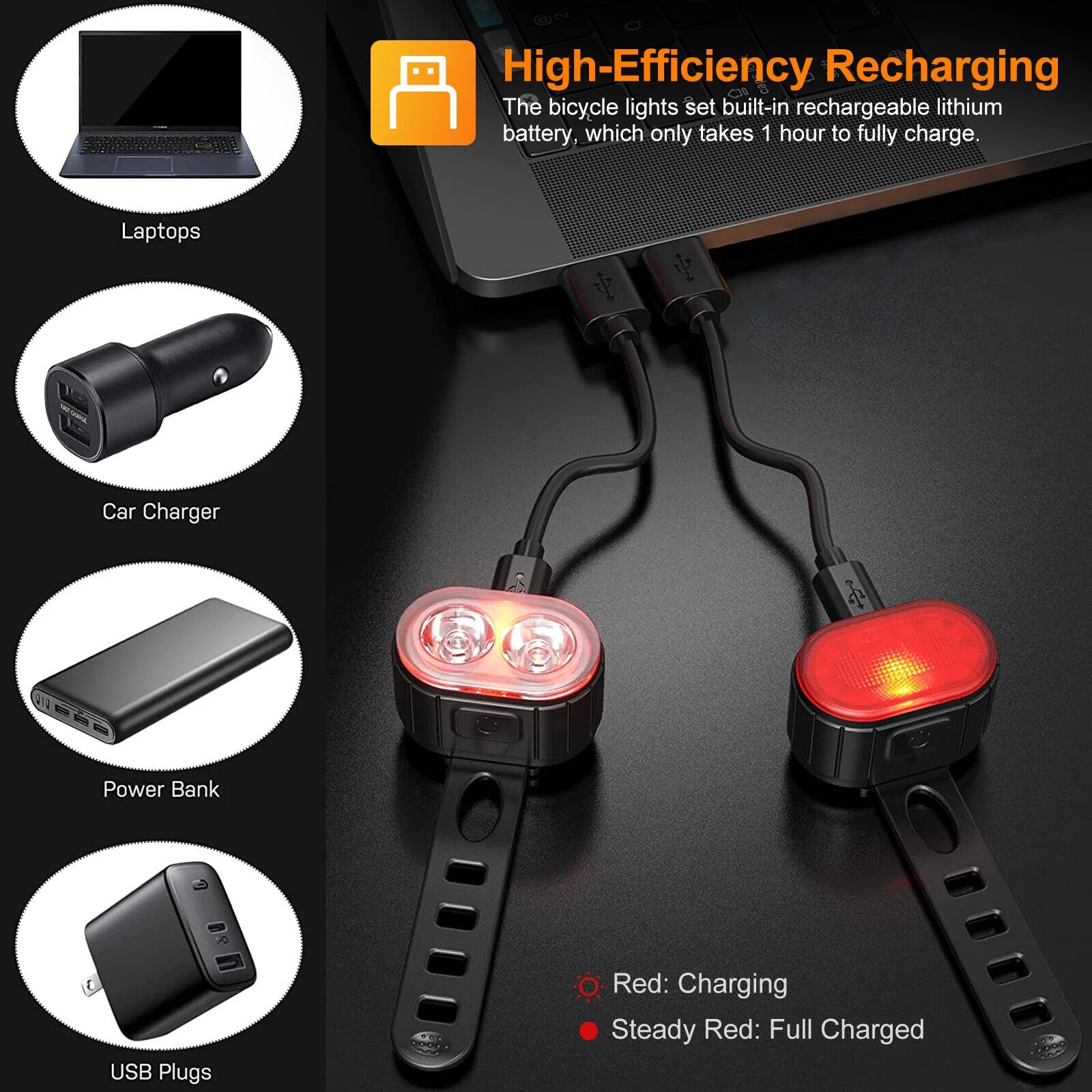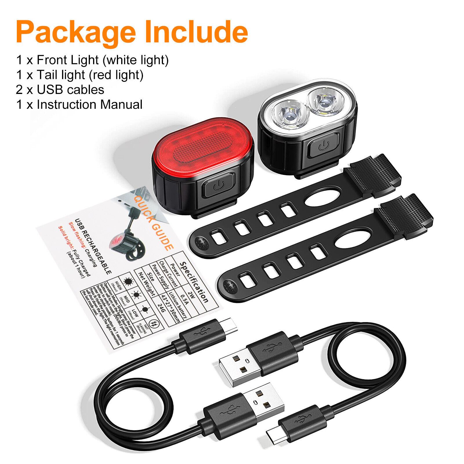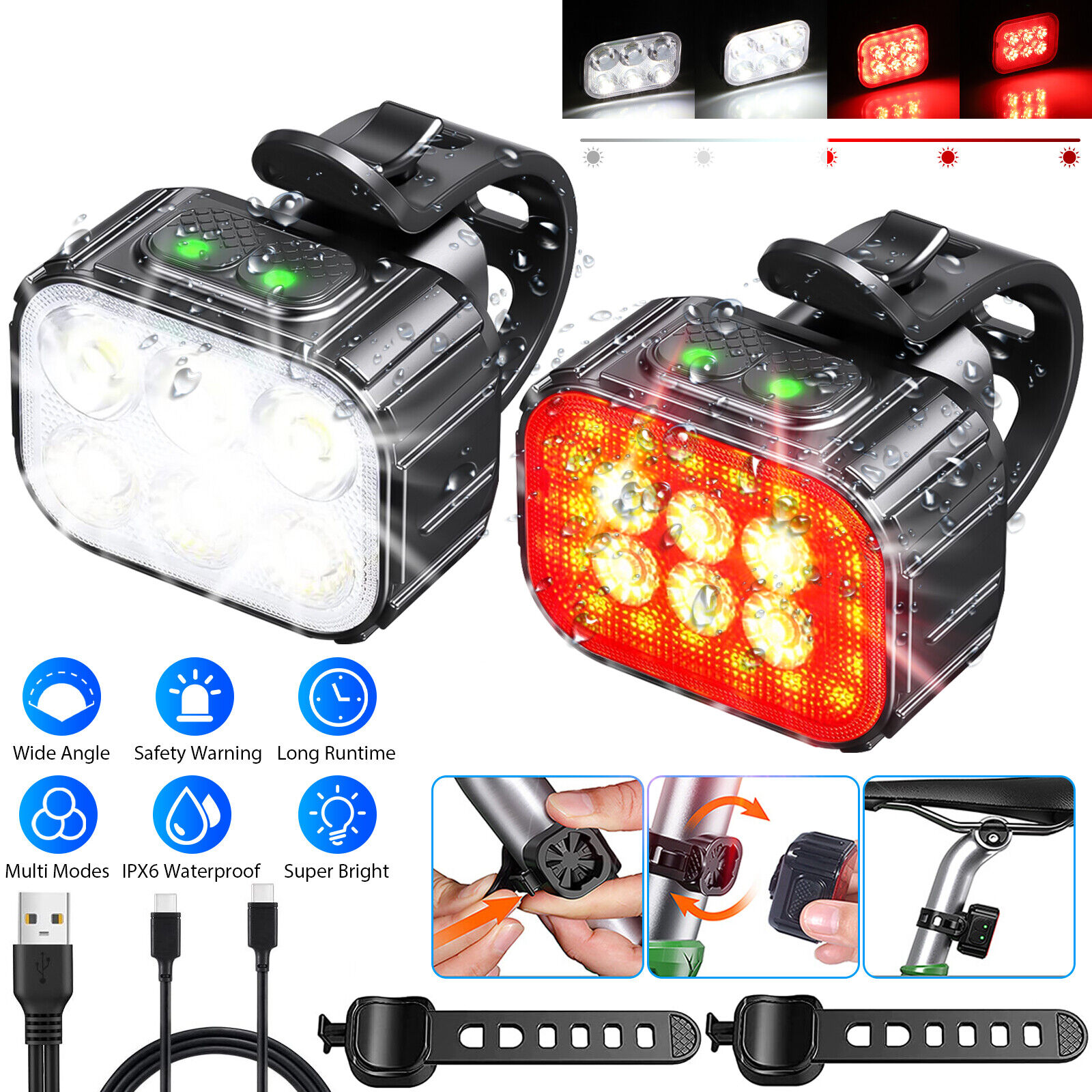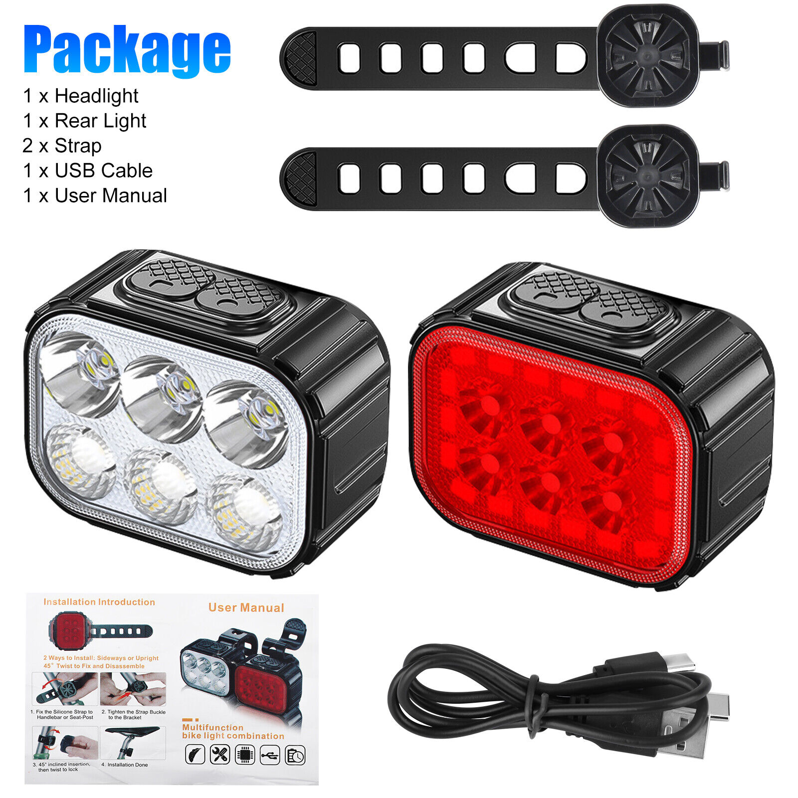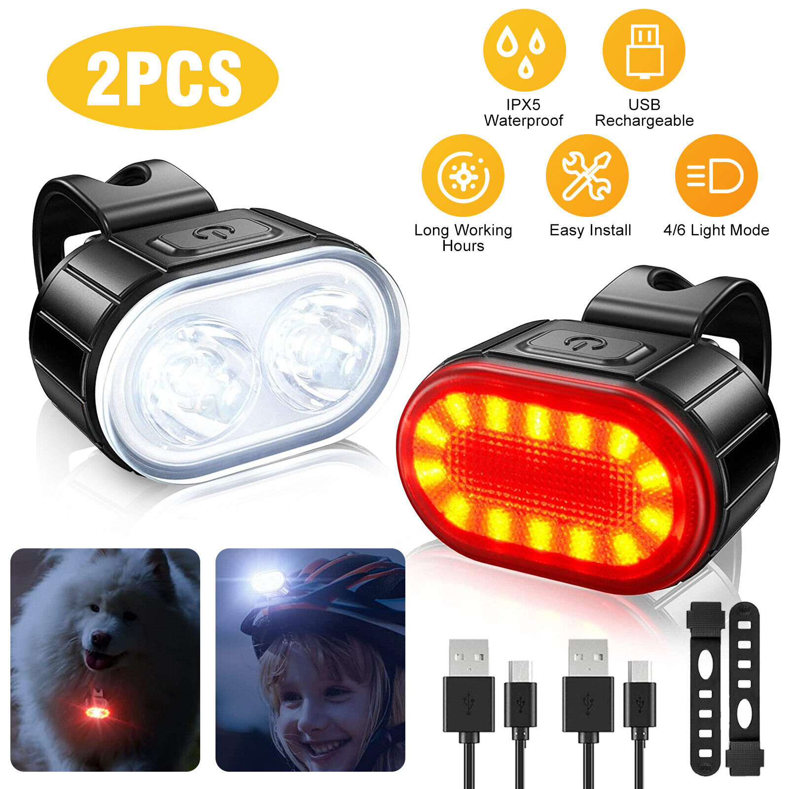 2x USB Rechargeable LED Bicycle Headlight Taillight Bike Front Rear Lamp Cycling
