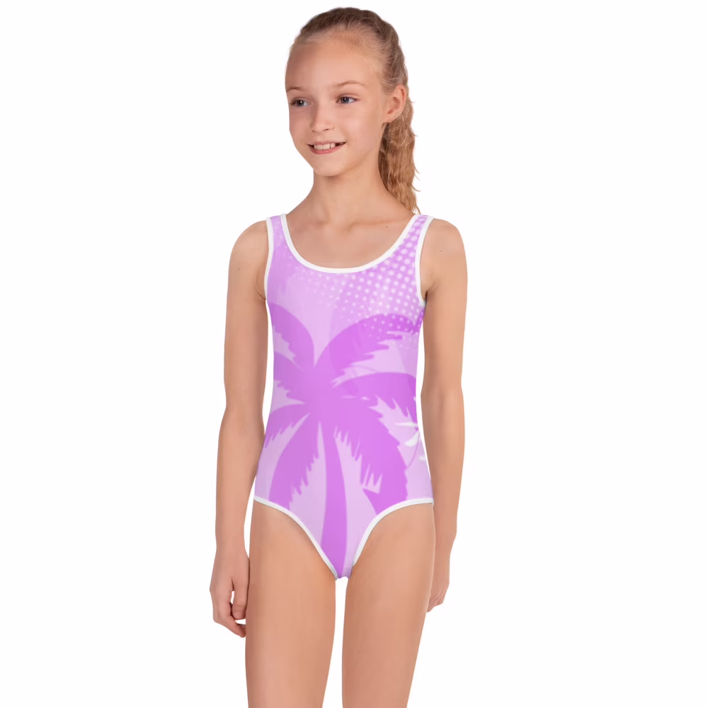 Light Lavender Palm Tree One Piece Girl's Swimsuit, Swimwear for Kids (6X)