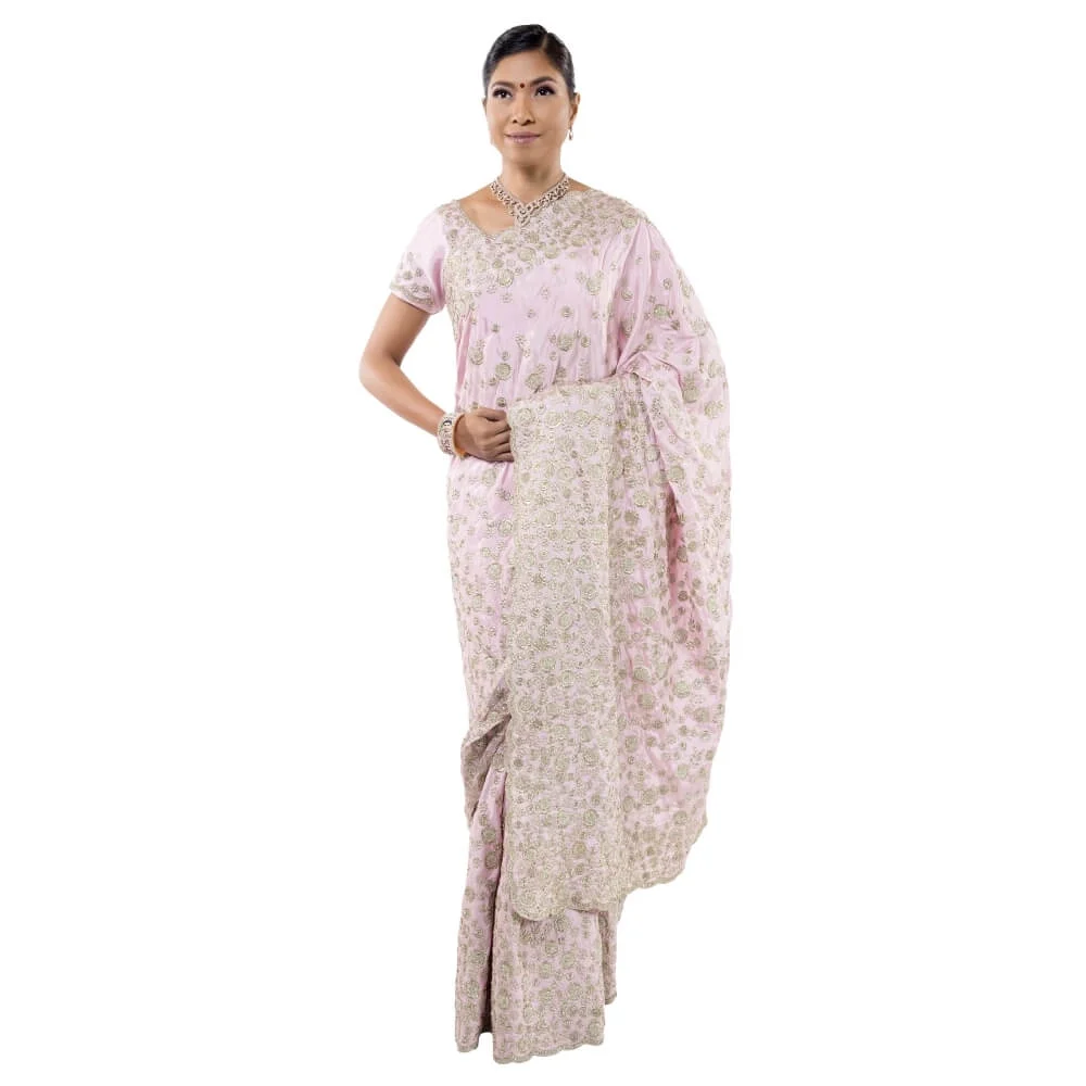 Satin Silk saree with bead work embroidery - Pink Size: XXS, Color: Pink