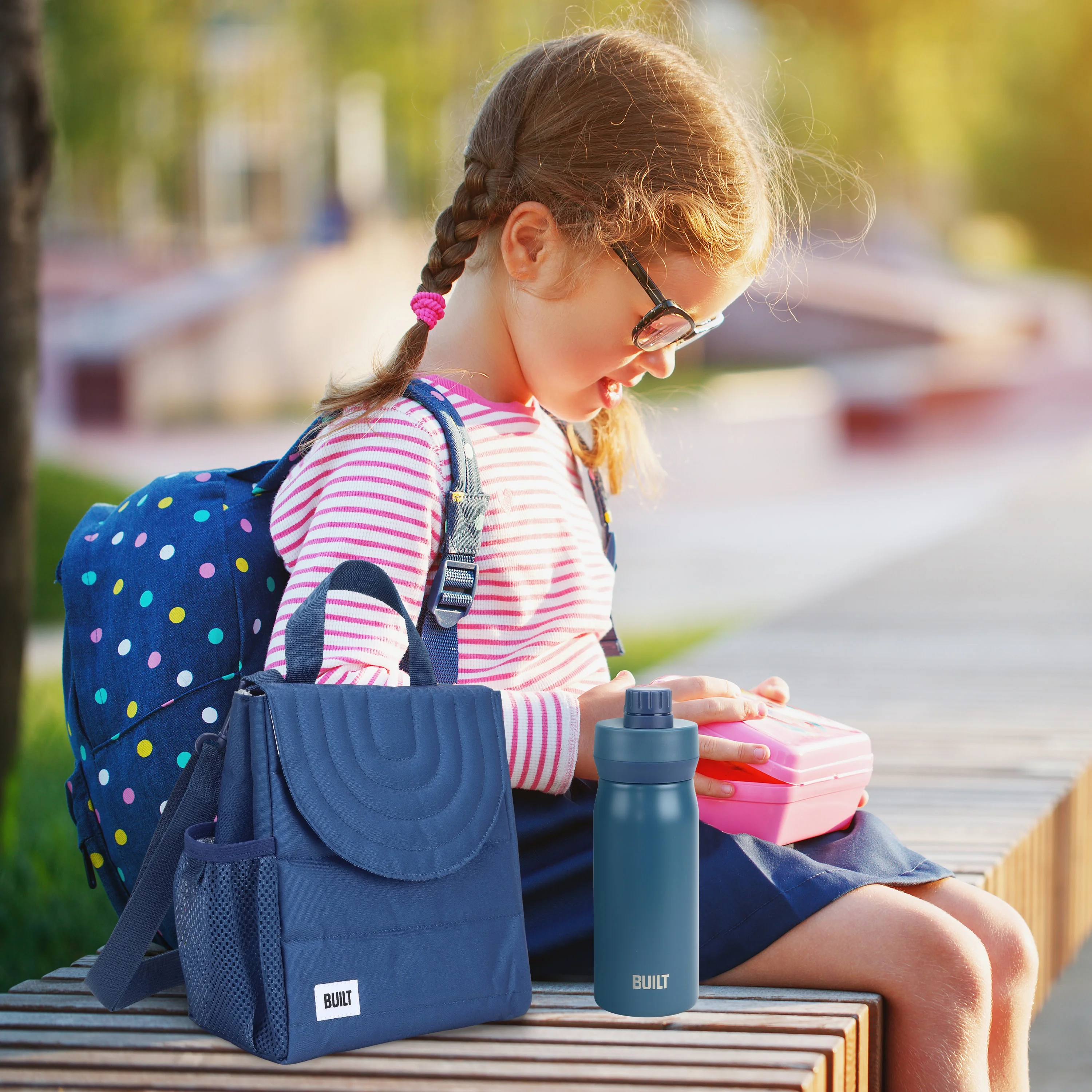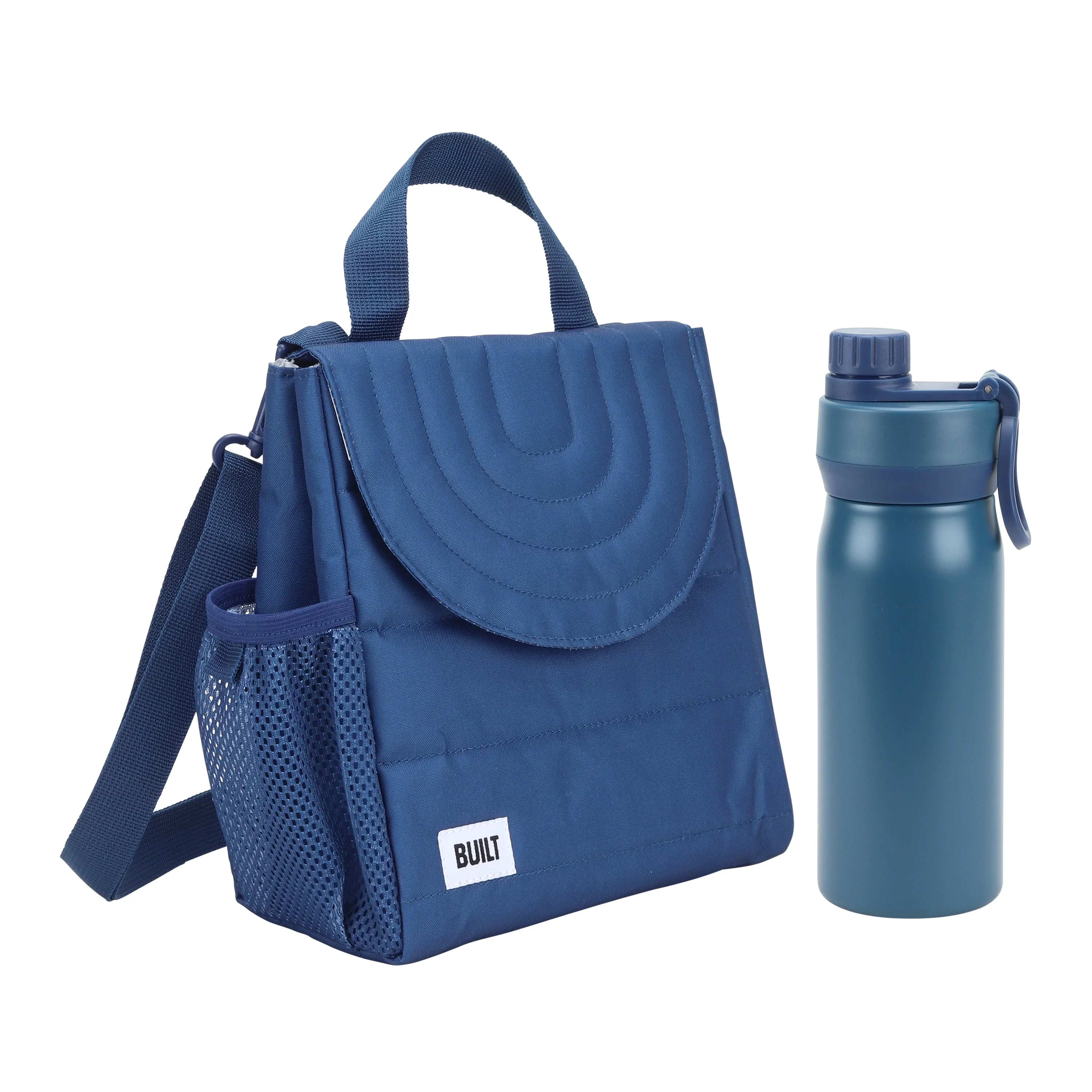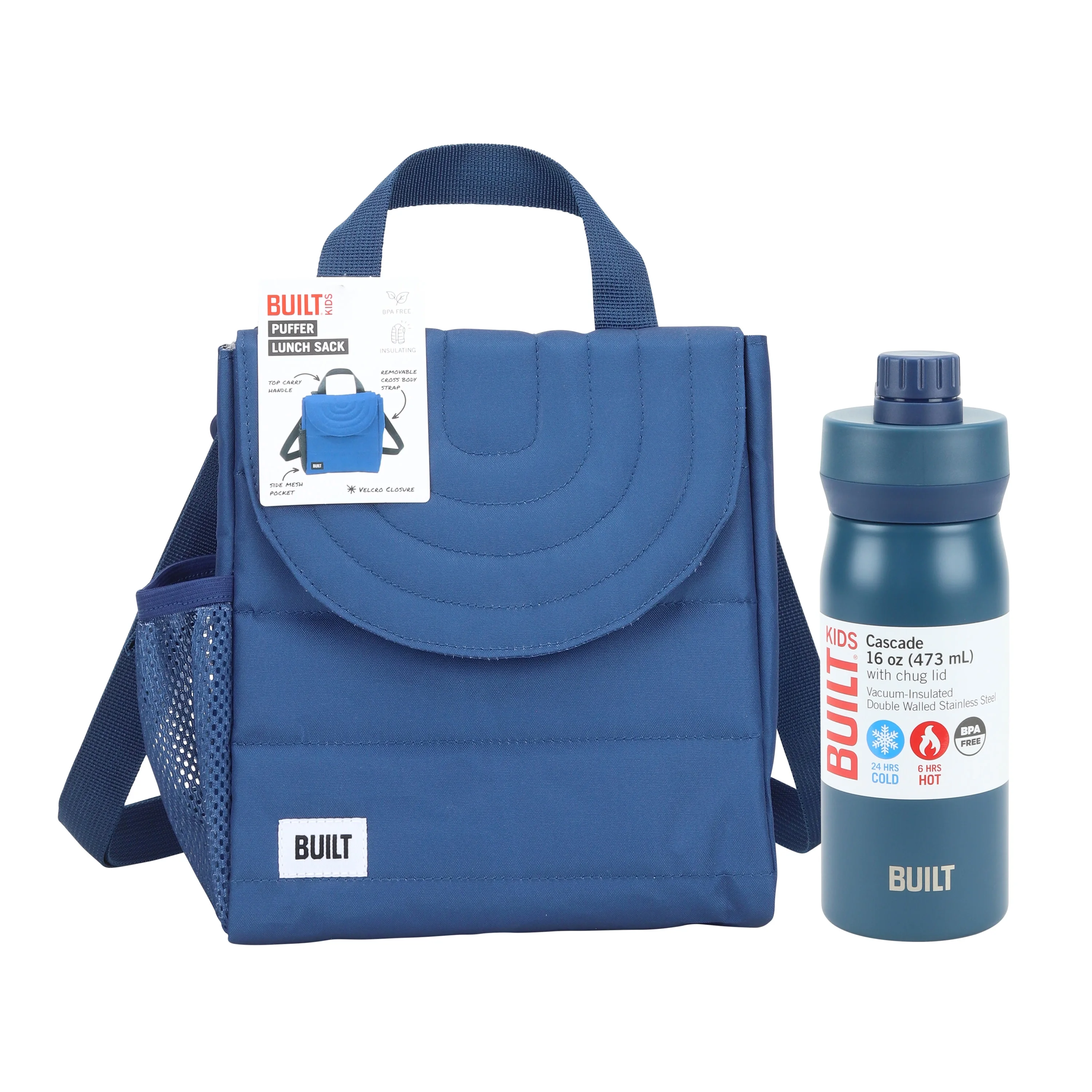 Built Kids Reusable Lunch Bag and 16 fl oz Cascade Stainless Steel Water Bottle Chug Lid Bundle Blue