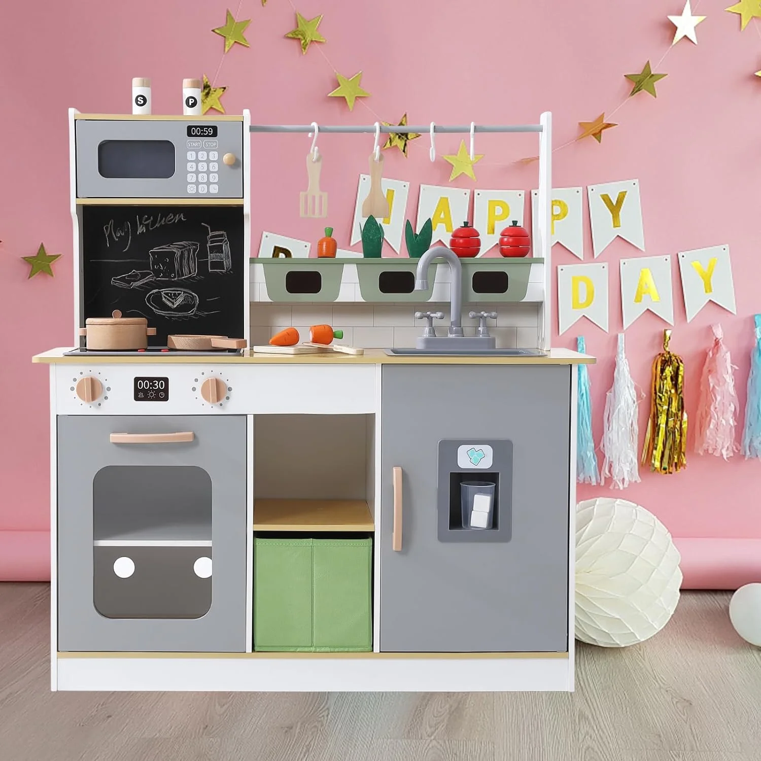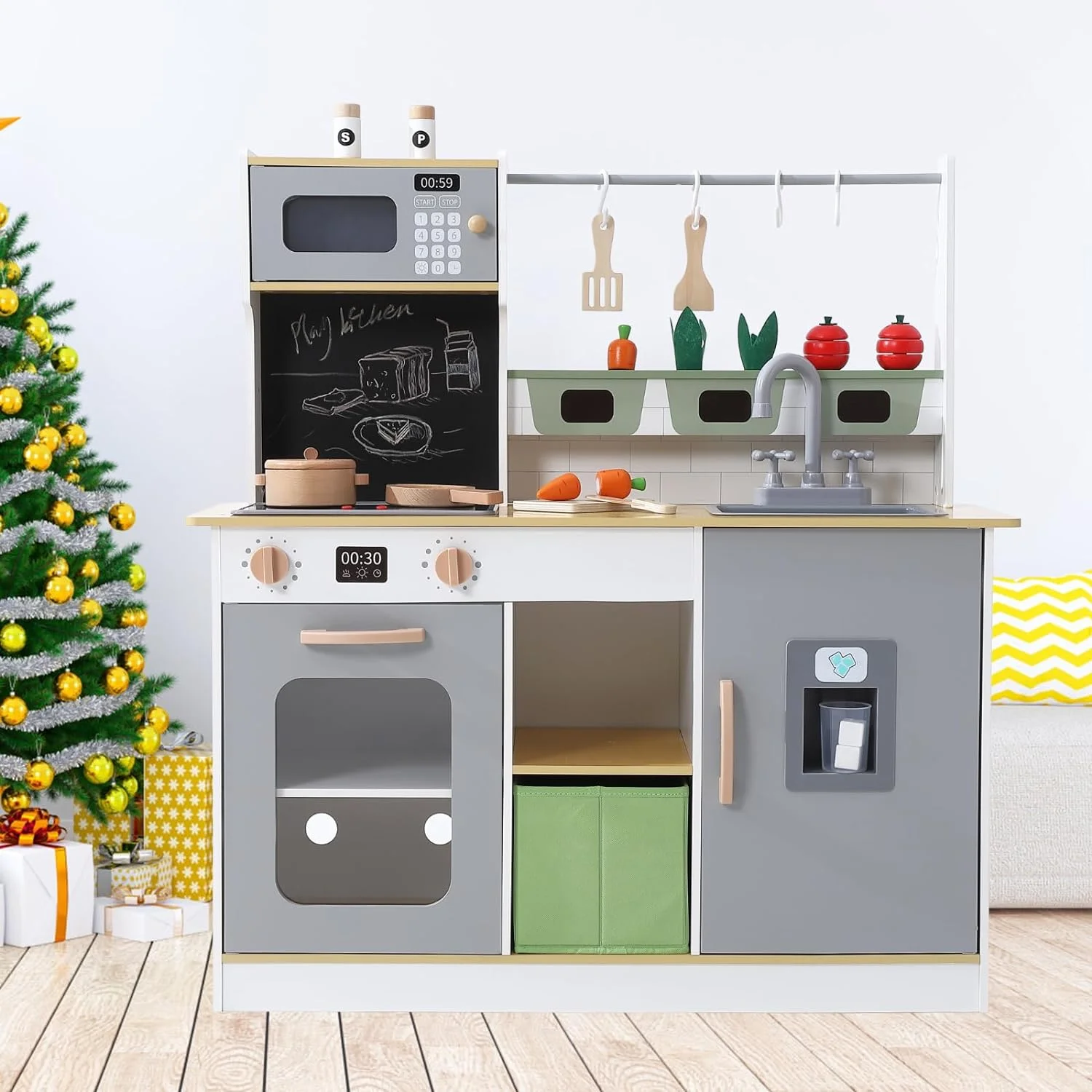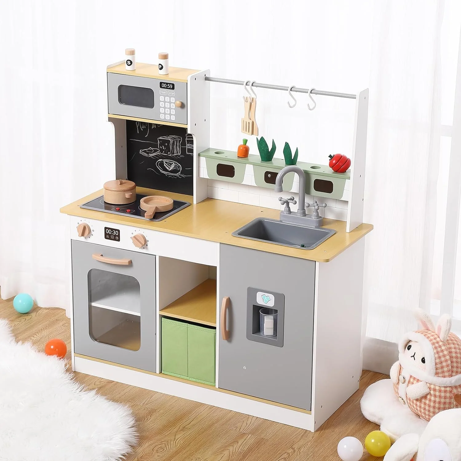Play Kitchen for Toddlers with Cookware Accessories,Microwave,Refrigerator,Kids Kitchen Playset,Wooden Farm Chef Pretend Play Set