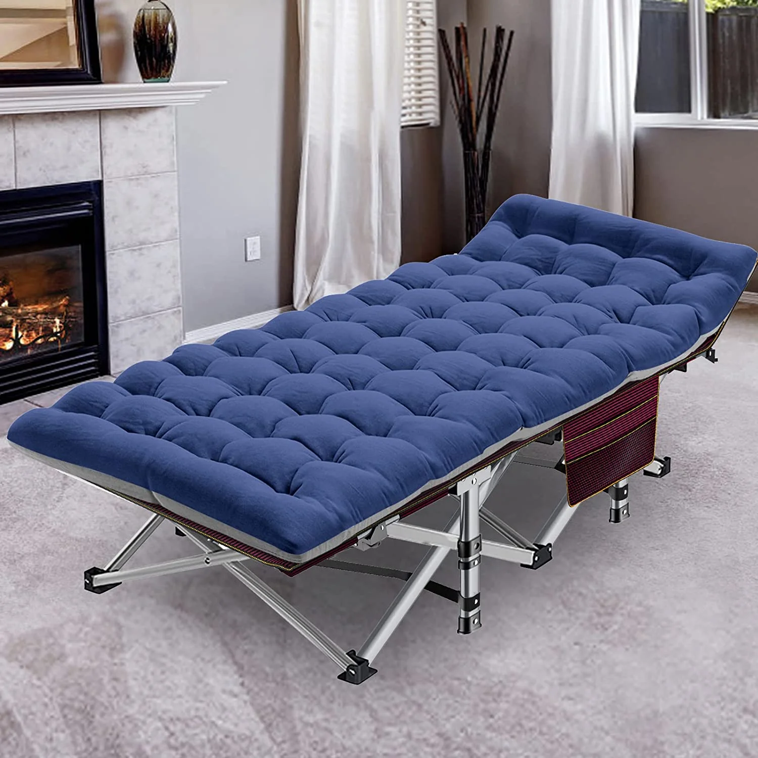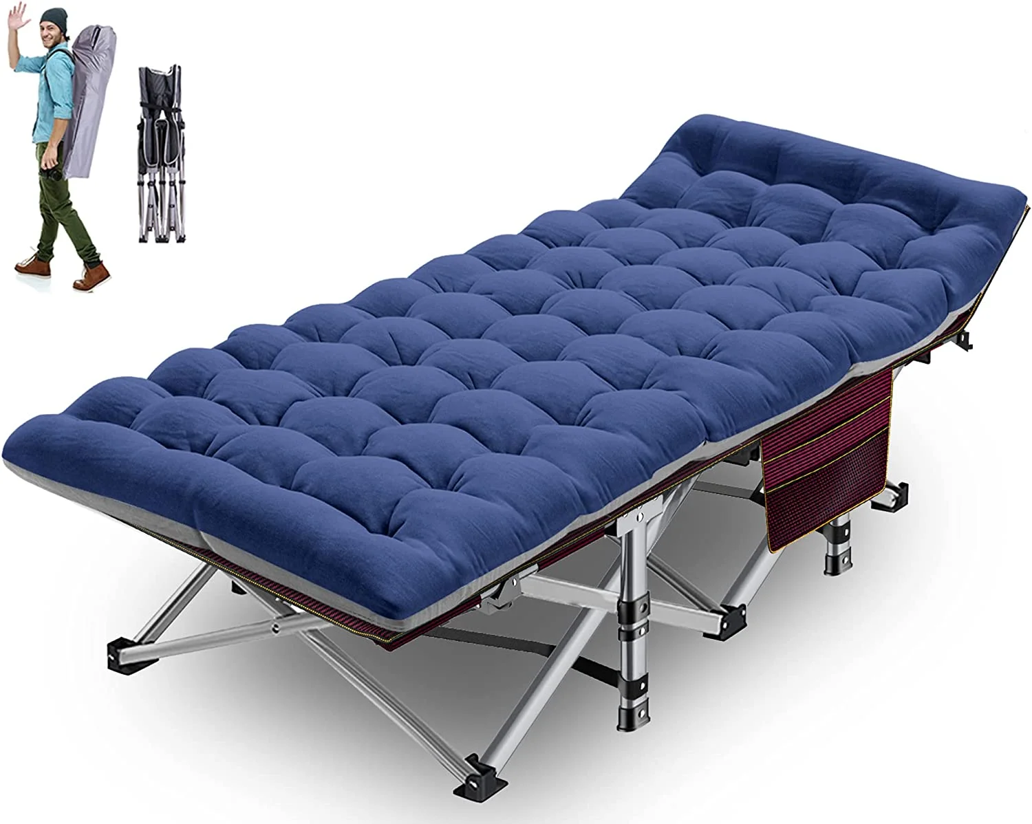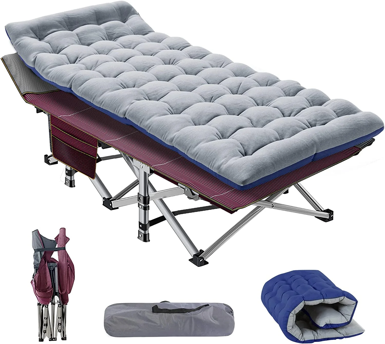Alden Design Portable Folding Camping Cot with Mat Carry Bag for Outdoor, Gray Cot/Blue Mat
