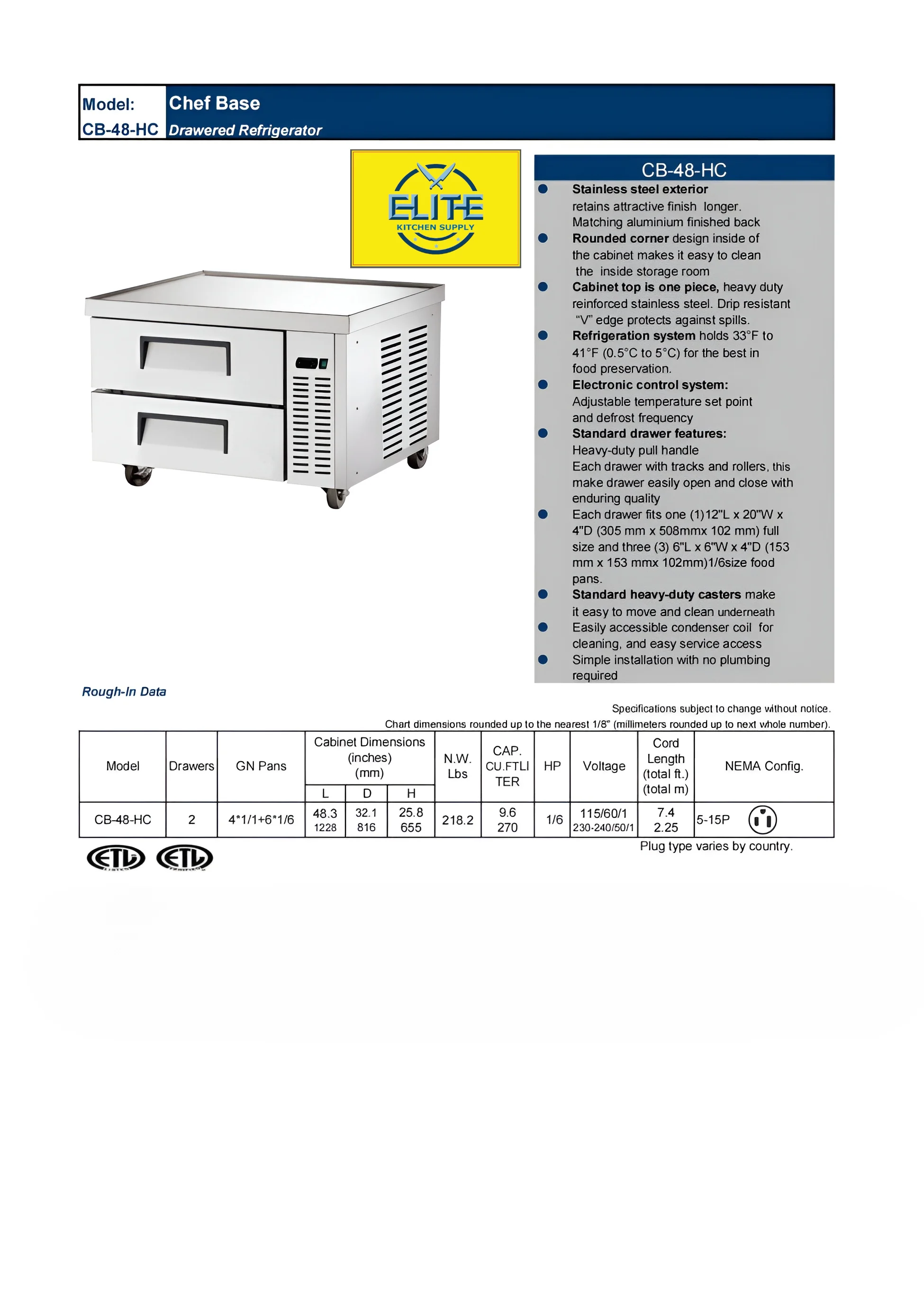 48 in. Chefs Base Stainless Steel Commercial Refrigerator, 9.6 Cu. ft.