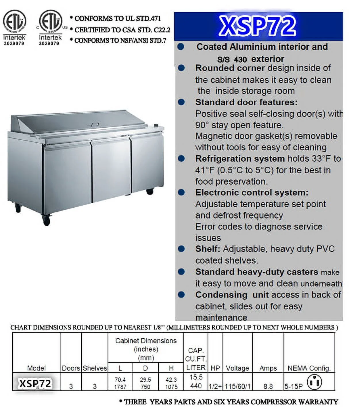 72" 3-door Commercial Refrigerated Sandwich Prep Table Salad Stainless Steel Refrigerator for Restaurant Kitchen 33℉-41℉