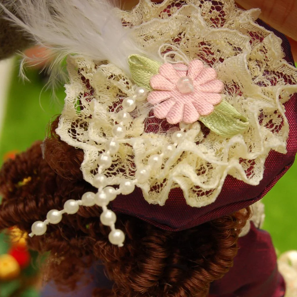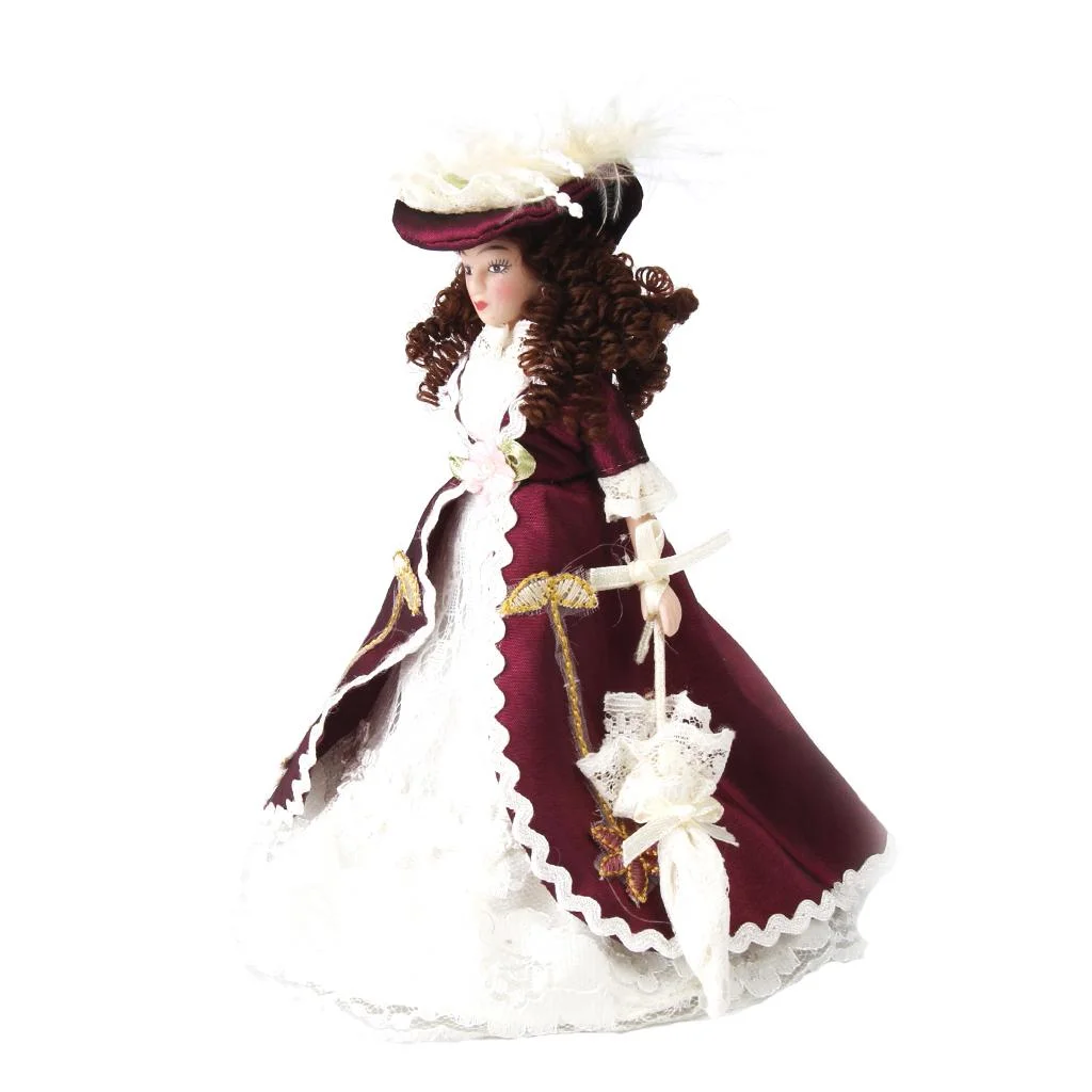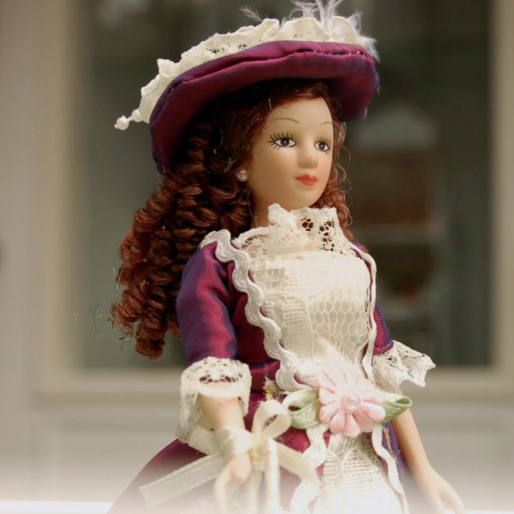 1:12 Scale Dollhouse Miniature People, Dolls Family Member Figures - Porcelain Women with Brown Curly Hair, in Elegant Dress and Hat