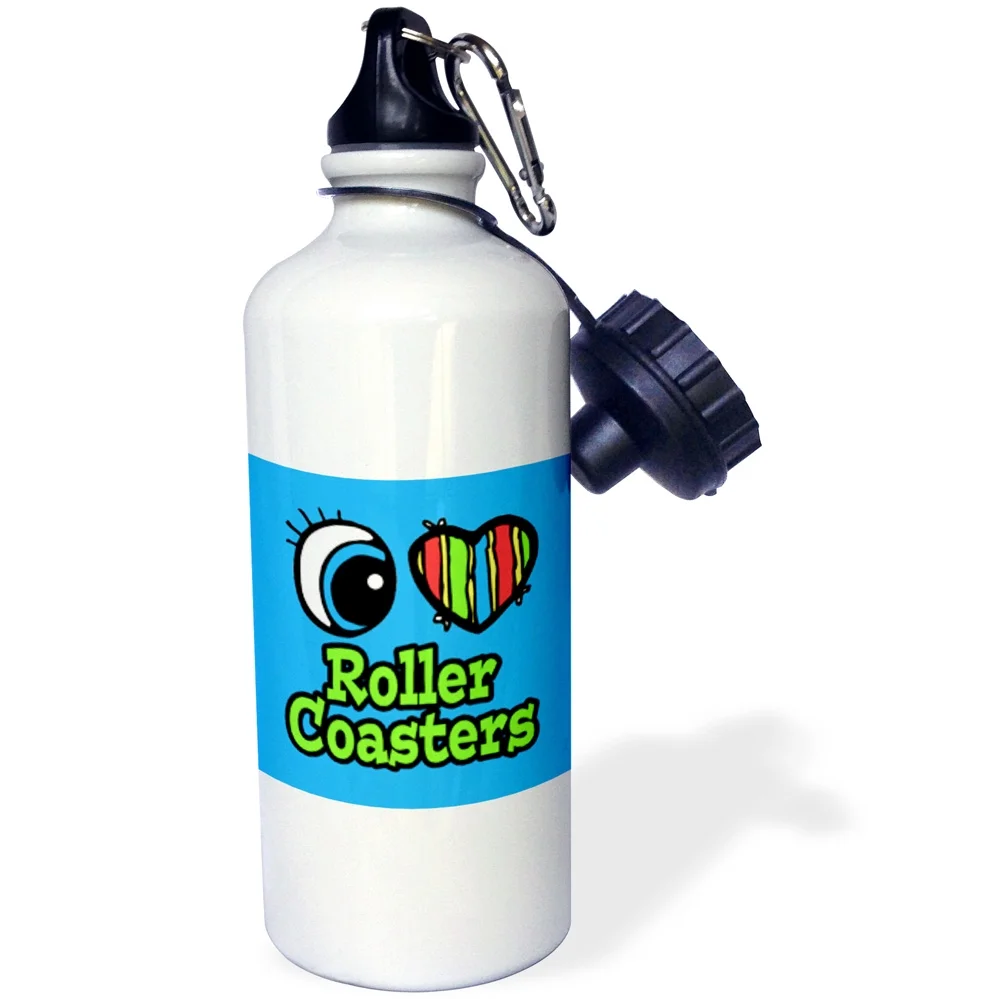 3dRose Bright Eye Heart I Love Roller Coasters, Sports Water Bottle, 21oz