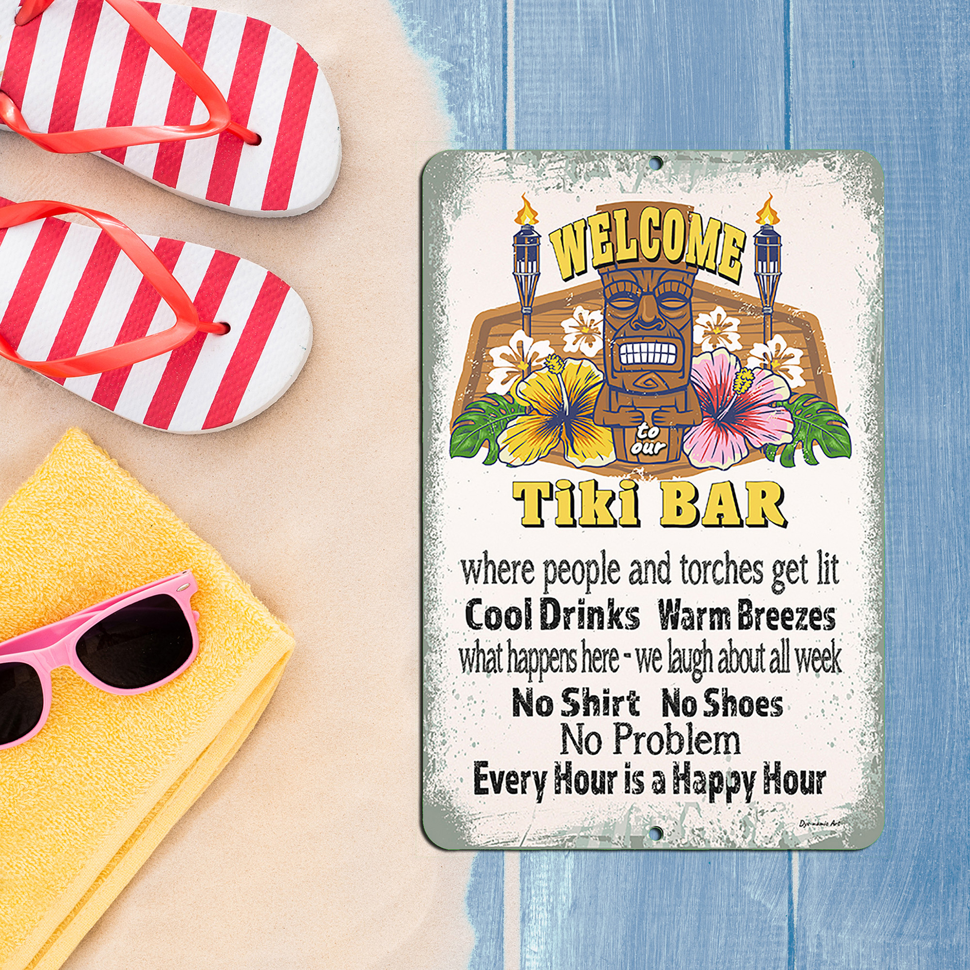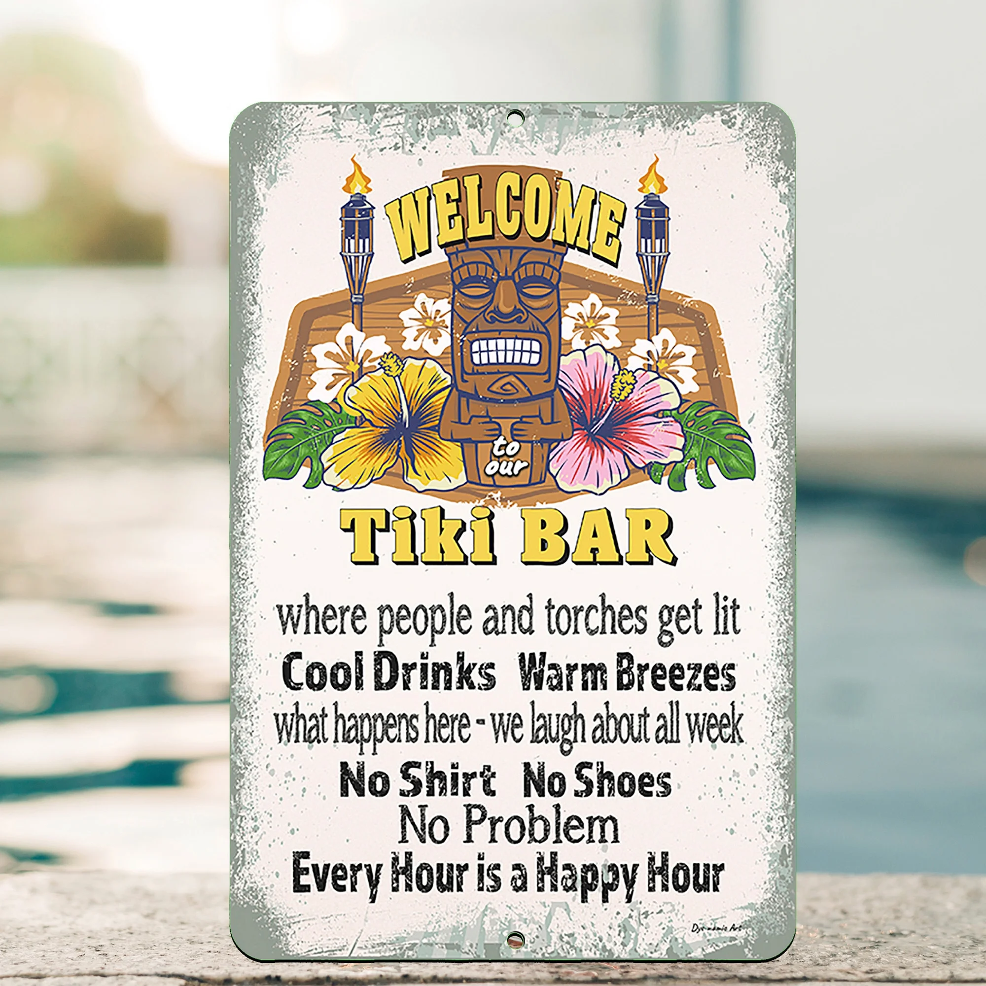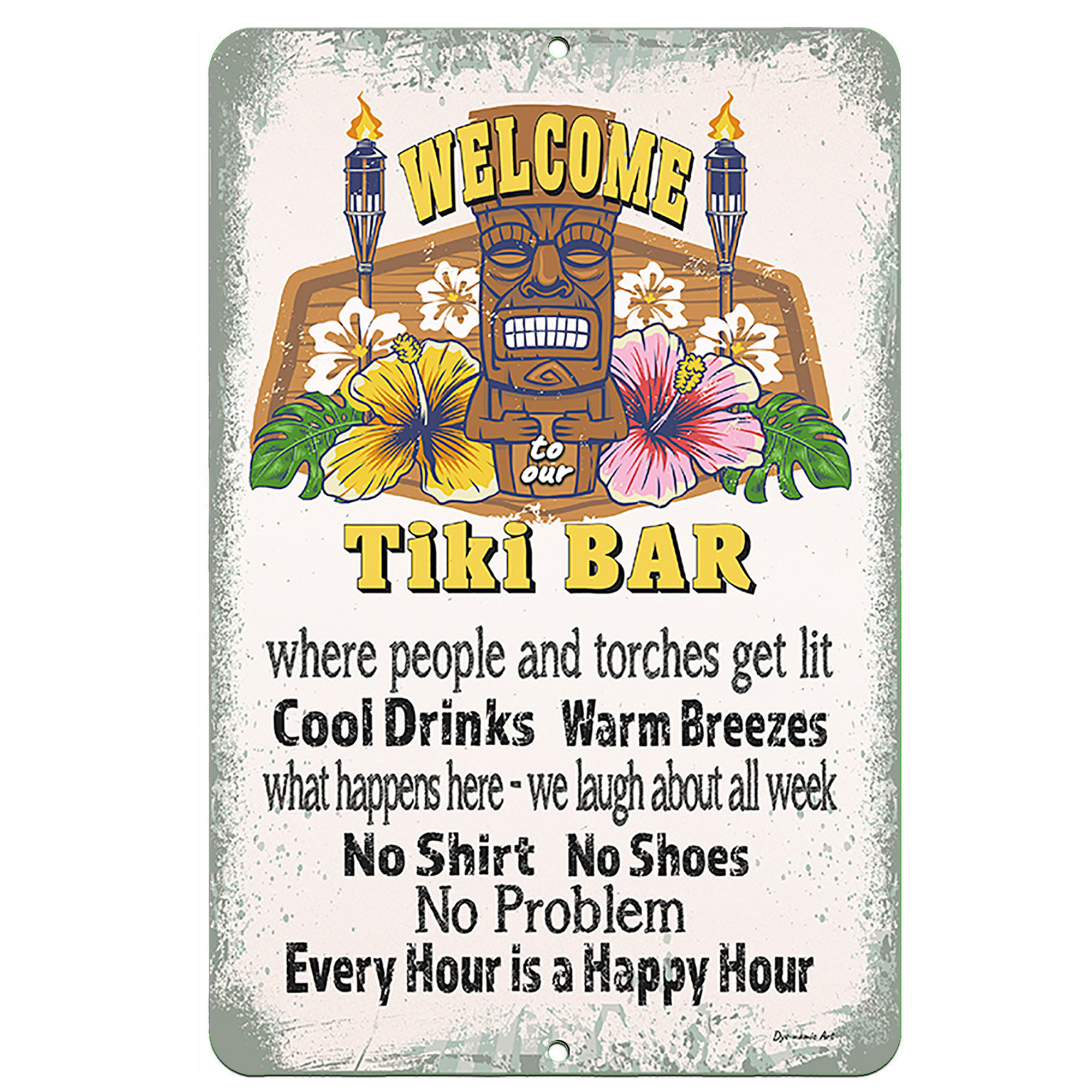 Dyenamic Art Tiki Bar Welcome Metal Sign Luau Themed Decor - Beige - 12"x18"
