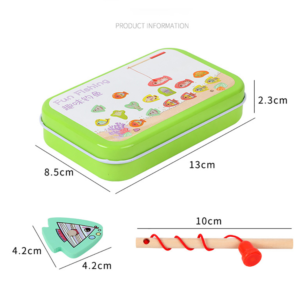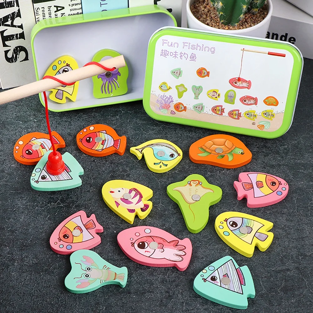 15pcs Set Wooden Magnetic Fishing Toy Baby Cartoon Marine Life Cognitive Fish Game Education Parent-Child Interaction Toy (15 Fish and 1 rod)