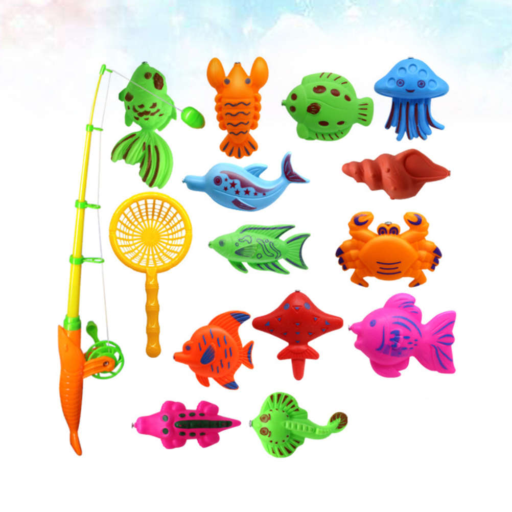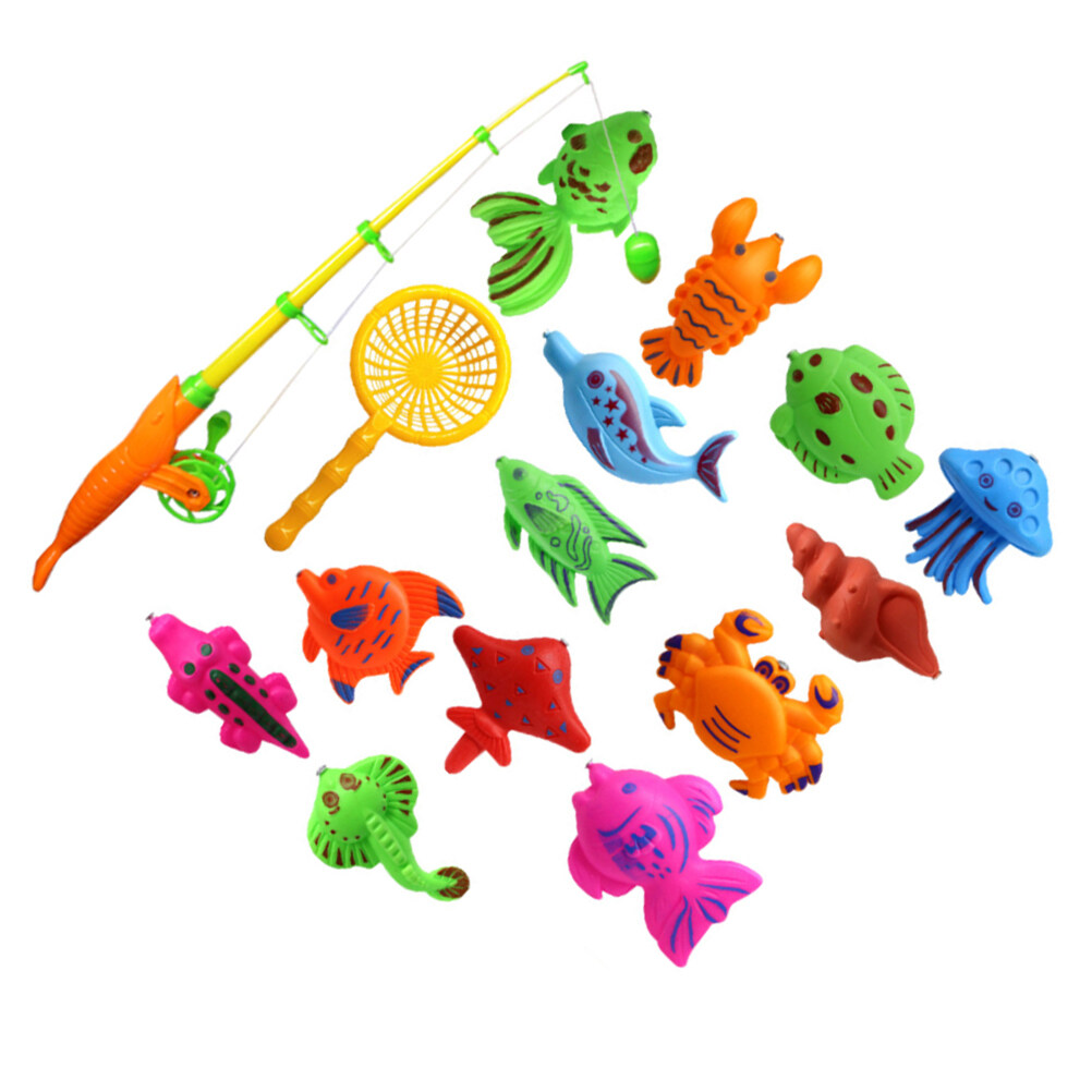 15 Pcs in 1 Set Magnetic Fish Toys Interesting Fishing Game Set Kids Eduational Supplies with Handy Net Cartoon and Fishing Rod for Baby Children (Random Fish Style)