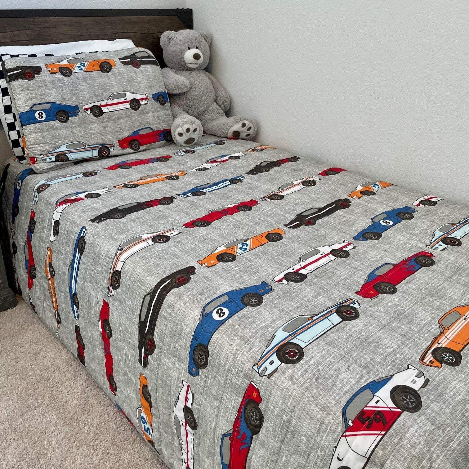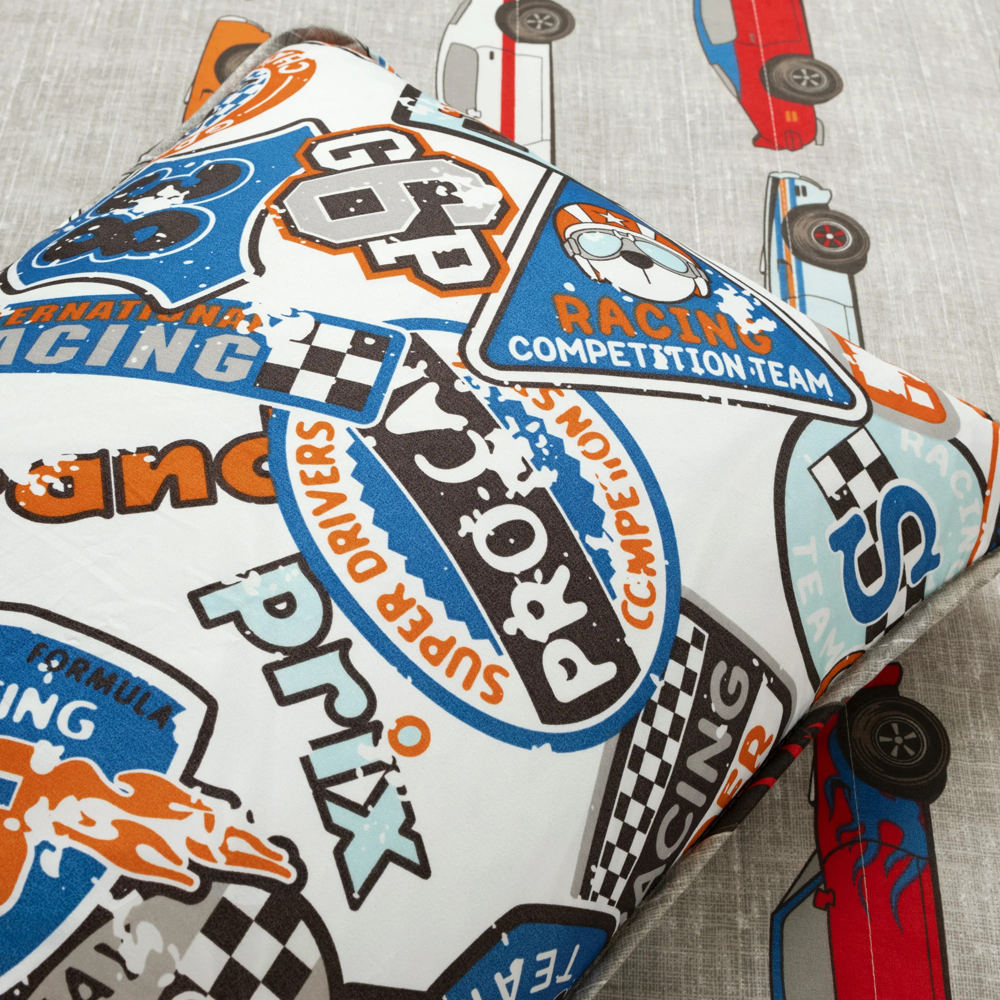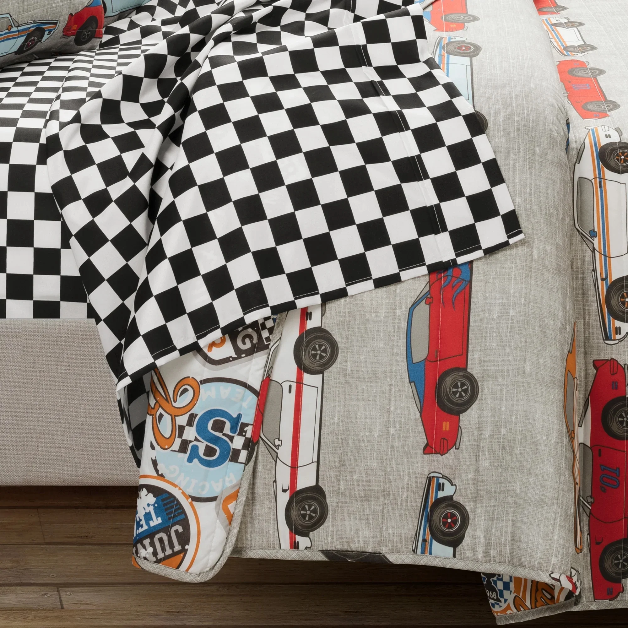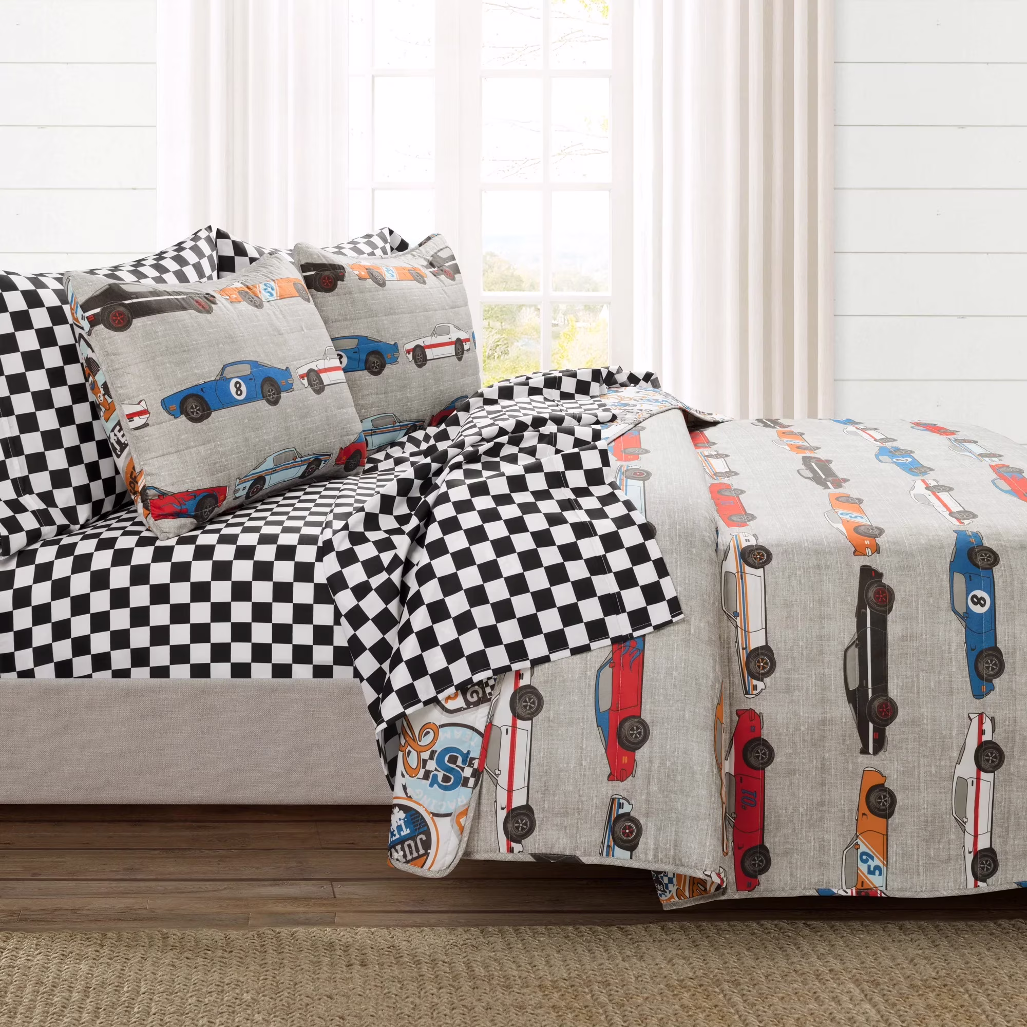 Lush Decor Printed Race Cars Soft Reversible Oversized Quilt Blue/Orange 5Pc Set Twin