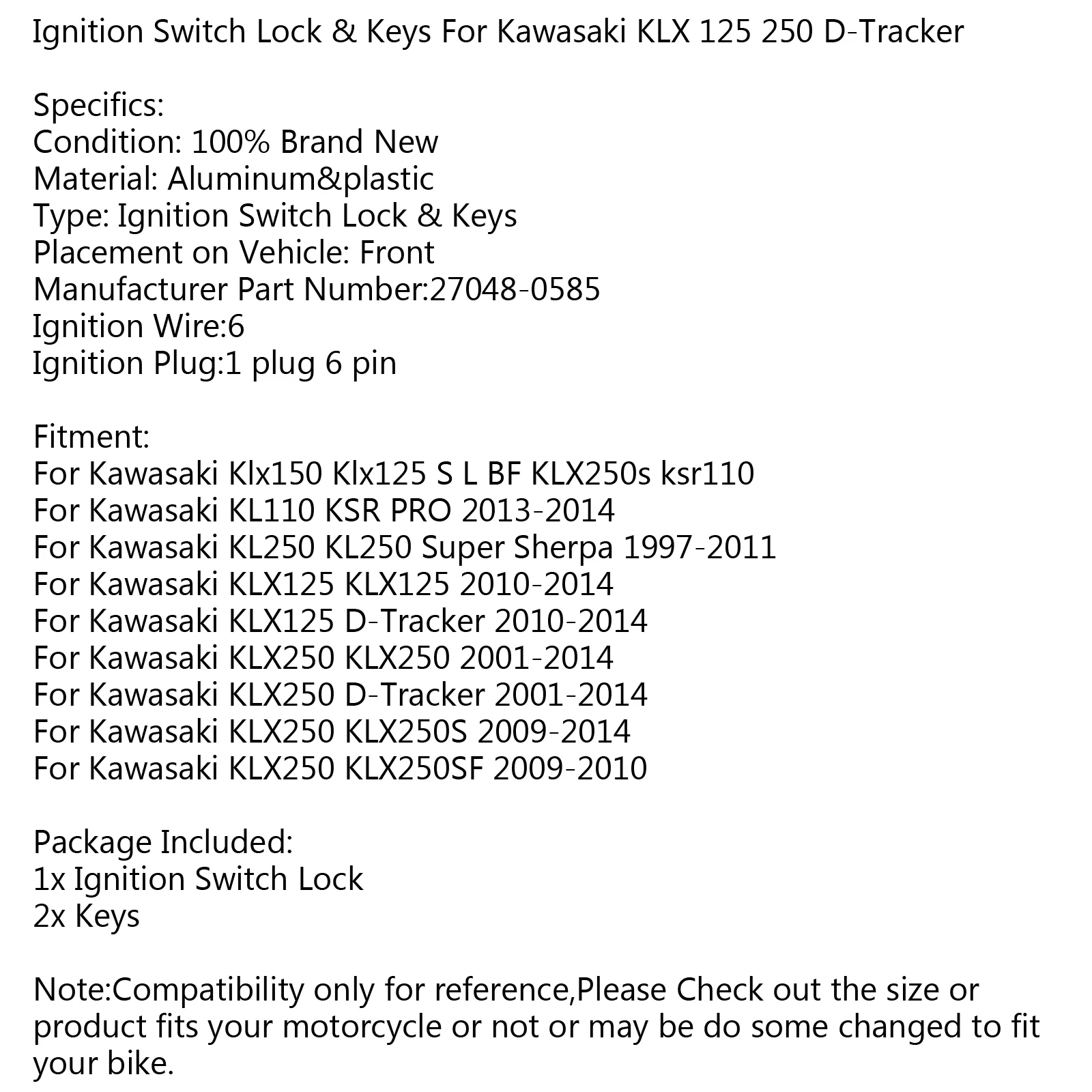 MotorGenic Ignition Switch Lock Keys For Kawasaki KL110 KSR PRO 13-14 KLX250 KLX125