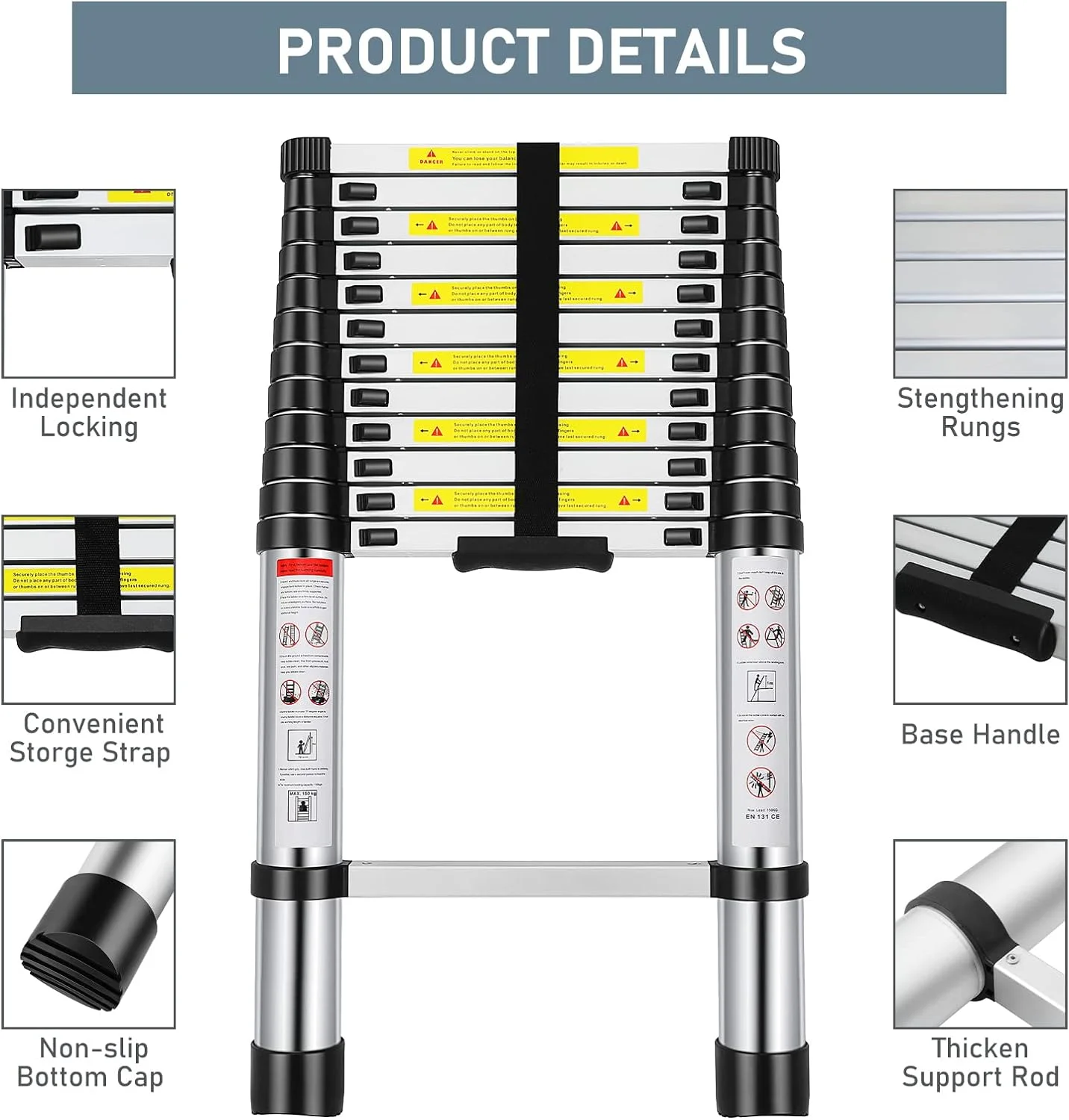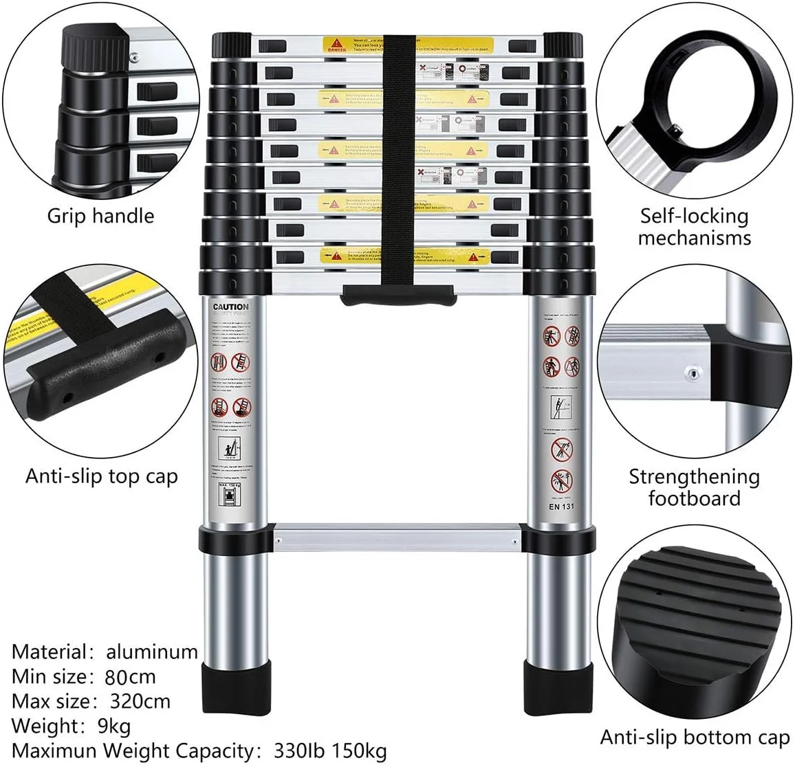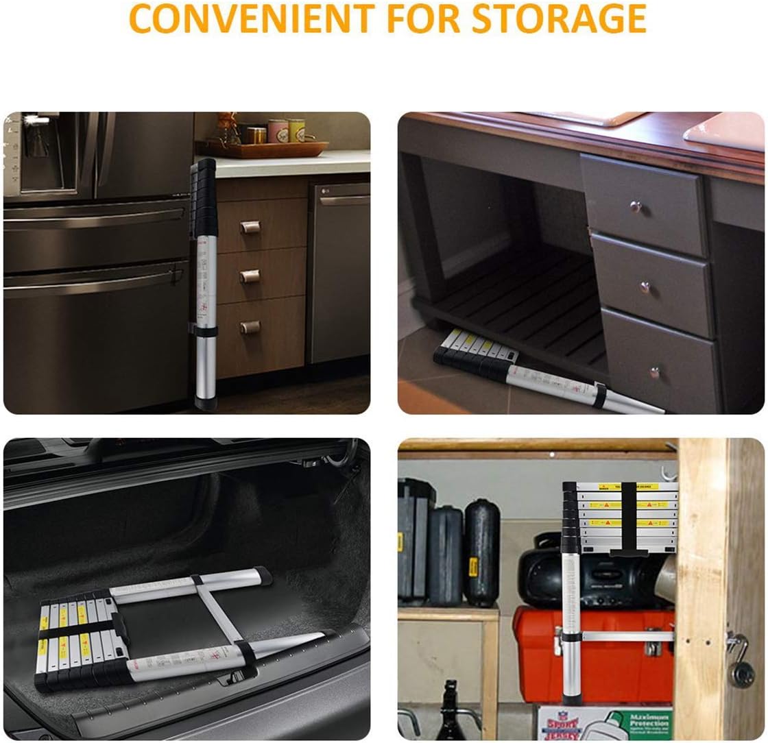 OUWI® 3.2M Portable Aluminium Telescopic Ladder, Foldable and Extendable Extension EN131, Maximum Load 150 kg