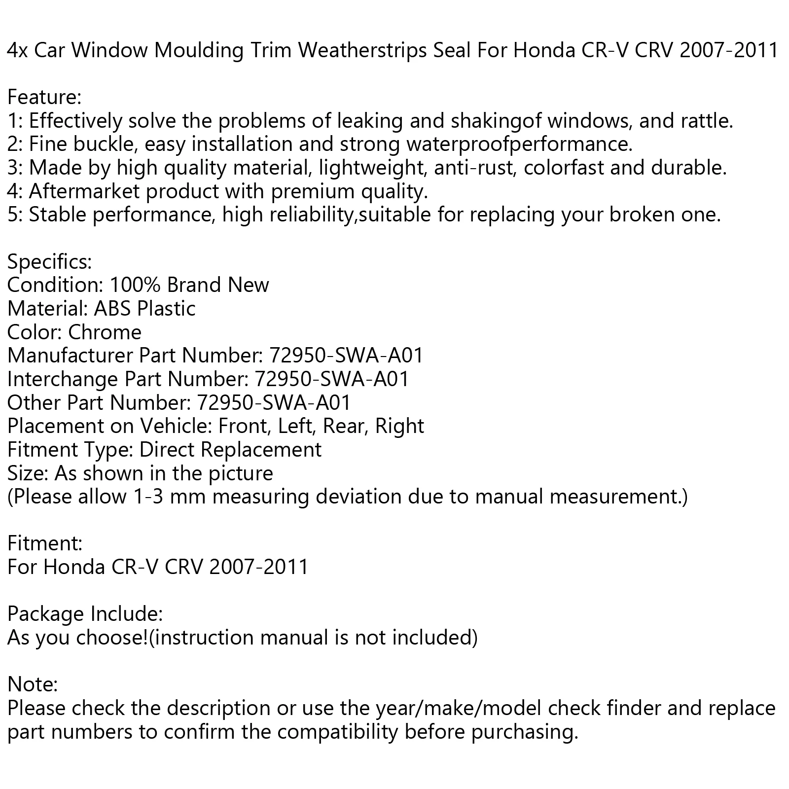 4x Car Window Moulding Trim Weatherstrips Seal For Honda CR-V CRV 2007-2011