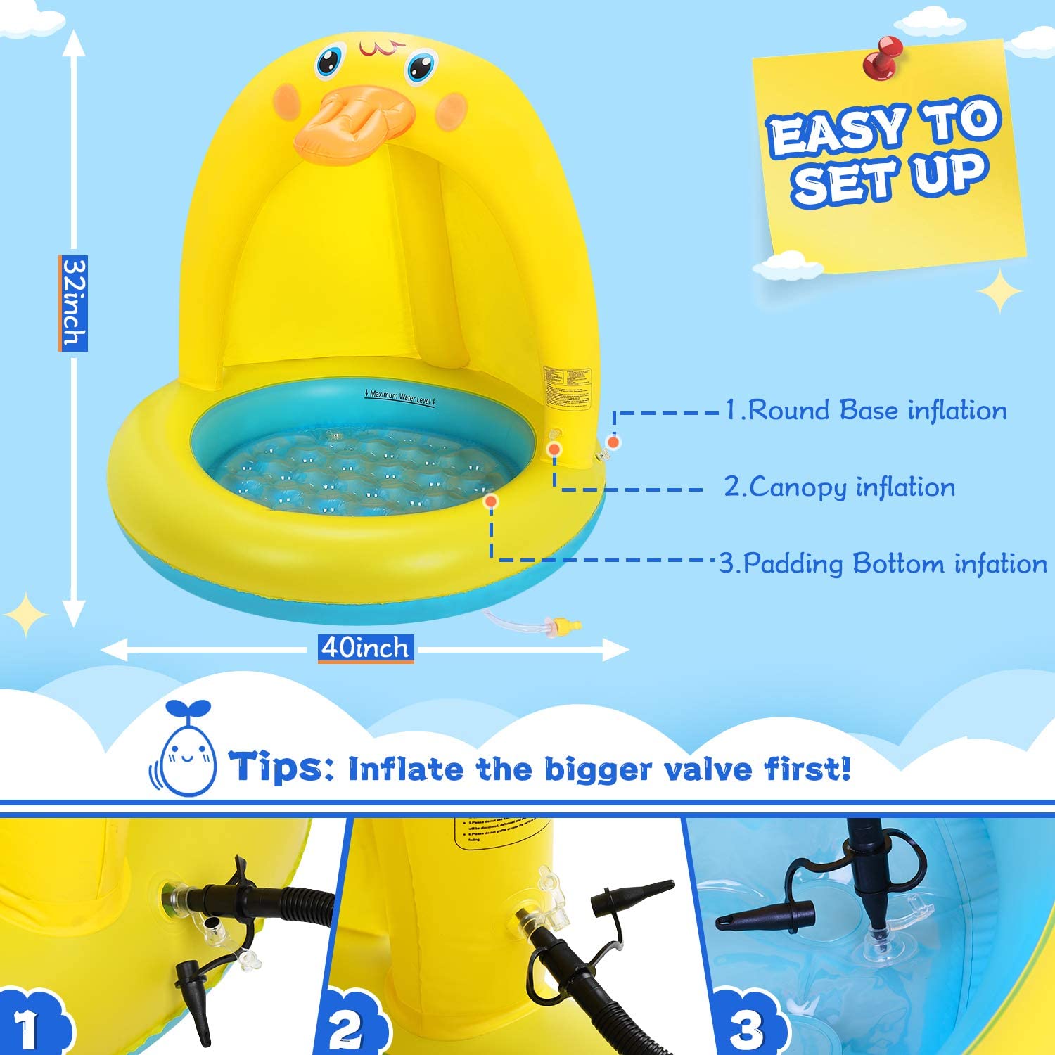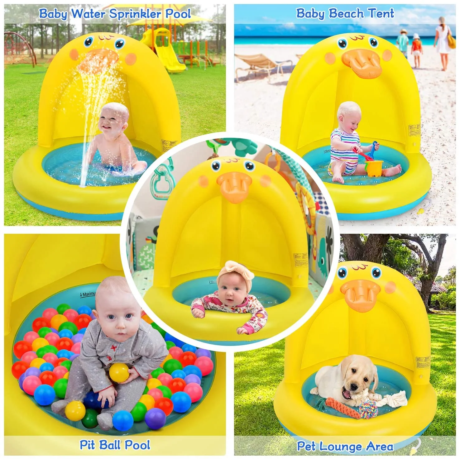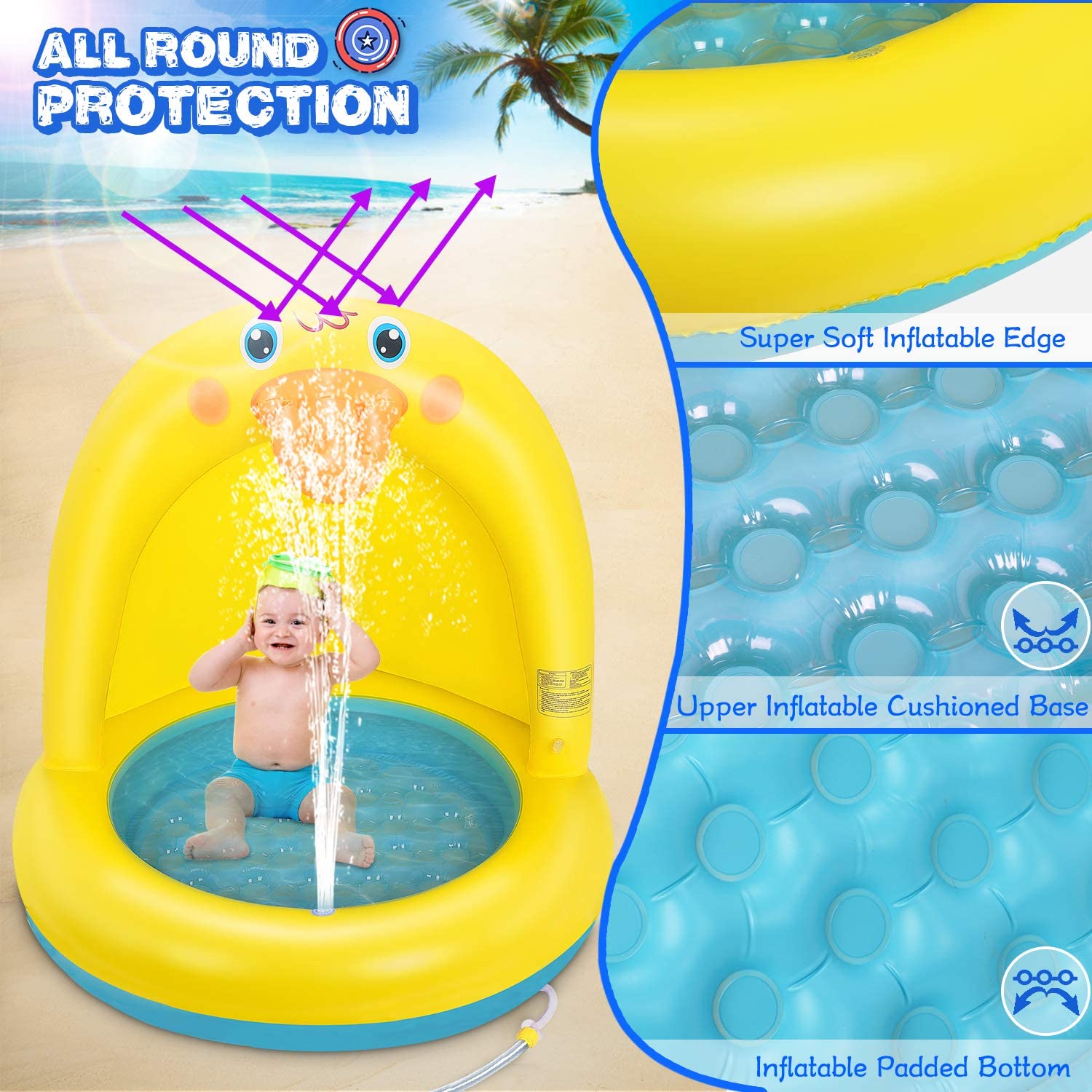 Popolic Inflatable Baby Pool, Duck Baby Splash Pool with Canopy Extra Soft Bubble Base for Kids Toddlers, Spray Water Fun Summer Blow Up Shade Pool for Outdoor and Indoor