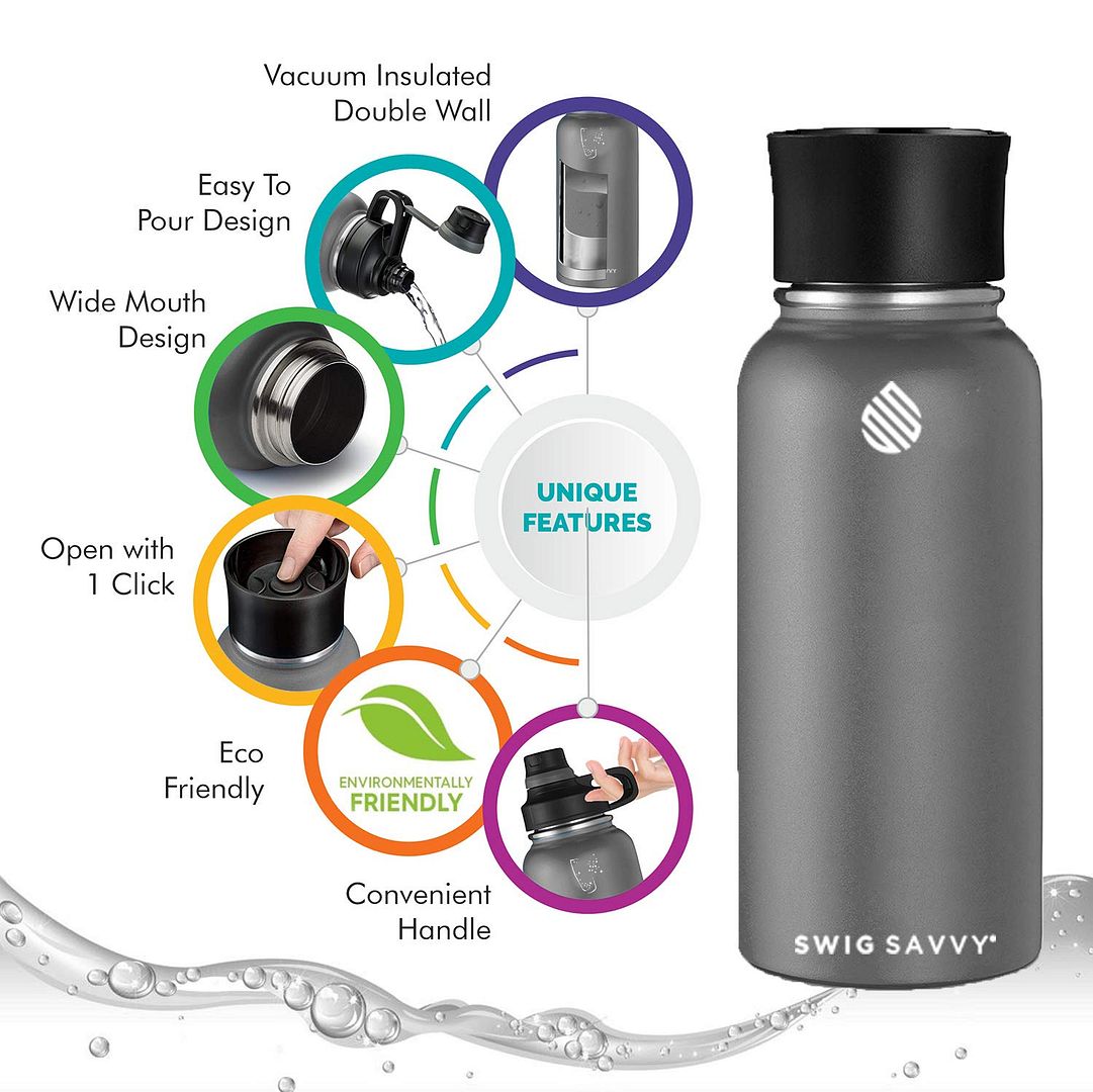 Swig Savvy 30oz Vacuum Insulated Stainless Steel Water Bottle with 2 Leakproof Lids