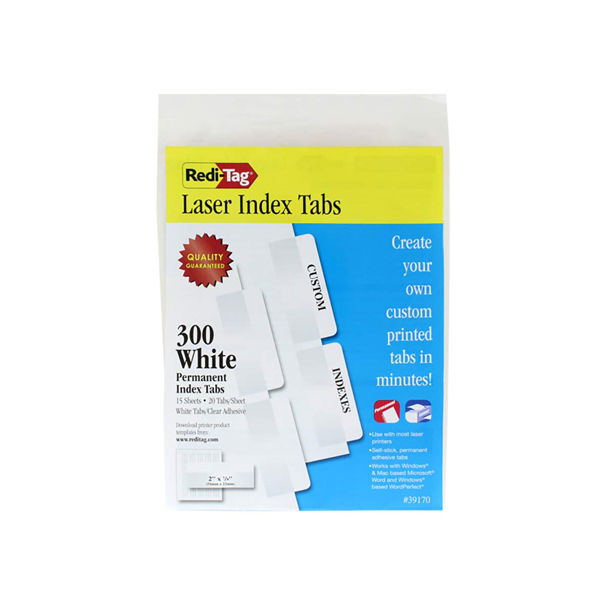 Redi-Tag Laser Printable Index Tabs, 1/5-Cut, White, 2" Wide, 300/Pack 2" x 7/8" - 300 Tabs