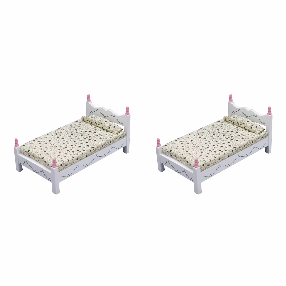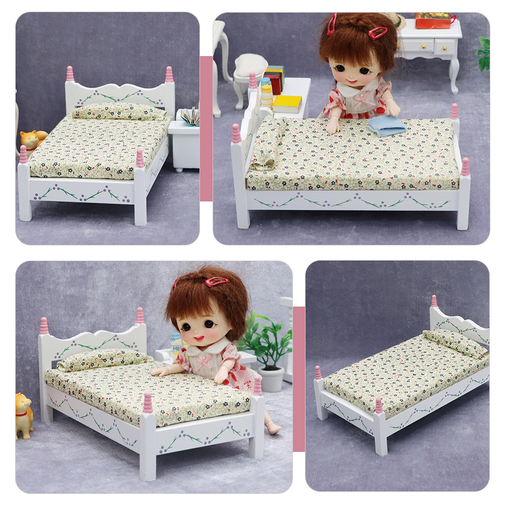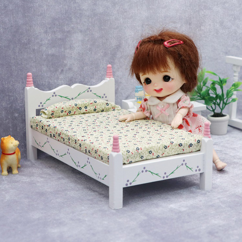 2 Pieces Painted Flower Single Bed Mini Model Doll Dolls Toy Room The White Furniture 18 Inch Micro Scene