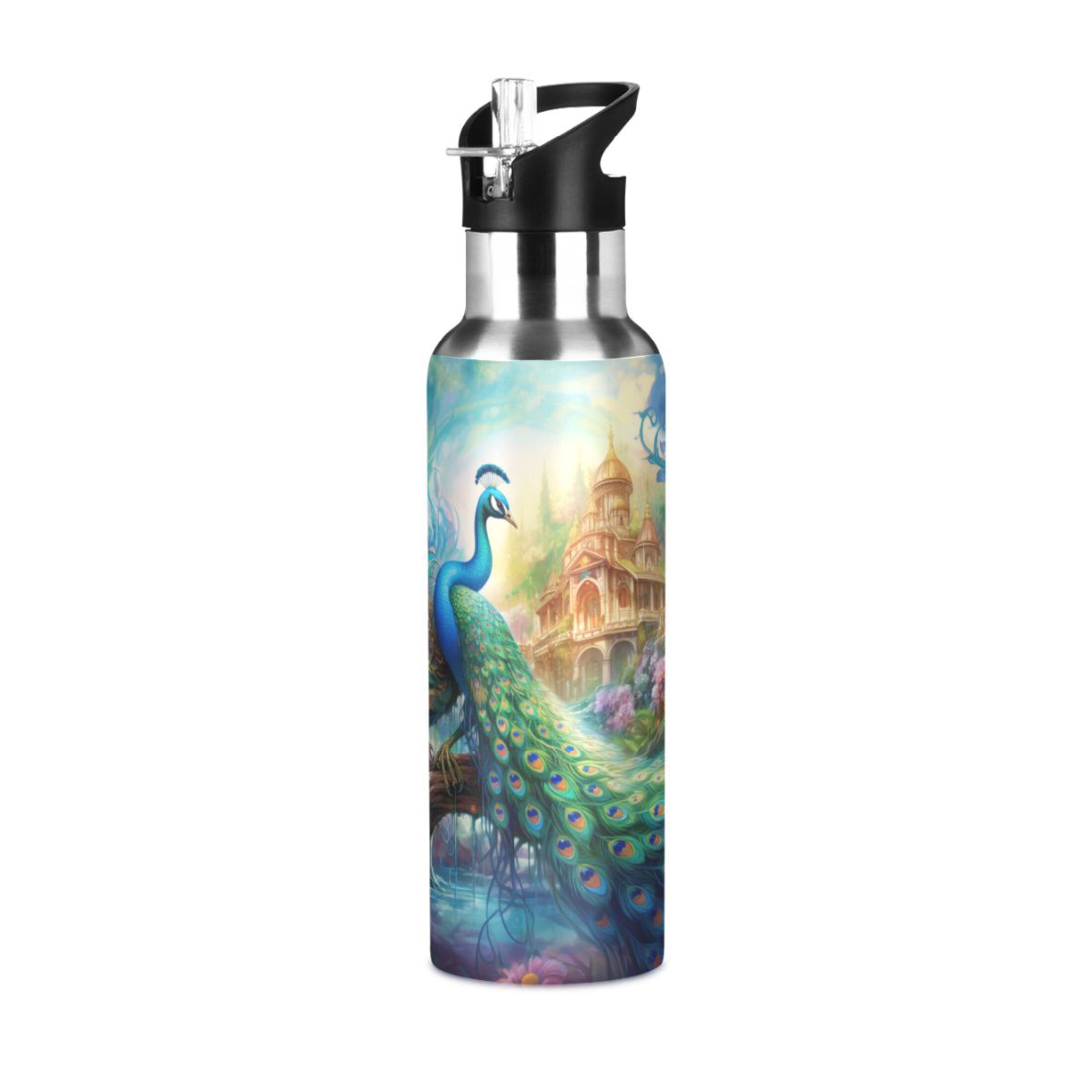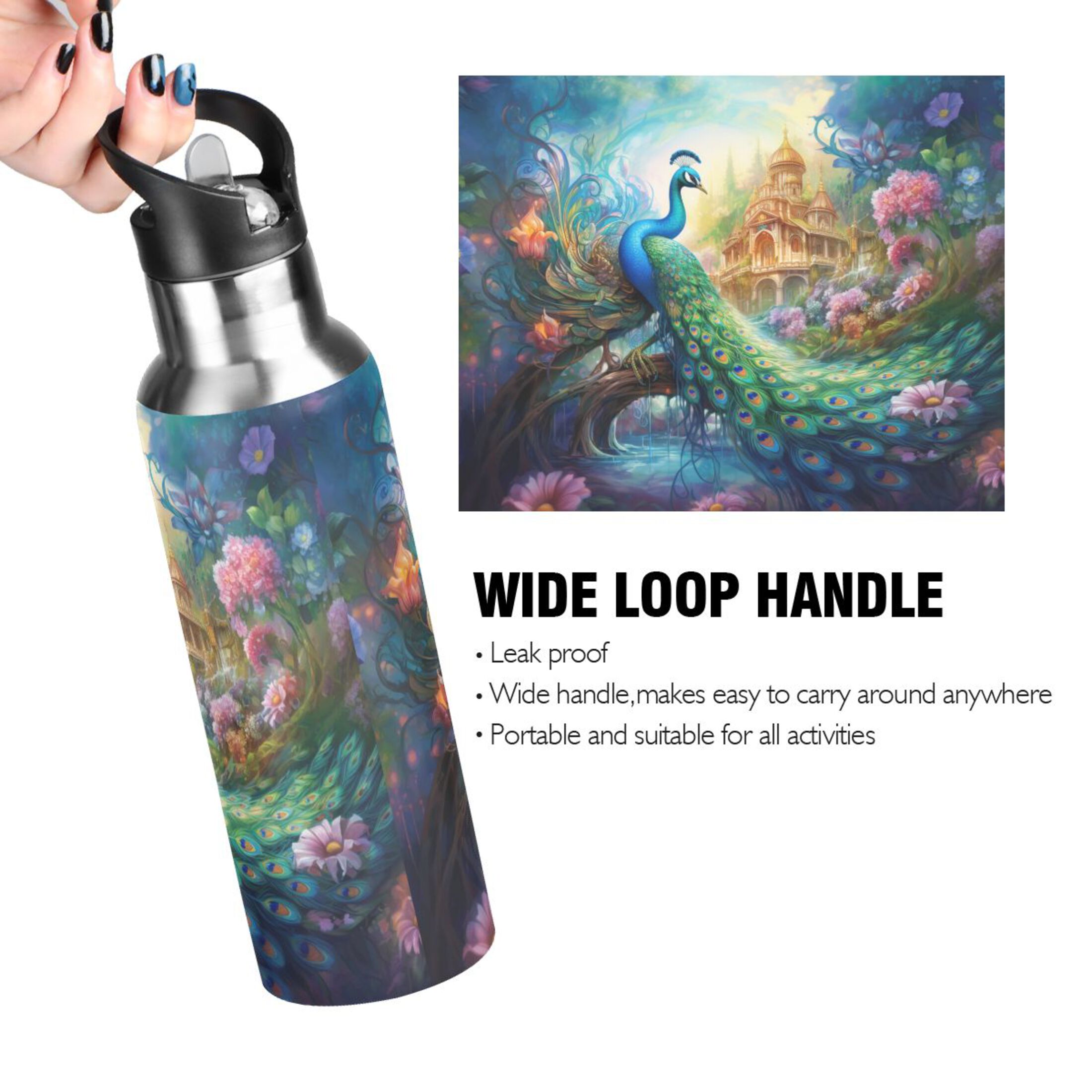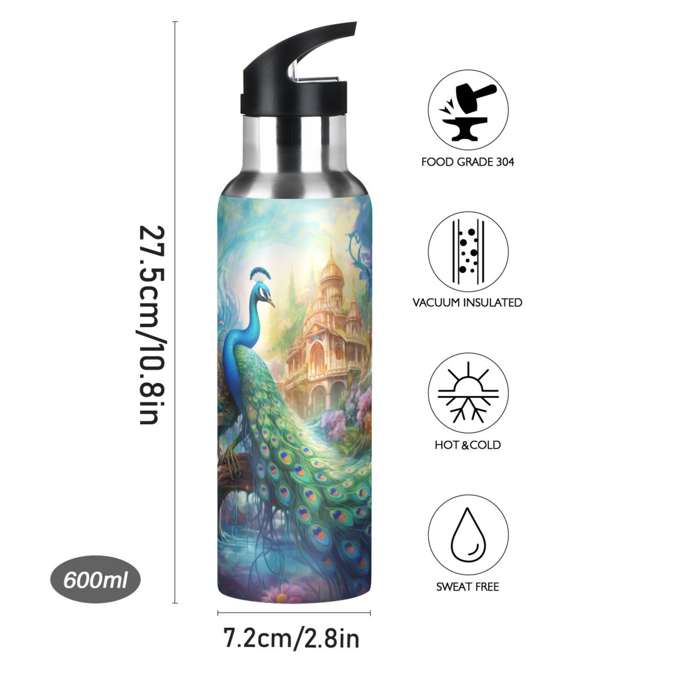 Peacock in Forest Water Bottles Insulated Thermos Kids Stainless Steel Bottle with Straw Lid Flask Leakproof for Sports Gym 20 oz